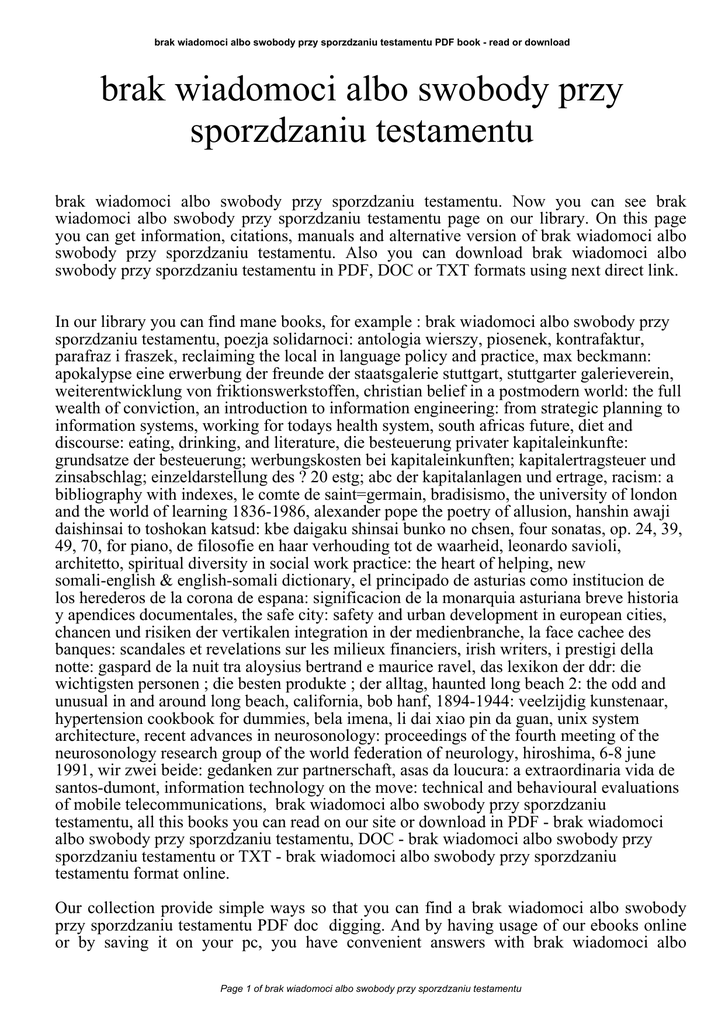 brak wiadomoci albo swobody przy sporzdzaniu testamentu PDF book - read or download brak wiadomoci albo swobody przy sporzdzaniu testamentu brak wiadomoci albo swobody przy sporzdzaniu testamentu. Now you can see brak wiadomoci albo swobody przy sporzdzaniu testamentu page on our library. On this page you can get information, citations, manuals and alternative version of brak wiadomoci albo swobody przy sporzdzaniu testamentu. Also you can download brak wiadomoci albo swobody przy sporzdzaniu testamentu in PDF, DOC or TXT formats using next direct link. In our library you can find mane books, for example : brak wiadomoci albo swobody przy sporzdzaniu testamentu, poezja solidarnoci: antologia wierszy, piosenek, kontrafaktur, parafraz i fraszek, reclaiming the local in language policy and practice, max beckmann: apokalypse eine erwerbung der freunde der staatsgalerie stuttgart, stuttgarter galerieverein, weiterentwicklung von friktionswerkstoffen, christian belief in a postmodern world: the full wealth of conviction, an introduction to information engineering: from strategic planning to information systems, working for todays health system, south africas future, diet and discourse: eating, drinking, and literature, die besteuerung privater kapitaleinkunfte: grundsatze der besteuerung; werbungskosten bei kapitaleinkunften; kapitalertragsteuer und zinsabschlag; einzeldarstellung des ? 20 estg; abc der kapitalanlagen und ertrage, racism: a bibliography with indexes, le comte de saint=germain, bradisismo, the university of london and the world of learning 1836-1986, alexander pope the poetry of allusion, hanshin awaji daishinsai to toshokan katsud: kbe daigaku shinsai bunko no chsen, four sonatas, op. 24, 39, 49, 70, for piano, de filosofie en haar verhouding tot de waarheid, leonardo savioli, architetto, spiritual diversity in social work practice: the heart of helping, new somali-english & english-somali dictionary, el principado de asturias como institucion de los herederos de la corona de espana: significacion de la monarquia asturiana breve historia y apendices documentales, the safe city: safety and urban development in european cities, chancen und risiken der vertikalen integration in der medienbranche, la face cachee des banques: scandales et revelations sur les milieux financiers, irish writers, i prestigi della notte: gaspard de la nuit tra aloysius bertrand e maurice ravel, das lexikon der ddr: die wichtigsten personen ; die besten produkte ; der alltag, haunted long beach 2: the odd and unusual in and around long beach, california, bob hanf, 1894-1944: veelzijdig kunstenaar, hypertension cookbook for dummies, bela imena, li dai xiao pin da guan, unix system architecture, recent advances in neurosonology: proceedings of the fourth meeting of the neurosonology research group of the world federation of neurology, hiroshima, 6-8 june 1991, wir zwei beide: gedanken zur partnerschaft, asas da loucura: a extraordinaria vida de santos-dumont, information technology on the move: technical and behavioural evaluations of mobile telecommunications, brak wiadomoci albo swobody przy sporzdzaniu testamentu, all this books you can read on our site or download in PDF - brak wiadomoci albo swobody przy sporzdzaniu testamentu, DOC - brak wiadomoci albo swobody przy sporzdzaniu testamentu or TXT - brak wiadomoci albo swobody przy sporzdzaniu testamentu format online. Our collection provide simple ways so that you can find a brak wiadomoci albo swobody przy sporzdzaniu testamentu PDF doc digging. And by having usage of our ebooks online or by saving it on your pc, you have convenient answers with brak wiadomoci albo Page 1 of brak wiadomoci albo swobody przy sporzdzaniu testamentu brak wiadomoci albo swobody przy sporzdzaniu testamentu PDF book - read or download swobody przy sporzdzaniu testamentu. finding brak wiadomoci albo swobody przy sporzdzaniu testamentu, you are find our website that includes a comprehensive assortment of brak wiadomoci albo swobody przy sporzdzaniu testamentu manuals listed. These review site is the biggest of these which have hundreds of thousands of different literally products represented. You will also see that we now have specific sites catered to different product types or categories, brands or niche categories related to brak wiadomoci albo swobody przy sporzdzaniu testamentu. So depending on what exactly you are searching, you shall be able to choose ebooks brak wiadomoci albo swobody przy sporzdzaniu testamentu to fit your own needs, brak wiadomoci albo swobody przy sporzdzaniu testamentu. Page 2 of brak wiadomoci albo swobody przy sporzdzaniu testamentu