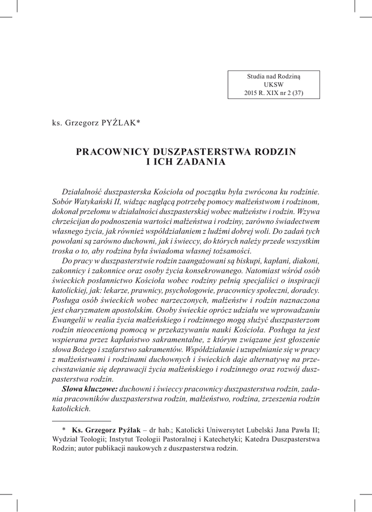 Studia nad Rodziną UKSW 2015 R. XIX nr 2 (37) ks. Grzegorz PYŹLAK* PRACOWNICY DUSZPASTERSTWA RODZIN I ICH ZADANIA Działalność duszpasterska Kościoła od początku była zwrócona ku rodzinie. Sobór Watykański II, widząc naglącą potrzebę pomocy małżeństwom i rodzinom, dokonał przełomu w działalności duszpasterskiej wobec małżeństw i rodzin. Wzywa chrześcijan do podnoszenia wartości małżeństwa i rodziny, zarówno świadectwem własnego życia, jak również współdziałaniem z ludźmi dobrej woli. Do zadań tych powołani są zarówno duchowni, jak i świeccy, do których należy przede wszystkim troska o to, aby rodzina była świadoma własnej tożsamości. Do pracy w duszpasterstwie rodzin zaangażowani są biskupi, kapłani, diakoni, zakonnicy i zakonnice oraz osoby życia konsekrowanego. Natomiast wśród osób świeckich posłannictwo Kościoła wobec rodziny pełnią specjaliści o inspiracji katolickiej, jak: lekarze, prawnicy, psychologowie, pracownicy społeczni, doradcy. Posługa osób świeckich wobec narzeczonych, małżeństw i rodzin naznaczona jest charyzmatem apostolskim. Osoby świeckie oprócz udziału we wprowadzaniu Ewangelii w realia życia małżeńskiego i rodzinnego mogą służyć duszpasterzom rodzin nieocenioną pomocą w przekazywaniu nauki Kościoła. Posługa ta jest wspierana przez kapłaństwo sakramentalne, z którym związane jest głoszenie słowa Bożego i szafarstwo sakramentów. Współdziałanie i uzupełnianie się w pracy z małżeństwami i rodzinami duchownych i świeckich daje alternatywę na przeciwstawianie się deprawacji życia małżeńskiego i rodzinnego oraz rozwój duszpasterstwa rodzin. Słowa kluczowe: duchowni i świeccy pracownicy duszpasterstwa rodzin, zadania pracowników duszpasterstwa rodzin, małżeństwo, rodzina, zrzeszenia rodzin katolickich. * Ks. Grzegorz Pyźlak – dr hab.; Katolicki Uniwersytet Lubelski Jana Pawła II; Wydział Teologii; Instytut Teologii Pastoralnej i Katechetyki; Katedra Duszpasterstwa Rodzin; autor publikacji naukowych z duszpasterstwa rodzin. 68 ks. Grzegorz Pyźlak [2] Wstęp Adhortacja apostolska Familiaris consortio poświęcona zadaniom rodziny chrześcijańskiej w świecie współczesnym wśród najbardziej palących problemów wymienia obowiązek niesienia pomocy małżeństwu i rodzinie. Rodzina zajmuje szczególne miejsce w planach Bożych, gdyż przyszłość ludzkości zależy od rodziny, dlatego należy podjąć każdy wysiłek, by zorganizować i rozwijać duszpasterstwo rodzin (zob. FC 65). Jest to apel, w którym podkreśla się pilną potrzebę duszpasterskiej obecności Kościoła w pracy dla podtrzymania rodziny1. Do pracy w duszpasterstwie rodzin powołani są zarówno duchowni, jak i osoby świeckie. Sobór Watykański II naucza, że „Chrystus Pan dla pasterzowania Ludowi Bożemu (…), ustanowił w Kościele swym rozmaite posługi święte, które mają na celu dobro całego Ciała” (KK 18). A zatem pracownicy duszpasterstwa rodzin mają troszczyć się również o małżeństwa i rodziny, aby zachowały ducha chrześcijańskiego i zmierzały ku doskonałości. Sobór Watykański II w Dekrecie o posłudze i życiu kapłanów naucza, aby w pracy z małżeństwami i rodzinami, duchowni nie pomijali osób świeckich: „Niech prezbiterzy szczerze uznają i popierają godność świeckich i właściwy ich udział w posłannictwie Kościoła” (DK 9). Ojcowie soborowi zachęcają do uznania ich doświadczenia i kompetencji w rożnych dziedzinach ludzkiego działania. Osoby świeckie należy gromadzić, wspierając systematyczną formacją religijną i angażować w niesienie pomocy rodzinom. Jest to szczególnie cenna pomoc na rzecz rodziny (FC 75)2. Ważnym warunkiem stawianym osobom wyrażającym chęć pracy w duszpasterstwie rodzin jest posiadanie przez nie odpowiednich kwalifikacji. Dlatego 1 „Negując bowiem Bożą wizję małżeństwa i rodziny, neguje się ich godność i powołanie. Natomiast ukazując tę wizję oraz przyjmując ją w całej pełni i prawdzie, umożliwia się prawdziwy rozwój ludzki i chrześcijański, a w konsekwencji ratuje się świat przed zagładą”. – Jan Paweł II, Przemówienie do wykładowców i studentów Instytutu ds. Rodziny, 19.12.1981, NP IV/2, s. 512; J. Gucwa, Zadania duszpasterstwa rodzin w świetle adhortacji „Familiaris consortio”, w: Katecheza ewangelizacyjna w rodzinie, parafii, szkole, red. S. Dziekoński, Warszawa 2002, s. 89-105. 2 G. Pyźlak, Formacja świeckich pracowników duszpasterstwa rodzin. Studium z duszpasterstwa rodzin w świetle badań doradców życia rodzinnego i absolwentów diecezjalnych studiów rodziny, Lublin 2013, s. 152-172; T. Syczewski, Pracownicy duszpasterstwa rodzin w nauczaniu Jana Pawła II i Konferencji Episkopatu Polski, „Roczniki Nauk Prawnych” 1:2011, t. 21, s. 217-225. [3] Pracownicy duszpasterstwa rodzin i ich zadania 69 Kościół, przyznając mandat na apostolską działalność w jego imieniu, w postaci misji kanonicznej, ma prawo stawiać konkretne wymagania3. 1. Duchowni pracownicy duszpasterstwa rodzin Wezwanie do pracy w duszpasterstwie rodzin w szczególny sposób dotyczy duchowieństwa, które stanowi zhierarchizowaną wspólnotę złożoną z przyporządkowanych sobie stopni, wyznaczonych zakresem posiadanej władzy kościelnej4. Wśród pracowników odpowiedzialnych za duszpasterstwo rodzin należy wymienić biskupów, kapłanów i diakonów oraz osoby zakonne i konsekrowane (por. FC 73)5. Osobą odpowiedzialną za duszpasterstwo rodzin w diecezji jest biskup. Dlatego też w ramach posługi pasterskiej biskup diecezjalny winien zadbać o powszechne nauczanie wiernych: zasad dotyczących powołania małżeńskiego i rodzinnego, funkcjonowania małżeństwa oraz udziału rodzin w życiu społecznym i posłannictwie Kościoła. Zarówno papież Paweł VI, jak i Jan Paweł II zwracali uwagę na sposób realizacji tej posługi wobec małżeństw i r