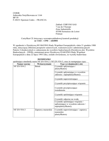 CERIB Jednostka Notyfikowana nr 1164 BP 59 F-28231 Epernon Cedex – FRANCJA Zakład: CHRYSO SAS 7 rue de l’Europe Zone Industrielle 45300 Sermaises du Loiret Francja Certyfikat CE dotyczący wewnątrzzakładowej kontroli produkcji nr 1164 – CPD – ADJ001 W zgodności z Dyrektywą 89/106/EWG Rady Wspólnot Europejskich z dnia 21 grudnia 1988 roku, dotyczącej zbliżenia przepisów ustawowych, wykonawczych i administracyjnych Państw Członkowskich w odniesieniu do wyrobów budowlanych (Dyrektywa dot. Wyrobów Budowlanych – DWB), zmienionej przez Dyrektywę 93/68/EWG Rady Wspólnot Europejskich z dnia 22 lipca 1993 roku, zostało stwierdzone, że wyroby budowlane DOMIESZKI spełniające standardy norm NF EN 934-2 i NF EN 934-3, oraz że następujące typy: Numer normy Wykorzystanie Typ (-y) domieszki (-ek) NF EN 934-2 Beton Czynniki upłynniające / plastyfikatory Czynniki upłynniające w wysokim zakresie / superplastyfikatory Czynniki napowietrzające Czynniki przyśpieszające wiązanie Czynniki przyśpieszające twardnienie Czynniki opóźniające wiązanie Czynniki odporne na wodę Czynniki opóźniające wiązanie / upłynniające w wysokim zakresie / superplastyfikatory NF EN 934-3 Zaprawy murarskie Czynniki napowietrzające / zaprawy murarskie plastyfikatory są wytwarzane przez producenta wskazanego powyżej w wyżej wspomnianym zakładzie. Zaświadczono także, że wyroby te dostarczane są przez producenta do wstępnego badania typu wyrobów oraz wewnątrzzakładowej kontroli produkcji, oraz że zatwierdzona jednostka CERIB (Nr ident.: 1164) wykonała wstępną inspekcję zakładu oraz wewnątrzzakładową kontrolę produkcji, a także utrzymuje stały nadzór, ocenę oraz zatwierdzanie wewnątrzzakładowej kontroli produkcji. Niniejszy certyfikat zaświadcza, że zastosowane zostały wszelkie przepisy dotyczące zaświadczeń wewnątrzzakładowej kontroli produkcji, opisane w Załączniku Z.A standardów NF EN 934-2 oraz NF EN 934-3. Zaświadczenie zostało po raz pierwszy wydane 30 października 2002 roku i unieważnia oraz zastępuje ono wznowione zaświadczenie z dnia 27 lutego 2006 roku. Pozostaje ono ważne tak długo, jak długo warunki określone w zharmonizowanej specyfikacji technicznej lub też warunki produkcji w zakładzie lub też sama wewnątrzzakładowa kontrola produkcji nie zostaną w znacznym stopniu zmienione lub też najpóźniej do dnia 27 lutego 2012 roku. Epernon, 27 lutego 2009 roku Wersja nr 3 Gilles BERNARDEAU Kierownik Oddziału ds. Jakości Przemysłowej Informacja o tym, że dokument został przetłumaczony na j. angielski z j. francuskiego.