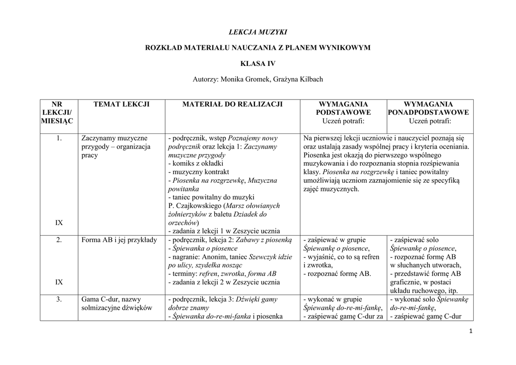 LEKCJA MUZYKI ROZKŁAD MATERIAŁU NAUCZANIA Z PLANEM WYNIKOWYM KLASA IV Autorzy: Monika Gromek, Grażyna Kilbach NR LEKCJI/ MIESIĄC 1. TEMAT LEKCJI Zaczynamy muzyczne przygody – organizacja pracy IX 2. Forma AB i jej przykłady IX 3. Gama C-dur, nazwy solmizacyjne dźwięków MATERIAŁ DO REALIZACJI - podręcznik, wstęp Poznajemy nowy podręcznik oraz lekcja 1: Zaczynamy muzyczne przygody - komiks z okładki - muzyczny kontrakt - Piosenka na rozgrzewkę, Muzyczna powitanka - taniec powitalny do muzyki P. Czajkowskiego (Marsz ołowianych żołnierzyków z baletu Dziadek do orzechów) - zadania z lekcji 1 w Zeszycie ucznia - podręcznik, lekcja 2: Zabawy z piosenką - Śpiewanka o piosence - nagranie: Anonim, taniec Szewczyk idzie po ulicy, szydełka nosząc - terminy: refren, zwrotka, forma AB - zadania z lekcji 2 w Zeszycie ucznia - podręcznik, lekcja 3: Dźwięki gamy dobrze znamy - Śpiewanka do-re-mi-fanka i piosenka WYMAGANIA PODSTAWOWE Uczeń potrafi: WYMAGANIA PONADPODSTAWOWE Uczeń potrafi: Na pierwszej lekcji uczniowie i nauczyciel poznają się oraz ustalają zasady wspólnej pracy i kryteria oceniania. Piosenka jest okazją do pierwszego wspólnego muzykowania i do rozpoznania stopnia rozśpiewania klasy. Piosenka na rozgrzewkę i taniec powitalny umożliwiają uczniom zaznajomienie się ze specyfiką zajęć muzycznych. - zaśpiewać w grupie Śpiewankę o piosence, - wyjaśnić, co to są refren i zwrotka, - rozpoznać formę AB. - zaśpiewać solo Śpiewankę o piosence, - rozpoznać formę AB w słuchanych utworach, - przedstawić formę AB graficznie, w postaci układu ruchowego, itp. - wykonać w grupie - wykonać solo Śpiewankę Śpiewankę do-re-mi-fankę, do-re-mi-fankę, - zaśpiewać gamę C-dur za - zaśpiewać gamę C-dur 1 Jawor - zabawa z piosenką Jawor - fonogestyka - terminy: gama, solmizacja - zadania z lekcji 3 w Zeszycie ucznia IX 4. Nazwy literowe dźwięków IX 5. Muzyczny remanent, czyli utrwalenie wiadomości Chwyty h1, a1, g1 na flecie podłużnym X 6. Emisja głosu i dykcja Piosenka Czternastego października - podręcznik, lekcja 4: Muzyczne litery - Klawiszowa piosenka - zapis nutowy gamy C-dur – do zagrania na dzwonkach - nagranie: W.A. Mozart, Bułeczka z masłem - zadania z lekcji 4 w Zeszycie ucznia - podręcznik, lekcja 5: Warsztat muzyczny - nagranie: A. Vivaldi: część I Koncertu skrzypcowego „Jesień” z cyklu Cztery pory roku - zadania utrwalające wiadomości i umiejętności - schematy chwytów fletowych: h1, a1, g1 - zadania z lekcji 5 w Zeszycie ucznia - podręcznik, kartka z kalendarza Andrzejki z komiksem (s. 22–23) oraz lekcja 6: Śpiewajmy pięknie dla naszych nauczycieli - piosenka Czternastego października - ćwiczenia z zakresu emisji głosu - schematy chwytów fletowych: f1, e1 - zapis nutowy melodii na flet - terminy: emisja głosu, dykcja - zadania z lekcji 6 w Zeszycie ucznia X 7. Zagadnienia rytmiczne - podręcznik, lekcja 7: Z rytmem za pan pomocą solmizacji, - wyjaśnić, do czego służy fonogestyka, - zaśpiewać piosenkę Jawor, - wytłumaczyć, co to są gama i solmizacja. - zaśpiewać w grupie Klawiszową piosenkę, - zagrać na dzwonkach gamę C-dur. z zastosowaniem fonogestyki. - wykonać solo Klawiszową piosenkę, - zaśpiewać gamę C-dur za pomocą nazw literowych. Lekcja służy powtórzeniu i utrwaleniu wiadomości i umiejętności (lekcje 1–4) za pomocą zadań, zabaw i ćwiczeń. Jedynym nowym elementem jest nauka gry na flecie, z którą wiąże się wymaganie podstawowe – zagranie na flecie poznanych dźwięków: h1, a1, g1. - zaśpiewać w grupie piosenkę Czternastego października, - wyjaśnić, co to są emisja głosu i dykcja, - wykonać ćwiczenia dykcji i emisji głosu, - zagrać na flecie poznane dźwięki: f1, e1, - wykonać utwór na flecie w grupie. - zaśpiewać w grupie - zaśpiewać solo piosenkę Czternastego października, - zastosować zasady prawidłowej emisji głosu podczas śpiewu, - zagrać solo utwór na flecie. - zaśpiewać solo piosenkę 2 Realizacja rytmów z wykorzystaniem tataizacji i gestodźwięków brat - piosenka Poczuj rytm - schemat wartości rytmicznych nut i pauz - partytura do zabaw z piosenką - terminy: rytm, tataizacja, gestodźwięki - zadania z lekcji 7 w Zeszycie ucznia piosenkę Poczuj rytm, - wyjaśnić znaczenie terminów: rytm, tataizacja, gestodźwięki, - rozpoznawać i nazywać określone wartości rytmiczne nut i pauz. - podręcznik, lekcja 8: Metrum, czyli miara - piosenka Niezła sztuczka - nagrania: P. Czajkowski, Pas de quatre z baletu Dziadek do orzechów, C. SaintSaëns, Słoń z cyklu Karnawał zwierząt - zapis nutowy utworu Chińska melodia - terminy: metrum, akcent, takt, znaki chromatyczne (krzyżyk, bemol, kasownik) - zadania z lekcji 8 w Zeszycie ucznia - zaśpiewać w grupie piosenkę Niezła sztuczka, - wyjaśnić znaczenie terminów: metrum, akcent, takt, - zagrać na flecie w grupie Chińską melodię, - wytłumaczyć, do czego służą znaki chromatyczne. - podręcznik, lekcja 9: „Symbole narodowe i „Mazurek Dąbrowskiego” - polski hymn państwowy - schemat – kropka przy nucie - infografika: Polskie symbole narodowe - terminy: hymn, kropka przy nucie - zadania z lekcji 9 w Zeszycie ucznia - podręcznik, lekcja 10: Gdy piosenka szła z wojskiem - piosenka Przybyli ułani - partytura – akompaniament perkusyjny - nagranie: Bolesław Szulia, marsz wojskowy W Dzień Podchorążego - zaśpiewać z pamięci dwie pierwsze zwrotki Mazurka Dąbrowskiego, - wytłumaczyć, co to jest hymn, - wyjaśnić znaczenie kropki przy nucie. - zaśpiewać w grupie piosenkę Przybyli ułani pod okienko, - wykonać w grupie akompaniament do piosenki, X 8 Metrum utworu muzycznego Znaki chromatyczne X 9. Polskie symbole narodowe – Mazurek Dąbrowskiego Kropka przy nucie XI 10. Muzyka wojskowa – piosenki ułańskie Musztra paradna Poczuj rytm, - wykonać samodzielnie rapowaną część piosenki, - zrealizować poszczególne głos