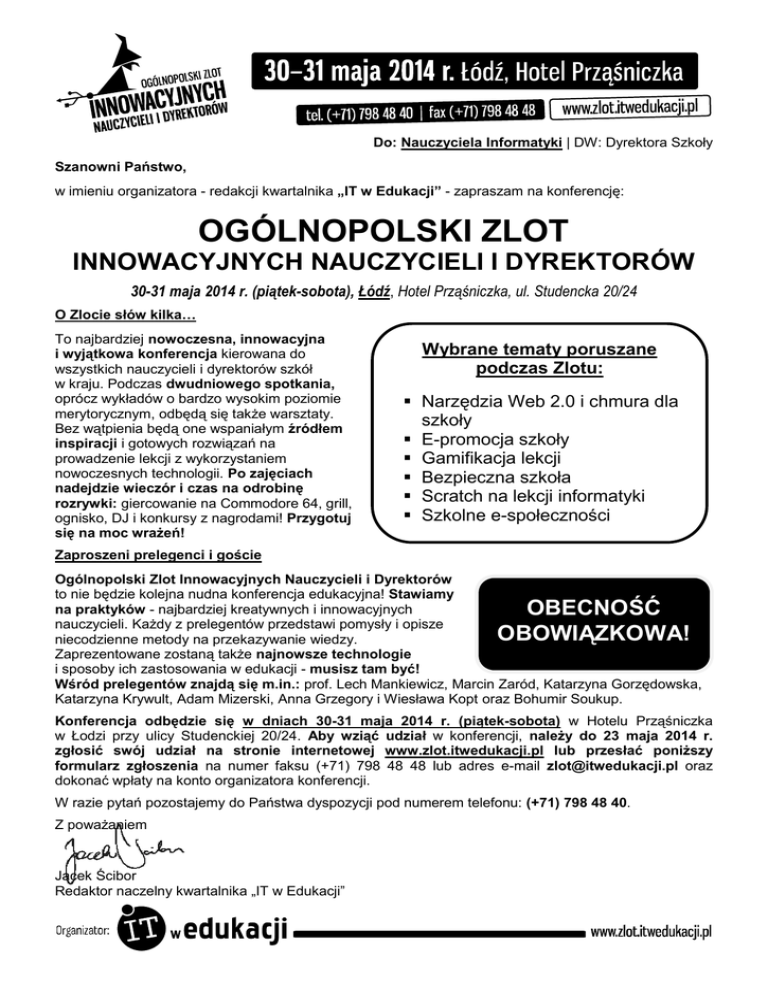 Do: Nauczyciela Informatyki | DW: Dyrektora Szkoły Szanowni Państwo, w imieniu organizatora - redakcji kwartalnika „IT w Edukacji” - zapraszam na konferencję: OGÓLNOPOLSKI ZLOT INNOWACYJNYCH NAUCZYCIELI I DYREKTORÓW 30-31 maja 2014 r. (piątek-sobota), Łódź, Hotel Prząśniczka, ul. Studencka 20/24 O Zlocie słów kilka… To najbardziej nowoczesna, innowacyjna i wyjątkowa konferencja kierowana do wszystkich nauczycieli i dyrektorów szkół w kraju. Podczas dwudniowego spotkania, oprócz wykładów o bardzo wysokim poziomie merytorycznym, odbędą się także warsztaty. Bez wątpienia będą one wspaniałym źródłem inspiracji i gotowych rozwiązań na prowadzenie lekcji z wykorzystaniem nowoczesnych technologii. Po zajęciach nadejdzie wieczór i czas na odrobinę rozrywki: giercowanie na Commodore 64, grill, ognisko, DJ i konkursy z nagrodami! Przygotuj się na moc wrażeń! Wybrane tematy poruszane podczas Zlotu: Narzędzia Web 2.0 i chmura dla szkoły E-promocja szkoły Gamifikacja lekcji Bezpieczna szkoła Scratch na lekcji informatyki Szkolne e-społeczności Odwrócona klasa Zaproszeni prelegenci i goście Ogólnopolski Zlot Innowacyjnych Nauczycieli i Dyrektorów to nie będzie kolejna nudna konferencja edukacyjna! Stawiamy na praktyków - najbardziej kreatywnych i innowacyjnych nauczycieli. Każdy z prelegentów przedstawi pomysły i opisze niecodzienne metody na przekazywanie wiedzy. Zaprezentowane zostaną także najnowsze technologie i sposoby ich zastosowania w edukacji - musisz tam być! Wśród prelegentów znajdą się m.in.: prof. Lech Mankiewicz, Marcin Zaród, Katarzyna Gorzędowska, Katarzyna Krywult, Adam Mizerski, Anna Grzegory i Wiesława Kopt oraz Bohumir Soukup. OBECNOŚĆ OBOWIĄZKOWA! Konferencja odbędzie się w dniach 30-31 maja 2014 r. (piątek-sobota) w Hotelu Prząśniczka w Łodzi przy ulicy Studenckiej 20/24. Aby wziąć udział w konferencji, należy do 23 maja 2014 r. zgłosić swój udział na stronie internetowej www.zlot.itwedukacji.pl lub przesłać poniższy formularz zgłoszenia na numer faksu (+71) 798 48 48 lub adres e-mail [email protected] oraz dokonać wpłaty na konto organizatora konferencji. W razie pytań pozostajemy do Państwa dyspozycji pod numerem telefonu: (+71) 798 48 40. Z poważaniem Jacek Ścibor Redaktor naczelny kwartalnika „IT w Edukacji” FORMULARZ ZGŁOSZENIA OGÓLNOPOLSKI ZLOT INNOWACYJNYCH NAUCZYCIELI I DYREKTORÓW 30-31 maja 2014 r. (piątek-sobota), Łódź, Hotel Prząśniczka, ul. Studencka 20/24 Wypełniony formularz zgłoszenia prosimy przesyłać na numer faksu: (+71) 798 48 48, e-mail: [email protected] lub online: zlot.itwedukacji.pl 1. Imię i nazwisko Stanowisko Nr karty rabatowej 2. Telefon E-mail (na który zostanie wysłane potwierdzenie udziału) Imię i nazwisko Stanowisko Nr karty rabatowej Kwota Telefon E-mail (na który zostanie wysłane potwierdzenie udziału) Kwota Suma kwot RAZEM Koszt uczestnictwa 1 osoby w Zlocie przy zgłoszeniach nadesłanych do 23 maja 2014 r. wynosi 290 zł i obejmuje: materiały konferencyjne, pełne wyżywienie, zakwaterowanie (dopłata do pokoju 1-osobowego wynosi 150 zł - liczba pokoi ograniczona) oraz imienny certyfikat uczestnictwa w zlocie. Przy zgłoszeniach nadesłanych po ww. terminie koszt uczestnictwa jednej osoby wynosi 390 zł. Liczba miejsc ograniczona. Do podanych cen nie doliczamy podatku VAT w przypadku podpisania niniejszego oświadczenia, tzn. kiedy uczestnictwo w szkoleniu jest finansowane w co najmniej 70% ze środków publicznych. W przeciwnym razie do powyższych cen zostanie doliczony podatek VAT w wysokości 23%. Oświadczam, że środki wydatkowane na ww. szkolenie pochodzą w co najmniej 70% ze środków publicznych w rozumieniu ustawy o finansach publicznych. Niniejsze oświadczenie ma na celu możliwość zastosowania stawki zwolnionej VAT zgodnie z art. 43 ust.1 pkt 29c ustawy o podatku od towarów i usług z dnia 11 marca 2004 r. ze. zmianami. __________________________________________ Data, pieczątka, podpis DANE DO FAKTURY: Płatności prosimy realizować: PRESSCOM Sp. z o.o., ul. T. Kościuszki 29, 50-011 WROCŁAW Bank Zachodni WBK SA: 96 1090 1522 0000 0001 0162 2418 podając jako tytuł płatności: OZIN-30V2014 Firma Ulica Kod Faks NIP Miejscowość Telefon E-mail do księgowości Przesłanie karty zgłoszenia stanowi prawnie wiążące zobowiązanie do uczestnictwa w Zlocie na warunkach w niej określonych. Rezygnacji z udziału w Zlocie można dokonać wyłącznie w formie pisemnej (e-mail, faks, poczta), najpóźniej 7 dni roboczych przed Zlotem. W przypadku otrzymania rezygnacji przez organizatora później niż na 7 dni roboczych przed dniem rozpoczęcia Zlotu lub niezgłoszenia się uczestnika na Zlot zgłaszający zostanie obciążony pełnymi kosztami uczestnictwa, wynikającymi z przesłanej karty zgłoszenia, na podstawie wystawionej faktury VAT. Niedokonanie wpłaty nie jest jednoznaczne z rezygnacją z udziału w Zlocie. Wyrażam zgodę/Nie wyrażam zgody* na otrzymywanie informacji o produktach i usługach firmy Presscom Sp. z o.o. w rozumieniu ustawy z 18 lipca 2002 r. o świadczeniu usług drogą elektroniczną na podane wyżej adresy e-mail. Dane nie __________________________________________ będą przekazywane podmiotom trzecim. [*Niepotrzebne skreślić] Data, pieczątka, podpis Podmiot zarządzający: PRESSCOM Sp. z o.o., ul. T. Kościuszki 29, 50-011 Wrocław, NIP: 897-168-80-84, REGON: 932945064, KRS: 0000173413, Kapitał zakładowy: 50 000 zł, Nr ewidencyjny w rejestrze instytucji szkoleniowych: 2.02/00015/2005 (OZIN_2014_04_m_01)