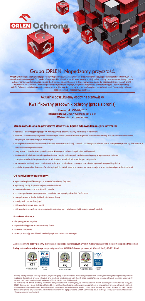 ORLEN Ochrona jest spółką należącą do Grupy Kapitałowej ORLEN i zajmuje się zapewnieniem należytego bezpieczeństwa PKN ORLEN S.A oraz Grupy Kapitałowej ORLEN. Spółka oferuje wysokiej jakości, kompleksowe pakiety profesjonalnych usług z szeroko rozumianego rynku ochrony zarówno w kraju jak i za granicą. Dedykowane są one klientom o strategicznym znaczeniu dla gospodarki kraju, których profil działalności związany jest z wysokim poziomem ryzyka operacyjnego, w tym w szczególności branży rafineryjno - petrochemicznej. ORLEN Ochrona posiada niekwestionowaną pozycję lidera rynku ochrony w branży rafineryjno - petrochemicznej. Zapewniając ochronę i bezpieczeństwo - napędzamy przyszłość. Aktualnie poszukujemy osoby na stanowisko Kwalifikowany pracownik ochrony (praca z bronią) Numer ref.: OO/07/2016 Miejsce pracy: ORLEN Ochrona sp. z o.o. Ważne do: bezterminowo Osoba zatrudniona na powyższym stanowisku będzie odpowiadała między innymi za: • realizacja i przestrzeganie przepisów wynikających z zapisów Ustawy o ochronie osób i mienia • należyte i sumienne wykonywanie powierzonych obowiązków służbowych zgodnie z warunkami umowy oraz otrzymanymi zadaniami , wytycznymi bezpośredniego przełożonego • sporządzanie meldunków i notatek służbowych w ramach realizacji czynności służbowych w miejscu pracy, oraz przekazywanie tej dokumentacji bezpośredniemu przełożonemu • reagowanie i ujawnianie wszystkich przypadków wykroczeń oraz innych nieprawidłowości • inicjowanie działań związanych z podniesieniem bezpieczeństwa podczas świadczenia pracy w wyznaczonym miejscu, oraz przedstawianie bezpośredniemu przełożonemu wszelkich informacji z tym związanych • zapewnienie realizacji usługi zgodnie z określonymi przedziałami czasowymi oraz dbanie o prawidłowy przebieg służby • posiadanie przy sobie dokumentów niezbędnych do świadczenia pracy w wyznaczonym miejscu, w szczególności pozwolenia na broń Od kandydatów oczekujemy: • wpisu na listę kwalifikowanych pracowników ochrony fizycznej • legitymacji osoby dopuszczonej do posiadania broni • znajomości ustawy o ochronie osób i mienia • przestrzegania norm postępowania i zasad etycznych przyjętych w ORLEN Ochrona • zaangażowania w działania i lojalności wobec firmy • umiejętności komunikacyjnych • mile widziane prawo jazdy kat. B • mile widziane zezwolenie na prowadzenie pojazdów uprzywilejowanych i transportujących wartości Dodatkowe informacje: • oferujemy pakiet socjalny • odpowiedzialną pracę w renomowanej firmie • szkolenia zawodowe • system pracy dający możliwość swobody wykorzystania czasu wolnego Zainteresowane osoby prosimy o przesyłanie aplikacji zawierających CV i list motywacyjny drogą elektroniczną na adres e-mail: [email protected] lub pocztą na adres: ORLEN Ochrona sp. z o.o., ul. Chemików 7, 09-411 Płock Prosimy o dołączenie do aplikacji klauzuli: „Wyrażam zgodę na przetwarzanie moich danych osobowych zawartych w mojej ofercie pracy na potrzeby niezbędne do realizacji procesu rekrutacji oraz zgodę na przetwarzanie tych danych także po zakończeniu procesu rekrutacji zgodnie z ustawą z 29 sierpnia 1997 r. o ochronie danych osobowych (Dz. U. 2015 r., poz. 2135 ze zm.). Na podstawie art. 24 ust. 1 ustawy o ochronie danych osobowych informujemy, że administratorem danych osobowych kandydatów do pracy jest ORLEN Ochrona sp. z o.o. z siedzibą w Płocku 09-411 ul. Chemików 7, dane osobowe przetwarzane będą w celu realizacji procesu rekrutacji i nie będą udostępniane innym odbiorcom. Podanie danych osobowych jest dobrowolne. Osoba, której dane dotyczą ma prawo dostępu do treści swoich danych oraz prawo ich poprawiania. Nadesłane dokumenty nie będą zwracane. ORLEN Ochrona sp. z o.o. zastrzega sobie prawo skontaktowania się tylko z wybranymi kandydatami.