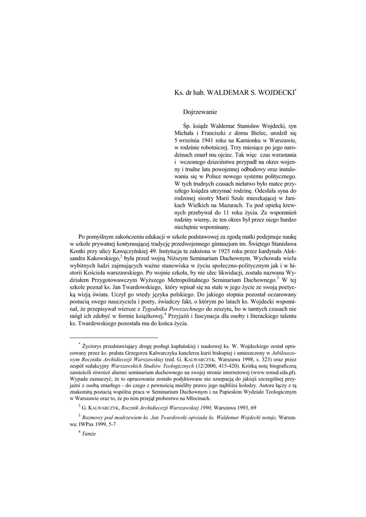 Ks. dr hab. WALDEMAR S. WOJDECKI* Dojrzewanie Śp. ksiądz Waldemar Stanisław Wojdecki, syn Michała i Franciszki z domu Bielec, urodził się 5 września 1941 roku na Kamionku w Warszawie, w rodzinie robotniczej. Trzy miesiące po jego narodzinach zmarł mu ojciec. Tak więc czas wzrastania i wczesnego dzieciństwa przypadł na okres wojenny i trudne lata powojennej odbudowy oraz instalowania się w Polsce nowego systemu politycznego. W tych trudnych czasach niełatwo było matce przyszłego księdza utrzymać rodzinę. Odesłała syna do rodzonej siostry Marii Szulc mieszkającej w Janikach Wielkich na Mazurach. Tu pod opieką krewnych przebywał do 11 roku Ŝycia. Ze wspomnień rodziny wiemy, Ŝe ten okres był przez niego bardzo niechętnie wspominany. Po pomyślnym zakończeniu edukacji w szkole podstawowej za zgodą matki podejmuje naukę w szkole prywatnej kontynuującej tradycję przedwojennego gimnazjum im. Świętego Stanisława Kostki przy ulicy Kawęczyńskiej 49. Instytucja ta załoŜona w 1925 roku przez kardynała Aleksandra Kakowskiego,2 była przed wojną NiŜszym Seminarium Duchownym. Wychowała wielu wybitnych ludzi zajmujących waŜne stanowiska w Ŝyciu społeczno-politycznym jak i w historii Kościoła warszawskiego. Po wojnie szkoła, by nie ulec likwidacji, została nazwana Wydziałem Przygotowawczym WyŜszego Metropolitalnego Seminarium Duchownego.3 W tej szkole poznał ks. Jan Twardowskiego, który wpisał się na stałe w jego Ŝycie ze swoją poetycką wizją świata. Uczył go wtedy języka polskiego. Do jakiego stopnia pozostał oczarowany postacią swego nauczyciela i poety, świadczy fakt, o którym po latach ks. Wojdecki wspominał, Ŝe przepisywał wiersze z Tygodnika Powszechnego do zeszytu, bo w tamtych czasach nie mógł ich zdobyć w formie ksiąŜkowej.4 Przyjaźń i fascynacja dla osoby i literackiego talentu ks. Twardowskiego pozostała mu do końca Ŝycia. * śyciorys przedstawiający drogę posługi kapłańskiej i naukowej ks. W. Wojdeckiego został opracowany przez ks. prałata Grzegorza Kalwarczyka kanclerza kurii biskupiej i umieszczony w Jubileuszowym Roczniku Archidiecezji Warszawskiej (red. G. KALWARCZYK, Warszawa 1998, s. 323) oraz przez zespół redakcyjny Warszawskich Studiów Teologicznych (12/2000, 415-420). Krótką notę biograficzną zamieścili równieŜ alumni seminarium duchownego na swojej stronie internetowej (www.wmsd.edu.pl). Wypada zaznaczyć, Ŝe to opracowanie zostało podyktowane nie uzurpacją do jakiejś szczególnej przyjaźni z osobą zmarłego - do czego z pewnością mieliby prawo jego najbliŜsi koledzy. Autora łączy z tą znakomitą postacią wspólna praca w Seminarium Duchownym i na Papieskim Wydziale Teologicznym w Warszawie oraz to, Ŝe po nim przejął probostwo na Młocinach. 2 G. KALWARCZYK, Rocznik Archidiecezji Warszawskiej 1990, Warszawa 1993, 69 3 Rozmowy pod modrzewiem ks. Jan Twardowski opwiada ks. Waldemar Wojdecki notuje, Warszawa: IWPax 1999, 5-7 4 TamŜe 330 LIBER MORTUORUM Po zdaniu matury państwowej w 1959 roku postanowił wstąpić do WyŜszego Metropolitalnego Seminarium Duchownego w Warszawie, by realizować swoją drogę do kapłaństwa. Koledzy seminaryjni wspominają go jako zdolnego, uczynnego i radosnego kolegę. Dobrego kompana na spływach kajakowych po mazurskich szlakach i rowerowych wyprawach turystycznych. Studia seminaryjne zakończył przyjmując w archikatedrze warszawskiej w dniu 27 maja 1965 roku święcenia kapłańskie z rąk arcybiskupa warszawskiego Stefana kard. Wyszyńskiego, Prymasa Polski. Formacja duszpasterska i naukowa Po trzech latach pracy duszpasterskiej w Lesznie koło Błonia, Nowym Dworze Mazowieckim oraz w Zerznie, pozytywnie ocenianej przez przełoŜonych, rozpoczął studia na Wydziale Teologicznym w Akademii Teologii Katolickiej w Warszawie. Motywem głównym podjęcia studiów była chęć doskonalenia przygotowania do pracy duszpasterskiej. Bardzo cenił sobie posługę kaznodziejsko-homiletyczną i pragnął słuŜyć innym swoim zamiłowaniem do głoszenia Słowa BoŜego. Nie było więc przypadkiem, Ŝe podjął studia specjalistyczne w zakresie homiletyki. Ksiądz Edward śmijewski, jego kursowy kolega, wspomniał w mowie poŜegnalnej, Ŝe po to studiował homiletykę, aby wszczepić w swoich studentów rozmiłowanie się w Piśmie świętym i nauce Apostołów…. Studia zakończył w 1971 roku przedstawieniem pracy magisterskiej na temat: Arcybiskup Antoni Szlagowski jako teoretyk kaznodziejstwa. Promotorem tej pracy był ks. prof. Leszek Kuc. Do końca Ŝycia fascynowała go postać jednego z najwybitniejszych kaznodziejów polskich, jakim był abp Antoni Szlagowski, któremu poświęcił wiele uwagi w swoich późniejszych publikacjach. Studia doktoranckie na ATK ukończył w 1974 roku broniąc pracę doktorską na temat: Arcybiskup Antoni Szlagowski jako mówca i konferencjonista, napisaną pod kierunkiem ks. prof. Andrzeja Zuberbiera, którego do końca Ŝycia darzył wielkim szacunkiem i odwzajemnioną przyjaźnią. Ksiądz A. Zuberbier pomagał ks. Wojdeckiemu w duszpasterstwie na Młocinach i miał zostać u niego rezydentem, lecz przeszkodziła temu tragiczna śmierć Profesora.5 W 1975 roku, będąc rezydentem w parafii Nawiedzenia Najświętszej Maryi Panny w Warszawie, otrzymał nominację na stanowisko referenta wydziału Duszpasterskiego Kurii Warszawskiej oraz prefekta i wykładowcy homiletyki w Seminarium Duchownym. Funkcję prefekta pełnił stosunkowo krótko, natomiast wykładowcą seminaryjnym był aŜ do 1999 roku. Po wielu latach wspominany jest przez księŜy jako niekonwencjonalny wychowawca. Alumni cenili go za naukową kompetencję i zaraźliwy humor oraz permanentną Ŝyczliwość. W swoich wykładach seminaryjnych przekazywał duŜo treści z historii oraz teorii kaznodziejstwa i często nawiązywał do modelowego kaznodziejstwa abpa Antoniego Szlagowskiego. Akcentował mocno metodę homilii kerygmatycznej, z uwzgl