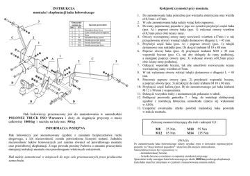 Kolejność czynności przy montaŜu. INSTRUKCJA montaŜu i eksploatacji haka holowniczego 3 C Oznaczenie zacisku wg ISO PN 1 L 2 + 3 31 4 R 5 58R 6 54 7 58L 2 1 Łączenie przewodów Kierunkowskazy lewe Tylne światła przeciwmgłowe Masa Kierunkowskazy prawe Światła pozycyjne prawe Światła hamowania Światła pozycyjne lewe 1 A C 2 3 D B D Hak holowniczy przeznaczony jest do zamontowania w samochodzie POLONEZ TRUCK FSO Warszawa i słuŜy do ciągnięcia przyczep o masie całkowitej 1000 kg i nacisku na kulę max 50 kg. INFORMACJA WSTĘPNA Hak holowniczy jest skonstruowany zgodnie z zasadami bezpieczeństwa ruchu drogowego, a ich niezawodność została potwierdzona licznymi testami. JednakŜe niezawodność haków holowniczych jest zaleŜna równieŜ od prawidłowego montaŜu oraz prawidłowej eksploatacji. Z tego powodu prosimy Państwa o staranne przeczytanie niniejszej instrukcji montaŜu oraz przestrzeganie właściwych wskazówek. Hak naleŜy zamontować w miejscach do tego celu przeznaczonych przez producenta samochodu. 1. Do zamontowania haka potrzebna jest wiertarka elektryczna oraz wiertła ø10,5mm i ø17mm. 2. W celu zamontowania haka naleŜy wyjąć koło zapasowe. 3. Do ramy poprzecznej pojazdu w jego osi symetrii przyłoŜyć części haka (poz. A) i poprzez otwory haka (poz. 1) wykonać otwory wiertłem ø10,5mm przez obie ściany ramy. 4. Otwory wewnętrznej strony ramy rozwiercić wiertłem ø17mm i w tak przygotowane otwory wsunąć tulejki dystansowe długości L = 45 mm. 5. PrzyłoŜyć część haka (poz. A) i poprzez otwory (poz. 1), tulejki dystansowe oraz nakładki (poz. D) skręcić śrubami M 10 x 80 mm 6. Poprzez otwory haka (poz. 2) przykręcić śrubami M10 x 35 mm wsporniki boczne (poz. C), tak aby dolegały do ramy podłuŜnej, a następnie poprzez otwory (poz. 3) wykonać otwory ø10,5mm przez obie ściany ramy podłuŜnej. 7. Odkręcić wsporniki boczne, tak aby umoŜliwić rozwiercenie ściany wewnętrznej ramy wiertłem ø17mm. 8. W tak wykonane otwory włoŜyć tulejki dystansowe o długości L = 45 mm. 9. Ponownie poprzez otwory (poz. 2) przykręcić wsporniki boczne, a poprzez otwory (poz. 3) przykręcić do ramy śrubami M 10 x 80 mm. 10. Przykręcić część kulistą (poz. B) do zamontowanego juŜ haka śrubami M 12 x 90 mm z wyposaŜenia. 11. Dokręcić wszystkie śruby z momentem jak pokazano w tabeli. 12. Podłączyć przewody gniazdka 7 - bieg. do instalacji elektrycznej zgodnie z instrukcją fabryczną samochodu (zaleca się wykonanie w ASO). 13. Uzupełnić ewentualne ubytki powłoki malarskiej haka powstałe w trakcie montaŜu. Zalecany moment skręcający dla śrub i nakrętek 8,8 : M8 M12 25 Nm 85 Nm M10 M14 55 Nm 135 Nm UWAGA Po zamontowaniu haka holowniczego naleŜy uzyskać wpis w dowodzie rejestracyjnym pojazdu na "stacji kontroli pojazdów" właściwej dla miejsca zamieszkania . Samochód powinien być wyposaŜony w: - kierunkowskazy boczne, - lusterka boczne o rozstawie co najmniej szerokości przyczepy. Sprawdzać śruby mocujące haka holowniczego po około 1000 km przebiegu eksploatacji. Kula haka musi być utrzymana w czystości i konserwowana smarem stałym. PPUH AUTO-HAK S.J. Produkcja Zaczepów Kulowych Henryk & Zbigniew Nejman 76-200 SŁUPSK ul. Słoneczna 16K tel/fax (059) 8-414-414; 8-414-413 E-mail: [email protected] www.autohak.com.pl KARTA GWARANCYJNA Producent udziela gwarancji niniejszą kartą gwarancyjną na okres 24 miesięcy licząc od dnia zakupu haka holowniczego do samochodu: POLONEZ TRUCK FSO Warszawa Zaczep kulowy bez wyposaŜenia elektrycznego Klasa: A50-X Nr kat. S05 Przeznaczony do zamontowania w samochodzie: Producent: POLONEZ Model: TRUCK, FSO Warszawa Data produkcji .............................. Data zakupu................................... Gwarancja odnosi się do wad ukrytych wynikających z niezgodności z aktualnie zobowiązującymi normami a zwłaszcza ze złej konstrukcji, zastosowania wadliwych materiałów itp. Gwarancja nie obejmuje natomiast uszkodzeń zawinionych przez nabywcę, a zwłaszcza na skutek nieprzestrzegania zasad konserwacji i uŜytkowania powstałych w czasie przewozów dokonanych przez nabywcę. Reklamacje naleŜy zgłaszać w punkcie sprzedaŜy, składając jednocześnie kartę gwarancyjną. Usunięcie "wady" następuje po stwierdzeniu przez punkt sprzedaŜy wspólnie z producentem słuszności złoŜonej reklamacji. Reklamacja powinna być załatwiona w ciągu czternastu dni od dnia uznania reklamacji. Karta gwarancyjna jest niewaŜna, jeŜeli nie jest wypełniona i podpisana. Data zgłoszenia reklamacji: ................................................................... Dane techniczne: wartość siły D: 6,00 kN maksymalna masa przyczepy: 1000 kg maksymalny nacisk na kulę: 50 kg Numer homologacji zgodnie z dyrektywą 94/20/WE: INFORMACJA WSTĘPNA Zaczep kulowy jest skonstruowany zgodnie z zasadami bezpieczeństwa ruchu drogowego. Zaczep kulowy jest elementem wpływającym na bezpieczeństwo jazdy i moŜe zostać zainstalowany wyłącznie przez personel wyspecjalizowany. Niedopuszczalne jest dokonywanie jakichkolwiek zmian w konstrukcji zaczepu. Powoduje to wygaśniecie dopuszczenia do stosowania. W przypadku obecności masy izolacyjnej lub osłony podwozia w miejscu przylegania zaczepu, naleŜy ją usunąć. Nieosłonięte miejsca karoserii oraz wywiercone otwory naleŜy pomalować farbą antykorozyjną. Informacjami wiąŜącymi odnośnie wartości obciąŜeń są dane podawane przez producenta samochodu, względnie wartości maksymalnej masy przyczepy oraz maksymalnego nacisku na kulę, przy czym wartości parametrów zaczepu kulowego nie mogą być przekroczone. Wzór do obliczania wartości siły D: Maks. masa przyczepy [kg] x Maks. masa samochodu [kg] Maks. masa przyczepy [kg] + Maks. masa samochodu [kg] X 9,81 = 1000 D [kN]