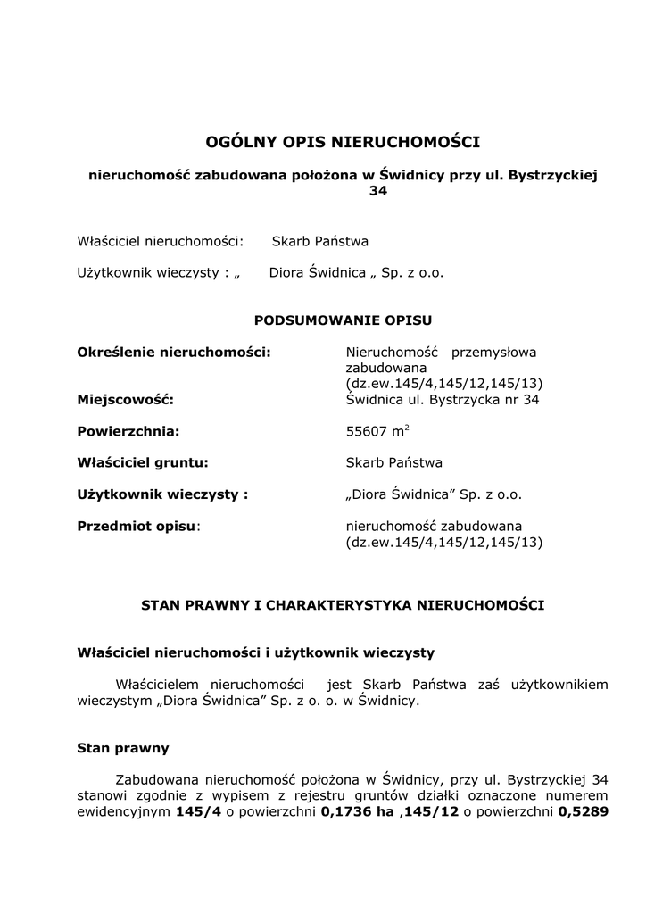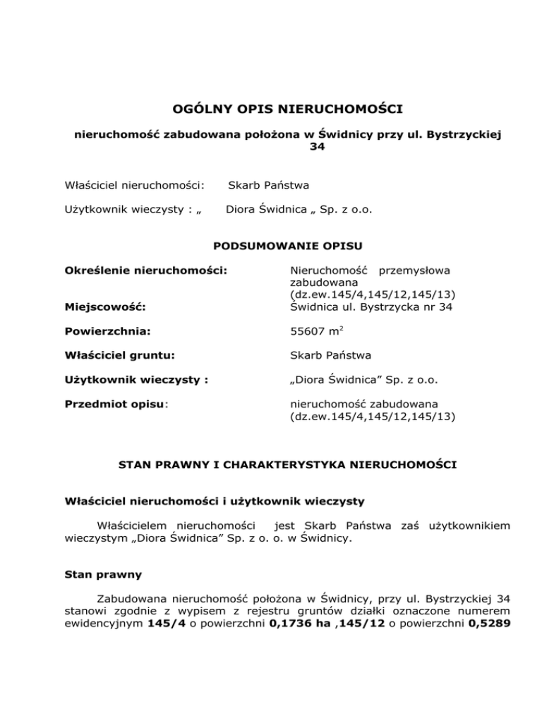 OGÓLNY OPIS NIERUCHOMOŚCI nieruchomość zabudowana położona w Świdnicy przy ul. Bystrzyckiej 34 Właściciel nieruchomości: Skarb Państwa Użytkownik wieczysty : „ Diora Świdnica „ Sp. z o.o. PODSUMOWANIE OPISU Określenie nieruchomości: Miejscowość: Nieruchomość przemysłowa zabudowana (dz.ew.145/4,145/12,145/13) Świdnica ul. Bystrzycka nr 34 Powierzchnia: 55607 m2 Właściciel gruntu: Skarb Państwa Użytkownik wieczysty : „Diora Świdnica” Sp. z o.o. Przedmiot opisu: nieruchomość zabudowana (dz.ew.145/4,145/12,145/13) STAN PRAWNY I CHARAKTERYSTYKA NIERUCHOMOŚCI Właściciel nieruchomości i użytkownik wieczysty Właścicielem nieruchomości jest Skarb Państwa zaś użytkownikiem wieczystym „Diora Świdnica” Sp. z o. o. w Świdnicy. Stan prawny Zabudowana nieruchomość położona w Świdnicy, przy ul. Bystrzyckiej 34 stanowi zgodnie z wypisem z rejestru gruntów działki oznaczone numerem ewidencyjnym 145/4 o powierzchni 0,1736 ha ,145/12 o powierzchni 0,5289 ha i 145/13 o powierzchni 4,8582 ha, w obrębie nr 0006 Kraszowice miasto Świdnica. Powierzchnia nieruchomości wynosi razem 55607 m2. Istnieją wypisy z rejestru gruntów (07.06.2010). Zgodnie z zaświadczeniem z dnia 4.07.2011 r. o przeznaczeniu nieruchomości w obowiązującym miejscowym planie zagospodarowania przestrzennego, przedmiotowa nieruchomość znajduje się na terenie gdzie nie obowiązuje plan zagospodarowania miasta Świdnicy. W takim stanie prawnym obowiązują dla tego regionu miasta ustalenia studium uwarunkowań i kierunków zagospodarowania przestrzennego Miasta Świdnicy, zgodnie z uchwałą Rady Miejskiej nr XXXV/422/09 z dnia 3 lipca 2009 r., określające kierunki rozwoju miasta, które muszą być uwzględniane w opracowaniach miejscowych planów zagospodarowania przestrzennego . Zgodnie z przeznaczeniem terenów i kierunkami zmian w strukturze przestrzennej, przedmiotowe działki znajduje się w strefie „C” - zabudowy jednorodzinnej z zielenią, na terenie oznaczonym na rysunku Studium symbolem : U/MW – tj. o funkcji głównej jako tereny zabudowy usługowej i zabudowy mieszkaniowej wielorodzinnej, z funkcją towarzyszącą funkcji głównej w postaci: terenów parków i zieleni urządzonej (ZP), istniejących terenów zabudowy jednorodzinnej (MN), tereny usług sportu i rekreacji (US), tereny parkingów (KS1), garaży istniejących, ulic lokalnych, dojazdowych i wewnętrznych, ciągów pieszych i rowerowych, sieci i urządzeń infrastruktury technicznej Istnieje możliwość uzyskania warunków zabudowy dla zabudowy mieszkaniowej jednorodzinnej / wielorodzinnej i usługowej. Nieruchomość jest korzystnie położona – z bezpośrednim dostępem do drogi publicznej i w niedużej odległości do drogi Świdnica – Dzierżoniów (ok. 1 km prostej drogi) oraz drogi Świdnica – Wrocław (ok. 3 km). Położenie to jest również korzystne z punktu widzenia prawdopodobnego przebiegu obwodnicy Świdnicy – w odległości gwarantującej świetną komunikację przy jednoczesnym braku niedogodności związanych z sąsiedztwem takiej trasy. Dla nieruchomości Sąd Rejonowy w Świdnicy V Wydział Ksiąg Wieczystych prowadzi księgę wieczystą SW1S/00019863/9 (odpis z dnia 08.06.2010). Z działu I wynika, że jest ona prowadzona dla nieruchomości położonej w Świdnicy, przy ul. Bystrzyckiej 34, stanowiącej działki gruntu nr 145/4, 145/7 w użytkowaniu wieczystym , zabudowane budynkami przemysłowymi. Powierzchnia nieruchomości 55607 m2. W dziale II przedmiotowej KW jako właściciel ujawniony jest Skarb Państwa a jako użytkownik „Diora Świdnica” spółka z ograniczona odpowiedzialnością Dział III – bez wpisów Dział IV : 2 Ustanowiona jest hipoteka na rzecz Agencji Rozwoju Przemysłu SA w związku z udzieloną Diora – Świdnica sp. z o.o. pożyczką na restrukturyzację. Zgodnie z umową środki uzyskane ze sprzedaży nieruchomości będą w pierwszej kolejności przeznaczone na spłatę przedmiotowego obciążenia. Księga podaje też budynki znajdujące się na nieruchomości: budynek produkcyjno-socjalny, budynek produkcyjny trafo i magazyn, hala magazynowo-warsztatowa, hala produkcyjna, hala produkcyjna, hala kotłowni i zmiękczalni, 7. budynek magaz. socjalny, 8. hala magazynowa, 9. budynek magazynowy, 10. hala magazynowa, 11. budynek magazynowy- gosp., 12. portiernia. 13. wiata garażowa – urządzenie. Powierzchnia użytkowa budynków do wynajmu (razem) : 14589,5 m2 1. 2. 3. 4. 5. 6. Charakterystyka nieruchomości Zabudowana nieruchomość położona w Świdnicy, przy ul. Bystrzyckiej 34 , jest nieruchomością przemysłową, ogrodzoną z powierzchnią utwardzoną. Odległość od centrum miasta ok. 3 km. Teren równy. Dojazd dogodny drogą asfaltową. Bliskość komunikacji miejskiej. Dostęp do uzbrojenia pełny. Na gruncie nieruchomości zlokalizowane są następujące budynki: 1. BUDYNEK PRZYRZYNALNI NR INWENTARZOWY 100-00001 Opis techniczny Budynek parterowy, nie podpiwniczony o konstrukcji szkieletowej z elementów żelbetowych Szkielet budynku wypełniony ścianami wykonanymi z cegły na zaprawie cementowo-wapiennej do poziomu parapetów. Powstała część ścian wypełniona stalowymi ramami okiennymi szklonym i szybami o grubości 3 mm, Stropodach wykonany z elementów prefabrykowanych, płyty wielootworowe ułożone na dźwigarach strunobetonowych, ocieplony i pokryty papą asfaltową. Posadzki o pokryciu plastidurowym i betonowym. Budynek wyposażony w instalacje; odgromową, elektryczną "NN i WN, centralne ogrzewanie (parowe), sprężonego powietrza, wentylację wyciągową (odpylającą), wywietrzniki dachowe. Rok budowy 1940, modernizacja w roku 1984. Wykorzystanie Obróbka wstępna materiałów drzewnych i wstępny montaż obudów, Ocena stanu technicznego Stan ogólny dobry, Remontu wymagają posadzki, Powierzchnia użytkowa : 1099,5 m2 3 2. BUDYNEK (NATRYSKOWNIA , HALA WYKOŃCZENIOWA) NR INW. 100-00002 Rok budowy 1965 Opis t