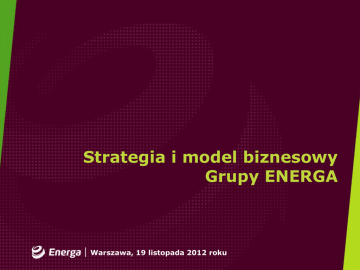 Strategia i model biznesowy Grupy ENERGA Warszawa, 19 listopada 2012 roku Grupa ENERGA jest… Na dzień 30 czerwca 2012 15,82% 84,18% Jednym z czterech największych koncernów energetycznych w Polsce Obszar działalności dystrybucyjnej obejmuje ¼ powierzchni kraju Spółką z większościowym udziałem Skarbu Państwa Skarb Państwa Pozostali udziałowcy ENERGA SA Wytwarzanie ENERGA Elektrownie Ostrołęka S.A. ENERGA Hydro Sp. z o.o. ENERGA Elektrociepłownia Kalisz S.A. ENERGA Kogeneracja Sp. z o.o. Projekty inwestycyjne Sprzedaż Dystrybucja ENERGAOPERATOR SA Usługi wspierające ENERGA-OBRÓT SA ENERGA Obsługa i Sprzedaż Sp. z o.o. Pozostałe Centra usług wspólnych Zaopatrzenie Pozostałę MIROSŁAW BIELIŃSKI ROMAN SZYSZKO WOJCIECH TOPOLNICKI Prezes Zarządu ENERGA SA Wiceprezes Zarządu ENERGA SA ds. finansowych Wiceprezes Zarządu ENERGA SA ds. strategii rozwoju Oświetlenie Pozostałe Holdingiem zintegrowanym pionowo o uporządkowanej strukturze własnościowej Warszawa, 19 listopada 2012 roku Zarządzana przez doświadczonych menedżerów 2 Grupa ENERGA ma ugruntowaną pozycję na rynku Sprzedaż energii (TWh) (udział w rynku) Dystrybucja eneregii (TWh) (udział w rynku) Wytwarzanie energii (TWh) (udział w rynku) 45,0 30,4 18,6 14,3 6,4 2,2 (36,1%) (24,4%) (14,9%) (11,5%) (5,1%) (1,8%) 52,8 31,1 19,6 17,1 7,1 (36,9%) (25,5%) (16,1%) (14,0%) (5,8%) 24,0 61,7 4,7 12,6 (14,7%) (37,8%) (2,9%) (7,7%) - - - - - 16,2 11,2 8,5 0,95 (9,9%) (6,9%) (5,2%) (1,3%) Dane za rok 2011 Kluczowe informacje • Grupa ENERGA jest jednym z czterech największych koncernów energetycznych w Polsce obok PGE, Tauron i Enea. Sprzedaż • Grupa ENERGA jest jednym z najważniejszych sprzedawców energii w Polsce. W 2011 roku Grupa ENERGA sprzedała odbiorcom końcowym 18,6 TWh energii, co stanowi 14,9% całego rynku. Wytwarzanie • Udział Grupy Energa w rynku wytwarzania energii elektrycznej jest relatywnie niewielki i wynosi ok. 3% Warszawa, 19 listopada 2012 roku Dystrybucja • Grupa ENERGA ma znaczący udział w rynku dystrybucji energii w Polsce 16,1% w 2011 roku; • Sieć dystrybucji Grupy ENERGA obejmuje ¼ powierzchni Polski. Odnawialne źródła energii • ENERGA jest liderem wśród czterech głównych grup energetycznych na polskim rynku pod względem udziału energii elektrycznej pochodzącej ze źródeł odnawialnych w energii wytworzonej ogółem, głównie dzięki produkcji energii w hydroelektrowniach 3 Cel 2 Osiągnięcie jak najwyższej, a zarazem akceptowanej przez regulatora rentowności w zakresie usług dystrybucji energii elektrycznej w celu wykreowania zdolności Grupy do ekspansji Cel 3 Osiągnięcie pozycji lidera w zakresie budowy rozproszonych, w szczególności odnawialnych, źródeł wytwarzania energii Cel 4 Osiągnięcie trwałej przewagi konkurencyjnej w obszarze obsługi klientów i aktywnej sprzedaży usług oferowanych przez Grupę Optymalizacja rozwoju energetyki konwencjonalnej poprzez udział kapitałowy partnerów strategicznych we wspólnie prowadzonych przedsięwzięciach w tym zakresie Cel 5 Cel 1 Strategia Grupy ENERGA opiera się na pięciu celach strategicznych… Stworzenie modelu współpracy z klientem końcowym, w którym odbiorca energii może stać się jednocześnie współwytwórcą i dostawcą usług oferowanych przez Grupę PSS Elektrownie systemowe PSS CHP PSS Odnawialne źródła energii PSS Dystrybucja energii PSS Sprzedaż Zwiększenie potencjału wytwórczego w OZE oraz podniesienie efektywności segmentu Rozbudowa mocy wytwórczych w obszarze wytwarzania energii w skojarzeniu z ciepłem i kwalifikowanej jako OZE Wzrost potencjału produkcji energii elektrycznej kwalifikowanej jako OZE Podniesienie rentowności segmentu z wykorzystaniem inwestycji w innowacyjne technologie Zwiększenie masy marży w sprzedaży do klientów oraz wzrost efektywności i poprawa jakości obsługi klienta …które zostały doprecyzowane w postaci celów i inicjatyw planów strategicznych segmentów (PSS) Warszawa, 19 listopada 2012 roku 4 Realizację strategii oparto na przejrzystym modelu biznesu… Wytwarzanie Dystrybucja Sprzedaż 2,9% udziału w rynku 16,1% udziału w rynku 14,9% udziału w rynku Elektrownie systemowe Dystrybucja energii Obrót energią CHP Usługi wspierające Obsługa klienta Odnawialne źródła energii Oświetlenie Pozostałe Usługi Struktura EBITDA wg segmentów I-IX 2012 16 % (15%*) 72% 14 % 2011: 34 % (25%*) 59 % 12 % 2010: 42 % (34%*) 46 % 17 % *w tym OZE Warszawa, 19 listopada 2012 roku 5 Przepływy operacyjne Przepływy energii elektrycznej w Grupie ENERGA w okresie I-IX 2012 roku (w uproszczeniu) Inne podmioty * Gospodarstwa domowe 1,1 TWh 0,2 TWh (2011) 4,0 TWh Odbiorcy końcowi regulowane 26% 4,1 TWh (2011) nieregulowane 74% Odbiorcy biznesowi 15,1 TWh z czego 14,4 TWh Sprzedaż 0,7 TWh Odsprzedaż 14,4 TWh (2011) Wytwórcy z Grupy 3,0 TWh 11,1 TWh 1,9 TWh 10,3 TWh (2011) 3,1 TWh (2011) 3,3 TWh (2011) ENERGA-OBRÓT OSD 20,7 TWh 1,1 TWh Sprzedawcy spoza Grupy 19,9 TWh (2011) 1,1 TWh (2011) 18,8 TWh Hurt 16,8 TWh (2011) 4,5 TWh 4,4 TWh (2011) * TGE, PSE-Operator (rynek bilansujący, must-run, usługi regulacyjne) Warszawa, 19 listopada 2012 roku 6 Zrównoważony program inwestycyjny do 2020 roku Opiera się na zasadach: Utrzymania bezpiecznego, konserwatywnego poziomu wskaźników finansowych Koncentruje się na: Regulowane usługi dystrybucyjne • „dług netto/EBITDA” nie większy niż 2,5 Program inwestycyjny o niskim ryzyku • Nakłady na pojedynczy projekt nie przekraczają rocznej EBITDA Grupy Dywersyfikacja portfela inwestycyjnego • Ukierunkowanie na projekty średniej wielkości • Skoncentrowanie się na wysokosprawnych i niskoemisyjnych technologiach wytwarzania – OZE, CCGT (combined cycle gas turbine) Utrzymanie najniższego pośród polskich grup energetycznych wskaźnika emisyjności w przeliczeniu na 1 MWh - poniżej 0,4 Mg/MWh Nowe OZE • Ok. 49% planowanych nakładów – 12,4 miliarda PLN •
