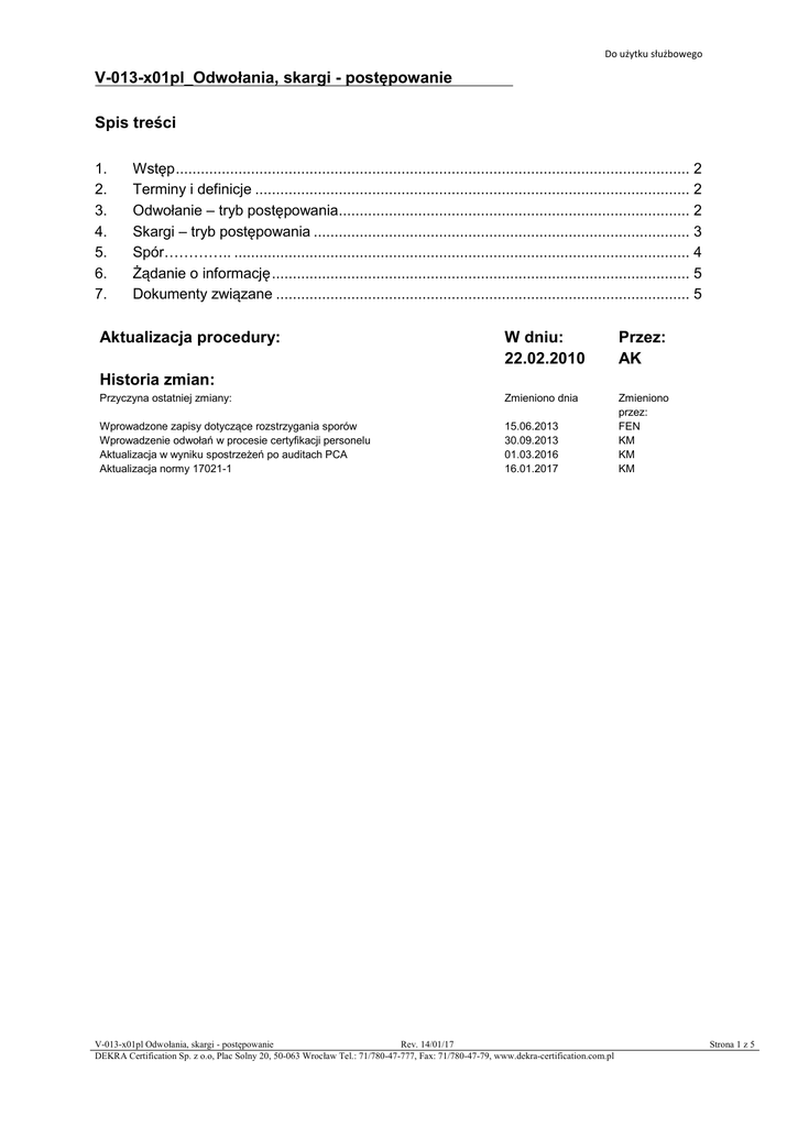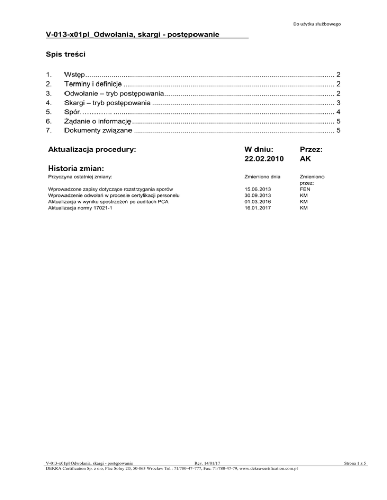 Do użytku służbowego V-013-x01pl_Odwołania, skargi - postępowanie Spis treści 1. 2. 3. 4. 5. 6. 7. Wstęp ........................................................................................................................... 2 Terminy i definicje ........................................................................................................ 2 Odwołanie – tryb postępowania.................................................................................... 2 Skargi – tryb postępowania .......................................................................................... 3 Spór………….. ............................................................................................................. 4 Żądanie o informację .................................................................................................... 5 Dokumenty związane ................................................................................................... 5 Aktualizacja procedury: W dniu: 22.02.2010 Przez: AK Przyczyna ostatniej zmiany: Zmieniono dnia Wprowadzone zapisy dotyczące rozstrzygania sporów Wprowadzenie odwołań w procesie certyfikacji personelu Aktualizacja w wyniku spostrzeżeń po auditach PCA Aktualizacja normy 17021-1 15.06.2013 30.09.2013 01.03.2016 16.01.2017 Zmieniono przez: FEN KM KM KM Historia zmian: V-013-x01pl Odwołania, skargi - postępowanie Rev. 14/01/17 DEKRA Certification Sp. z o.o, Plac Solny 20, 50-063 Wrocław Tel.: 71/780-47-777, Fax: 71/780-47-79, www.dekra-certification.com.pl Strona 1 z 5 Do użytku służbowego V-013-x01pl_Odwołania, skargi - postępowanie 1. Wstęp Niniejsza procedura ma zastosowanie do odwołań i skarg odnoszących się do procesów certyfikacji realizowanych w DEKRA Certification Sp. z o.o. Niniejsza procedura określa postępowanie przy rozstrzyganiu sporów wynikających z krajowej i międzynarodowej działalności DEKRA Certification Sp. z o.o. 2. Terminy i definicje Odwołanie Wystąpienie przez organizację dostarczającą przedmiot oceny zgodności do DEKRA Certification Sp. z o.o. o ponowne rozpatrzenie przez w/w jednostkę decyzji przez nią podjętej odnoszącej się do tego przedmiotu. Skarga Zgłoszone przez jakąkolwiek osobę lub organizację niezadowolenie, inne niż odwołanie z działalności DEKRA Certification Sp. z o. o., gdzie wymagana jest odpowiedź Spór Brak zgody na przedstawiony przez DEKRA Certification Sp. z o.o. sposób rozwiązania skargi. Rozjemca Osoba lub organizacja, która zapewnia i prowadzi proces rozstrzygania sporów, zewnętrzna w stosunku do DEKRA Certification Sp. z o.o. 3. Odwołanie – tryb postępowania Klienci DEKRA Certification Sp. z o.o., na każdym etapie procesu certyfikacji ma prawo odwołać się od każdej decyzji podjętej przez DEKRA Certification Sp. z o.o. (np. o nie przyjęciu wniosku o certyfikację, przerwanie procesu certyfikacji, nie udzieleniu certyfikatu, odmowie dopuszczenia do egzaminu, oceny egzaminu). Opis postępowania przy rozpatrywaniu odwołań dostępny jest publicznie na stronie http://dekra-certification.com.pl/ Przyjęcie każdego odwołania jest potwierdzane składającemu odwołanie. Odwołanie należy złożyć w formie pisemnej do Zespołu Zarządzania i Certyfikacji (Zespół ZZ) w ciągu 14 dni od otrzymania decyzji. Specjalista w Zespole ZZ rejestruje odwołanie, które wpłynęło do DEKRA Certification Sp. z o.o., a następnie przekazuje je do rozpatrzenia przez komisję odwoławczą. Komisję odwoławczą powołuje Prezes Zarządu, wybierając 3 osoby spośród Członków Komitetu Certyfikującego właściwego dla danego obszaru certyfikacji, w przypadku certyfikacji osób komisja odwoławcza składa się z 3 osób spośród Członków Komitetu Technicznego, Prezes Zarządu wskazuje także osobę pełniącą funkcję przewodniczącego. W skład komisji będą powołane osoby, które nie były w żaden sposób zaangażowane w sprawę będącą przedmiotem odwołania. Po rozpatrzeniu odwołania Komisja stwierdza: zasadność odwołania oraz wskazuje jakie działania należy podjąć w reakcji na odwołanie oddala odwołanie. Decyzja zostaje przekazana do zespołu ZZ, który jest odpowiedzialny za formalne przekazanie jej składającemu odwołanie. Jeżeli ma to zastosowanie podejmowane są odpowiednie korekcje i działania korygujące, których wdrożenie jest monitorowane przez zespół ZZ. Odwołanie powinno zostać rozpatrzone w okresie 30 dni od dnia gdy wpłynęło. O sposobie rozpatrzenia odwołania informuje się klienta na piśmie. V-013-x01pl Odwołania, skargi - postępowanie Rev. 14/01/17 DEKRA Certification Sp. z o.o, Plac Solny 20, 50-063 Wrocław Tel.: 71/780-47-777, Fax: 71/780-47-79, www.dekra-certification.com.pl Strona 2 z 5 Do użytku służbowego V-013-x01pl_Odwołania, skargi - postępowanie Składanie, rozpatrywanie i podejmowanie decyzji w sprawie odwołań nie skutkuje jakimikolwiek działaniami przeciwko składającemu odwołanie. Każdy klient jest informowany w umowie / Ogólnych Warunkach Handlowych (D-033-01pl Ogólne Warunki Handlowe lub CW-D02-W_Ogólne Warunki Handlowe JCW-JN)/ D-03SS-x02pl Ogólnych Warunkach Certyfikacji Personelu, że w przypadku rozbieżności interpretacji czynności prawnych ostatnim ciałem odwoławczym jest właściwy sąd dla siedziby Zleceniobiorcy. 4. Skargi – tryb postępowania Opis procesu postępowania ze skargami jest publicznie dostępny na stronie http://dekracertification.com.pl/ Rozróżniamy: Skargi dotyczące działalności DEKRA Certification Sp. z o.o.; Skargi dotyczące organizacji/ osób certyfikowanych przez DEKRA Certification Sp. z o.o.. Skargi można składać na piśmie lub pocztą elektroniczną. W przypadku skargi ustnej DEKRA Certification Sp. z o.o. wymaga jej pisemnego potwierdzenia. Skargi, niezależnie od sposobu ich złożenia, powinny zawierać imię, nazwisko (nazwę) i adres zamieszkania, w tym kod pocztowy wnoszącego skargę, w przec