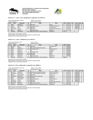 Zawody Regionalne w skokach przez przeszkody Memoriał Armii Krajowej XIV eliminacja Ligi Mazowsza 2014 SKJ Legia-Kozielska Warszawa 02.08.2014 Konkurs nr 1, „open”, Kuce, dokładności z rozgrywką, wys. 60/70 cm Liczba przeszkód/skoków: 8/8; 6;6 Tempo: 325 m/min. Lp 1 2 3 4 5 Imię Alicja Zofia Karolina Franciszek Anna Patrycja Nazwisko Markiewicz Dudkiewicz Bar Jurzak Kamola Markiewicz Dystans: 350 m; 290 m Norma czasu: 65"; 54" Ur. Klub M 05 M 03 M 04 M 03 bpk MAZ Ciechanowski KJ bpk MAZ bpk MAZ M 03 KJ Equest Łąck Bractwo Konne Św. Marcina Stryków Koń Denis Kropelka Sushi gr. A1 Lukrecja gr. A1 Charlie's Boomerang gr. D Frejka gr. Markus gr. Pkt Czas Pkt Czas Pkt LM 0 0 0 0 47,05 53,22 54,32 54,26 0 0 0 4 31,15 34,96 38,50 36,51 6 6 6 6 12 Elim 77,19 Sędzia Główny: Ewa Porębska-Gomółka Skład orzekający: Monika Dorf, Lidia Chomentowska, Norbert Maciejak Gospodarz Toru: Łukasz Akszak-Okińczyc Konkurs nr 2, „open”, dokładności, wys. 60/70 cm Liczba przeszkód/skoków: 8/8 Tempo: 325 m/min. Lp 1-7. 1-7. 1-7. 1-7. 1-7. 1-7. 1-7. 8 Imię Karolina Marta Zofia Anna Julia Alicja Alicja Julia Patrycja Nazwisko Bar Czernik Dudkiewicz Kamola Marciniak Markiewicz Markiewicz Marciniak Markiewicz Dystans: 350 m Norma czasu: 65" Ur. M 04 S M 03 S M 05 M 05 S M 03 Klub bpk MAZ SKJ Legia-Kozielska Warszawa Ciechanowski KJ nz KJ Equest Łąck bpk MAZ bpk MAZ KJ Equest Łąck Bractwo Konne Św. Marcina Stryków Koń Pkt Czas Lukrecja gr. A1 Sari Nando Super gr. Frejka gr. Niagara Denis Denis Marihuana Markus gr. 0 0 0 0 0 0 0 1 Elim 49,27 55,95 51,41 63,83 57,01 42,87 41,99 67,02 Koń Pkt Czas Pkt Czas Pkt LM 0 0 0 0 0 0 0 0 65,79 58,82 61,84 65,10 67,79 55,26 56,23 59,99 0 0 0 0 0 4 12 31 38,14 38,68 39,09 40,44 41,57 40,03 49,66 86,38 6 6 6 6 6 6 6 6 4 20 65,43 101,48 Sędzia Główny: Ewa Porębska-Gomółka Skład orzekający: Monika Dorf, Lidia Chomentowska, Norbert Maciejak Gospodarz Toru: Łukasz Akszak-Okińczyc Konkurs nr 3, Kuce, dokładności z rozgrywką, wys. 80/90 cm Liczba przeszkód/skoków: 9/10; 6/7 Tempo: 350 m/min. Lp 1 2 3 4 5 6 7 8 9 10 Imię Karolina Aleksandra Michał Aleksandra Anna Zofia Michalina Franciszek Dominika Patrycja Nazwisko Paprocka Wiszowaty Strzeszewski Żbikowska Ruiz Malczyk Dudkiewicz Kobus Jurzak Kwiecień Markiewicz Dystans: 410 m; 350 m Norma czasu:71"; 60" Ur. Klub JM 00 JM 01 JM 00 JM 00 JM 01 M 03 JM 00 M 03 SCIM Stajnia Agmaja Warszawa SKJ Legia-Kozielska Warszawa bpk MAZ Polski Polo Klub Brochów bpk MAZ Ciechanowski KJ bpk MAZ bpk MAZ J 98 M 03 KJ Dworek Okuniew Bractwo Konne Św. Marcina Stryków Sędzia Główny: Ewa Porębska-Gomółka Skład orzekający: Monika Dorf, Lidia Chomentowska, Norbert Maciejak Gospodarz Toru: Łukasz Akszak-Okińczyc Dolores Ewita gr. D Mister Hanek gr. C Lolek gr. C Wigor gr. E Faza gr. C Nando Super gr. Evita gr. D Charlie's Boomerang gr. D Mithryl gr. B Markus gr. Zawody Regionalne w skokach przez przeszkody Memoriał Armii Krajowej XIV eliminacja Ligi Mazowsza 2014 SKJ Legia-Kozielska Warszawa 02.08.2014 Konkurs nr 4, „open”, kl. LL, z trafieniem w normę czasu, wys. 80 cm Liczba przeszkód/skoków: 9/10 Tempo: 350 m/min. Lp 1 2 3 4 5 6 7 8 9 10 11 12 13 14 15 16 17 18 Imię Marta Katarzyna Anna Wiktoria Aleksandra Marek Katarzyna Julia Aleksandra Karolina Paulina Marta Janusz Ludwika Dominika Grażyna Maria Julia Marta Oliwia Nazwisko Radzymińska Kamola Ruiz Malczyk Pawlik Żbikowska Szewczyk Mydlak-Kowalska Marciniak Jurkowska Paprocka Laskowska Czernik Kosek Kruszewska Kwiecień Bałtuszys Gonciarek Marciniak Kucman Kania Dystans: 370 m Norma czasu: 65" Ur. Klub JM 01 JM 02 JM 00 S S S MJ 94 nz nz bpk MAZ bpk MAZ Polski Polo Klub Brochów SKJ Legia-Kozielska Warszawa bpk MAZ KJ Equest Łąck bpk MAZ JM 00 JM 98 S S J 98 J 98 S JM 02 S S MJ 95 SCIM Stajnia Agmaja Warszawa bpk MAZ SKJ Legia-Kozielska Warszawa Kurp. KJ Hippika Ostrołęka KJ Equest Łąck KJ Dworek Okuniew bpk MAZ SKJ Legia-Kozielska Warszawa KJ Equest Łąck nz nz *) Drugie przejazdy w konkursie pary zawodnik-koń poza klasyfikacją Sędzia Główny: Ewa Porębska-Gomółka Skład orzekający: Ewa Porębska-Gomółka, Monika Dorf, Norbert Maciejak Gospodarz Toru: Łukasz Akszak-Okińczyc Koń Bielik Garonna Faza gr. C Dancer Wigor gr. E Ariel Sojuz Niagara Dekoracja Dolores Ewita gr. D Chorąży Sari Korsarz Wilmar Mithryl gr. B P'Spyro Levinson Marihuana Dona Feldine C Pkt Czas Do normy Pkt LM 0 0 0 0 0 0 0 0 0 67,53 62,42 67,83 62,05 68,53 69,58 70,32 76,11 78,69 2,53 2,58 2,83 2,95 3,53 4,58 5,32 11,11 13,69 1 1 1 2 2 2 2 2 4 Elim Elim 66,34 61,27 76,90 71,66 72,31 73,53 80,74 80,80 92,33 1,34 3,73 11,90 6,66 7,31 8,53 15,74 15,80 27,33 6 6 6 6 6 6 6 6 6 Zawody Regionalne w skokach przez przeszkody Memoriał Armii Krajowej XIV eliminacja Ligi Mazowsza 2014 SKJ Legia-Kozielska Warszawa 02.08.2014 Konkurs nr 5, kl. L, z oceną stylu jeźdźca / Licencyjny, wys. 100 cm Liczba przeszkód/skoków: 10/12 Tempo: 350 m/min. Lp 1 2 Imię Wiktoria Marta Maria Anna Michał Michał Marta Maria Anna Nazwisko Pawlik Witos Gonciarek Nerwińska Strzeszewski Strzeszewski Witos Gonciarek Nerwińska Dystans: 450 m Norma czasu: 78" Ur. Klub JM 02 bpk MAZ MJ 93 SKJ Legia-Kozielska Warszawa JM 02 J 97 JM 00 JM 00 MJ 93 JM 02 J 97 Sędzia Główny: Ewa Porębska-Gomółka Sędzia Kwalifikator: Łukasz Akszak-Okińczyc Skład orzekający: Monika Dorf, Norbert Maciejak Gospodarz Toru: Łukasz Akszak-Okińczyc SKJ Legia-Kozielska Warszawa Kurp. KJ Hippika Ostrołęka bpk MAZ bpk MAZ SKJ Legia-Kozielska Warszawa SKJ Legia-Kozielska Warszawa Kurp. KJ Hippika Ostrołęka Koń Dancer Accolanda Levinson Aramis Lolek gr. C Lolek gr. C Accolanda Levinson Aramis Pkt Czas 3,0 3,0 63,88 73,28 b.o. b.o. b.o. b.o. b.o. Elim Elim 75,21 69,87 74,31 72,69 71,48 Zawody Regionalne w skokach przez przeszkody Memoriał Armii Krajowej XIV eliminacja Ligi Mazowsza 2014 SKJ Legia-Kozielska Warszawa 02.08.2014 Konkurs nr 6, kl. L, dwufazowy (dokładności, zwykły