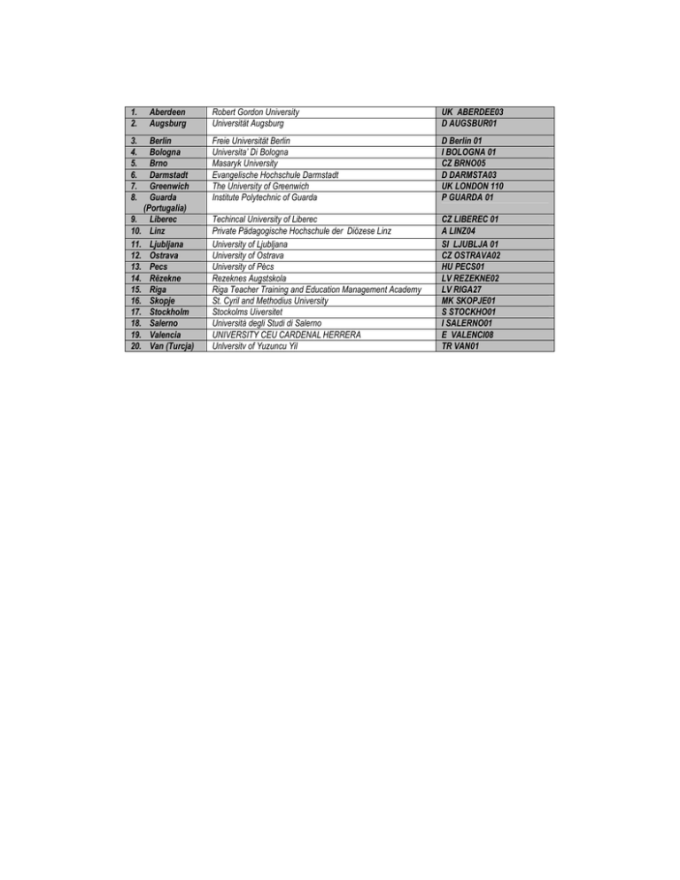 1. 2. 3. 4. 5. 6. 7. 8. Aberdeen Augsburg Berlin Bologna Brno Darmstadt Greenwich Guarda (Portugalia) 9. Liberec 10. Linz 11. Ljubljana 12. Ostrava 13. Pecs 14. Rēzekne 15. Riga 16. Skopje 17. Stockholm 18. Salerno 19. Valencia 20. Van (Turcja) Robert Gordon University Universität Augsburg UK ABERDEE03 D AUGSBUR01 Freie Universität Berlin Universita’ Di Bologna Masaryk University Evangelische Hochschule Darmstadt The University of Greenwich Institute Polytechnic of Guarda D Berlin 01 I BOLOGNA 01 CZ BRNO05 D DARMSTA03 UK LONDON 110 P GUARDA 01 Techincal University of Liberec Private Pädagogische Hochschule der Diözese Linz University of Ljubljana University of Ostrava University of Pėcs Rezeknes Augstskola Riga Teacher Training and Education Management Academy St. Cyril and Methodius University Stockolms Uiversitet Università degli Studi di Salerno UNIVERSITY CEU CARDENAL HERRERA Unlversitv of Yuzuncu Yil CZ LIBEREC 01 A LINZ04 SI LJUBLJA 01 CZ OSTRAVA02 HU PECS01 LV REZEKNE02 LV RIGA27 MK SKOPJE01 S STOCKHO01 I SALERNO01 E VALENCI08 TR VAN01