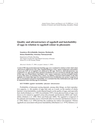 Animal Science Papers and Reports vol. 23 (2005) no. 1, 5-14 Institute of Genetics and Animal Breeding, Jastrzębiec, Poland Quality and ultrastructure of eggshell and hatchability of eggs in relation to eggshell colour in pheasants Stanisława Krystianiak, Radosław Kożuszek, Helena Kontecka, Sebastian Nowaczewski Department of Poultry Breeding, The August Cieszkowski Agricultural University of Poznań Witosa 45, 61-693 Poznań, Poland (Received October 27, 2004; accepted January 5, 2005) A total of 990 ring-necked pheasant hatching eggs were examined in relation to their shell colour –dark-brown, light-brown, olive, blue. Eggshell thickness, water vapour conductance and number of pores per 0,25 cm2 of eggshell were analysed in 285 eggs. Moreover, shell ultrastructure was examined of six eggs of each colour and three incubation sets were carried out with 681 eggs. Shells of blue eggs were found thinner, had higher water vapour conductance and showed higher density of pores than those of remaining three colours. In addition, structural abnormalities of the blue eggshells were found. Blue eggs were characterized by lower fertilization rate, greater weight loss to day 21 of incubation and poorer hatchability. It is concluded that blue-shelled pheasant eggs should be eliminated when selecting eggs for incubation. KEY WORDS: eggshell / hatchability / pheasant / ultrastructure Profitability of pheasant rearing depends, among other things, on their reproductive capacity, i.e. the number of eggs laid, and, as a result, on the number of chicks hatched. Avian hatchability results depend largely on the quality of eggs, and especially their shells [Dohnal et al. 1989, Szczerbińska 1997]. Some physical traits of eggs were shown to be related to eggshell colour [Krystianiak and Kontecka 2002] and hatchability [Dohnal et al. 1989, Mróz and Pudyszak 2000]. The eggshell is composed of the palisade and mamillary layers which both affect its structure and thickness [Fraser et al. 1999, Malec et al. 1999] and thus the conditions for embryo development. Thinner eggshells are associated with poorer hatchability [McDaniel et al. 1979]. Roberts et al. S. Krystianiak et al. [1995] report that thinner eggshells are characterized by the early joining of mamillary cones, which reduces the mamillary layer of the shell. In addition, Carnarius et al. [1996] showed that chicken eggshell resistance is related to the thickness of the mamillary layer. Bunk and Ballown [1978] found that the mamillary layer of eggs with poorer shell quality shows some structural abnormalities. Attached to the shell are two membranes – inner and outer [Solomon 1994]. Analysis of eggshells from different strains of chicken revealed significant differences in the thickness of outer shell membrane and its fibres [Gielecki et al. 1995]. Pheasants lay eggs of different shell colour: dark-brown, light-brown, olive and blue [Krystianiak et al. 2000] and the unsatisfactory reproductive results in pheasants may probably be ascribed to differences in eggshell structure and quality related to and expressed by eggshell colour. The objective of this study was to analyse the eggshell quality and hatchability from pheasant eggs as related to eggshell colour. Material and methods The study was performed in year 2000 during the reproductive period of ring-necked pheasants at a farm belonging to the Agricultural University of Poznań. Two-year-old birds (10 males and 50 females) were kept in ten aviaries (1 male and 5 females) and fed a complete diet containing 11.7 MJ/kg metabolizable energy, 19.1% crude protein (N×6.25) and 2.6% total calcium. Eggs were collected on 3th, 8th, and 13th week of productive season. Shell quality was tested in a total of 285 eggs of different colour (82 dark-brown, 78 light-brown, 79 olive, 46 blue). Prior to analysis, eggs were weighed with an accuracy of 0.01 g. Shell quality analysis accounted for water vapour conductance [Ar et al. 1974], the number of pores per 0.25 cm2 [Tyler 1953] and shell area [Paganelli et al. 1974]. For the determination of water vapour conductance eggs stored for 6 days in an incubator (25°C) were weighed daily in the presence of KOH (used as water vapour absorber). Ultrastructure of both the shell and the outer shell membrane of the eggs collected at week 8 of productive season (6 eggs from each colour group) was analysed with a scanning electronic microscope as described by Richards and Deeming [2001]. One fragment of shell, 0.25 cm2 in area, was obtained from the air-sac end of each egg. After removing the inner membrane, shell fragments were covered with a layer of carbon and gold and pasted to a stabilizer. Analysis covered 20 measurements taken on each preparation to determine the shell cross-section (palisade to mamillary layer ratio). Shell thickness, diameter of outer shell membrane fibres, and outer shell membrane density were also determined. Density of the outer shell membrane was determined after binarization of the microscopic image, as a per cent of fibres in relation to the area of the image analysed. Measurements were made using the Computer Image Analysis System MultiScan v.4.01. Three incubation sets were carried out between week 4 and 8 of egg laying season and a total of 681 eggs were set (229 dark-brown, 276 light-brown, 147 olive and 29 Eggshell traits and hatchability in pheasants blue). Eggs were collected over seven consecutive days and stored at 13°C and 70% relative humidity. Eggs were weighed before setting into the BIOS BA-134 incubator and on day 21 of incubation. Temperature in the setter was 37.5°C and relative humidity 75%. In the hatcher, the respective values were 37.3°C and 90%. Until day 21 of incubation, eggs were turned every hour at an angle of 90°. On day 10, the eggs were candled to eliminate those unfertilized or with dead embryos. Per cent loss in egg weight on day 21 of incubation in relation to its weight before setting was calculated. Base
