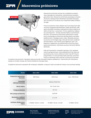 Masownica próżniowa Masownicę próżniową stosuje się w zakładach przetwórstwa mięsnego do masowania, uszlachetniania wszelkich gatunków mięs. Masownice próżniowe pozwalają na bardzo skuteczne uelastycznienie dowolnych wyrobów mięsnych bez niszczenia ich struktury oraz uwalniania białka miofibrylarnego. MAS-400V 1570 × 1340 × 1900 mm Proces masowania mięsa odbywa się w hermetycznym bębnie przez osypywanie grawitacyjne. Dzięki spiralnemu układowi mieszadeł masowany wsad płynnie krąży w bębnie od dekla do dennicy i z powrotem. Proces wyładunku odbywa się automatycznie – funkcja obrotów bębna w przeciwnym kierunku. W masownicy próżniowej zastosowano rozwiązania umożliwiające otrzymanie wysokiej jakości wyrobów wędliniarskich z każdego wsadu mięsa. Wszystkie parametry procesu technologicznego, takie jak kierunek i prędkość obrotów bębna, czas trwania poszczególnych cykli, czas włączenia i wyłączenia czy podciśnienie w komorze masowania kontrolowane i sterowane są przez sterownik Mikster MCM-023. MAS-600V 1420 × 800 × 2150 mm Cały cykl masowania i wszystkie operacje z tym związane można zaprogramować z dużą dokładnością. Raz dobrane parametry pracy można odtwarzać wiele razy (50 różnych programów) a w razie potrzeby każdą operację i parametr można w dowolnej chwili zmieniać za pomocą przycisków na pulpicie sterowniczym. Specjalnie dobrany kształt mieszadeł zwiększa dokładność i równomierność masowania. Łopaty te nie tylko masują, ale również delikatnie mieszają mięso. Urządzenia stworzone specjalnie dla mniejszym zakładów, ceniących sobie oszczędność miejsca oraz prostotę obsługi. Model MAS-400V MAS-600V MAS-XXX Pojemność gabarytowa zbiornika 400 litrów 600 litrów max. 1500 litrów Sterownik mikroprocesorowy Mikster MCM-023 do 15 obr./min Obroty bębna Pompa próżniowa AT-21A Moc pompy próżniowej 0,55 kW Nominalna szybkość pompowania 21 m3/h Zasilanie silnika pracy bębna ZASADA F A B R Y K A M A S Z Y N ~ 3f 400V / 50 Hz / 1,5 kW Biuro Zarządu ul. Bytomska 64 41-940 Piekary Śląskie ~ 3f 400V / 50 Hz / 2,5 kW Zakład Produkcyjny ul. Siemianowicka 98 41-902 Bytom ~ 3f 400V / 50 Hz WWW: E-mail: Tel.: www.zfm-online.com [email protected] +48 32 382 20 20