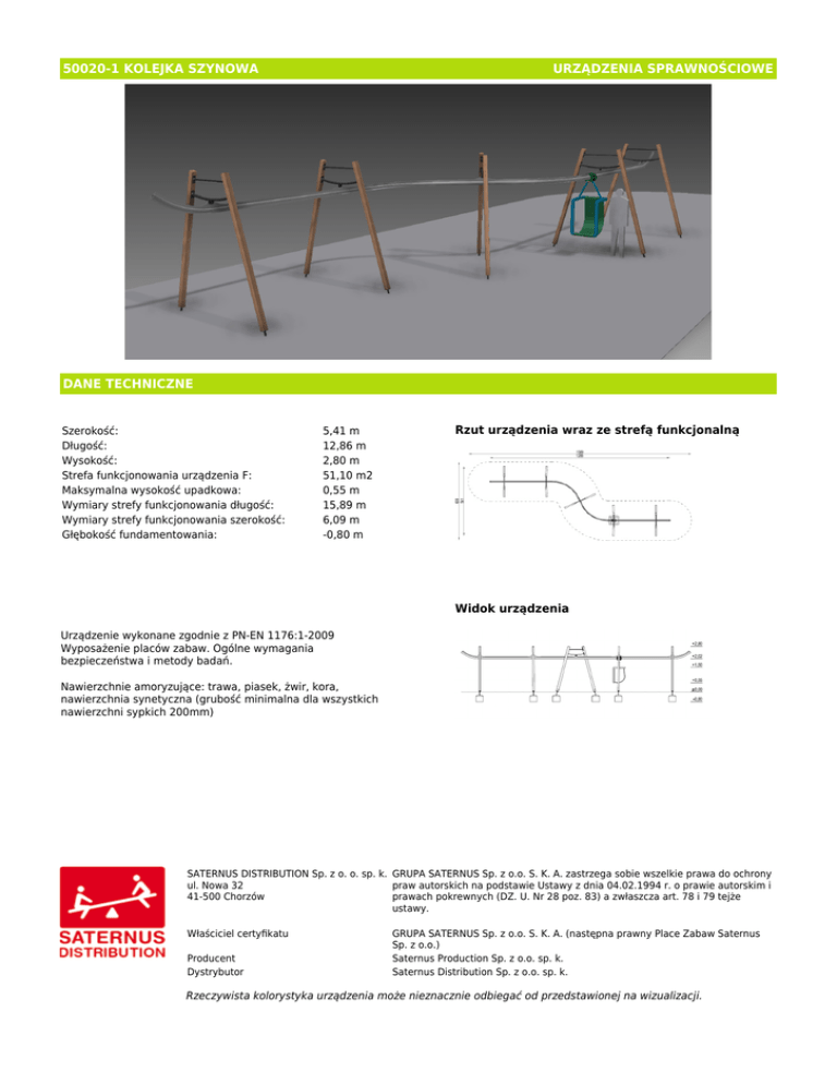 50020-1 KOLEJKA SZYNOWA URZĄDZENIA SPRAWNOŚCIOWE DANE TECHNICZNE Szerokość: Długość: Wysokość: Strefa funkcjonowania urządzenia F: Maksymalna wysokość upadkowa: Wymiary strefy funkcjonowania długość: Wymiary strefy funkcjonowania szerokość: Głębokość fundamentowania: 5,41 m 12,86 m 2,80 m 51,10 m2 0,55 m 15,89 m 6,09 m -0,80 m Rzut urządzenia wraz ze strefą funkcjonalną Widok urządzenia Urządzenie wykonane zgodnie z PN-EN 1176:1-2009 Wyposażenie placów zabaw. Ogólne wymagania bezpieczeństwa i metody badań. Nawierzchnie amoryzujące: trawa, piasek, żwir, kora, nawierzchnia synetyczna (grubość minimalna dla wszystkich nawierzchni sypkich 200mm) SATERNUS DISTRIBUTION Sp. z o. o. sp. k. GRUPA SATERNUS Sp. z o.o. S. K. A. zastrzega sobie wszelkie prawa do ochrony ul. Nowa 32 praw autorskich na podstawie Ustawy z dnia 04.02.1994 r. o prawie autorskim i 41-500 Chorzów prawach pokrewnych (DZ. U. Nr 28 poz. 83) a zwłaszcza art. 78 i 79 tejże ustawy. Właściciel certyfikatu Producent Dystrybutor GRUPA SATERNUS Sp. z o.o. S. K. A. (następna prawny Place Zabaw Saternus Sp. z o.o.) Saternus Production Sp. z o.o. sp. k. Saternus Distribution Sp. z o.o. sp. k. Rzeczywista kolorystyka urządzenia może nieznacznie odbiegać od przedstawionej na wizualizacji. MATERIAŁY Fundamenty: Kotwy: Metalowe elementy konstrukcyjne: Nogi konstrukcyjne: Siedzisko: Szyna zjazdowa: Zaślepki: beton klasy min. C12/15 stal ocynkowana kąpielowo stal czarna, ocynkowana kąpielowo, malowana proszkowo drewno klejone warstwowo, malowane lakierobejcą na kolor brązowy, zaokrąglonego na krawędziach, o przekroju 90 x 90 mm. konstrukcja stalowa powlekana gumą profil ze stali nierdzewnej tworzywo sztuczne SATERNUS DISTRIBUTION Sp. z o. o. sp. k. GRUPA SATERNUS Sp. z o.o. S. K. A. zastrzega sobie wszelkie prawa do ochrony ul. Nowa 32 praw autorskich na podstawie Ustawy z dnia 04.02.1994 r. o prawie autorskim i 41-500 Chorzów prawach pokrewnych (DZ. U. Nr 28 poz. 83) a zwłaszcza art. 78 i 79 tejże ustawy. Właściciel certyfikatu Producent Dystrybutor GRUPA SATERNUS Sp. z o.o. S. K. A. (następna prawny Place Zabaw Saternus Sp. z o.o.) Saternus Production Sp. z o.o. sp. k. Saternus Distribution Sp. z o.o. sp. k. Rzeczywista kolorystyka urządzenia może nieznacznie odbiegać od przedstawionej na wizualizacji.