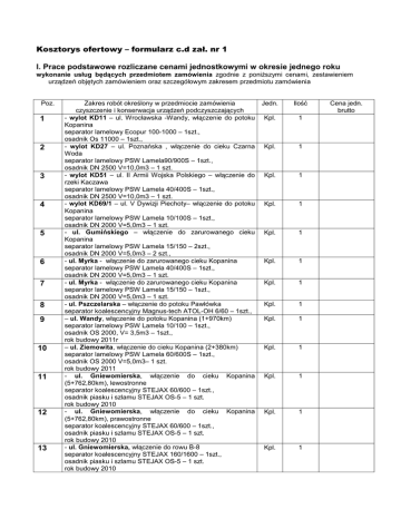 Kosztorys ofertowy – formularz c.d zał. nr 1 I. Prace podstawowe rozliczane cenami jednostkowymi w okresie jednego roku wykonanie usług będących przedmiotem zamówienia zgodnie z poniŜszymi cenami, zestawieniem urządzeń objętych zamówieniem oraz szczegółowym zakresem przedmiotu zamówienia Poz. 1 2 3 4 5 6 7 8 9 10 11 12 13 Zakres robót określony w przedmiocie zamówienia Jedn. czyszczenie i konserwacja urządzeń podczyszczających - wylot KD11 – ul. Wrocławska -Wandy, włączenie do potoku Kpl. Kopanina separator lamelowy Ecopur 100-1000 – 1szt., osadnik Os 11000 – 1szt., - wylot KD27 – ul. Poznańska , włączenie do cieku Czarna Kpl. Woda separator lamelowy PSW Lamela90/900S – 1szt., osadnik DN 2500 V=10,0m3 – 1 szt. - wylot KD51 – ul. II Armii Wojska Polskiego – włączenie do Kpl. rzeki Kaczawa separator lamelowy PSW Lamela 40/400S – 1szt., osadnik DN 2500 V=10,0m3 – 1 szt. - wylot KD69/1 – ul. V Dywizji Piechoty– włączenie do potoku Kpl. Kopanina separator lamelowy PSW Lamela 10/100S – 1szt., osadnik DN 2000 V=5,0m3 – 1 szt. - ul. Gumińskiego – włączenie do zarurowanego cieku Kpl. Kopanina separator lamelowy PSW Lamela 15/150 – 2szt., osadnik DN 2000 V=5,0m3 – 2 szt., - ul. Myrka - włączenie do zarurowanego cieku Kopanina Kpl. separator lamelowy PSW Lamela 40/400S – 1szt., osadnik DN 2000 V=5,0m3 – 1 szt. - ul. Myrka - włączenie do zarurowanego cieku Kopanina Kpl. separator lamelowy PSW Lamela 15/150 – 1szt., osadnik DN 2000 V=5,0m3 – 1 szt. - ul. Pszczelarska – włączenie do potoku Pawłówka Kpl. separator koalescencyjny Magnus-tech ATOL-OH 6/60 – 1szt., – ul. Wandy, włączenie do potoku Kopanina (1+970km) Kpl. separator lamelowy PSW Lamela 10/100 – 1szt., osadnik OS 2000, V= 3,5m3 – 1szt., rok budowy 2011r – ul. Ziemowita, włączenie do cieku Kopanina (2+380km) Kpl. separator lamelowy PSW Lamela 60/600S – 1szt., osadnik OS 2000 V=5,0m3– 1 szt. rok budowy 2011 - ul. Gniewomierska, włączenie do cieku Kopanina Kpl. (5+762,80km), lewostronne separator koalescencyjny STEJAX 60/600 – 1szt., osadnik piasku i szlamu STEJAX OS-5 – 1 szt. rok budowy 2010 - ul. Gniewomierska, włączenie do cieku Kopanina Kpl. (5+762,80km), prawostronne separator koalescencyjny STEJAX 60/600 – 1szt., osadnik piasku i szlamu STEJAX OS-5 – 1 szt. rok budowy 2010 - ul. Gniewomierska, włączenie do rowu B-8 Kpl. separator koalescencyjny STEJAX 160/1600 – 1szt., osadnik piasku i szlamu STEJAX OS-5 – 1 szt. rok budowy 2010 Ilość 1 1 1 1 1 1 1 1 1 1 1 1 1 Cena jedn. brutto I ETAP 14 RAZEM Cena jednostkowa za jednorazowe czyszczenie i konserwację urządzeń podczyszczających wymienionych w poz. 1-13 ( A = Ʃpoz.1-13 ) - ul. Chojnowska, piaskownik, włączenie do cieku Pawłówka II ETAP RAZEM Cena jednostkowa za jednorazowe czyszczenie i konserwację urządzeń podczyszczających wymienionych w poz. 1-14 ( B = A + poz.14 = Ʃpoz.1-14 ) I + II ETAP RAZEM Cena jednostkowa za czyszczenie i konserwację wszystkich urządzeń podczyszczających wymienionych w okresie 1 roku ( C = A x 2 + poz. 14 = A + B ) II. Wartość kosztorysowa robót ogółem w okresie 1 roku …...............................................zł netto + Vat ….......... = ….............................................. zł brutto słownie : …............................................................................................................................................ III. Wartość kosztorysowa robót ogółem w okresie trwania zamówienia (wartość robót w okresie 1 roku x 4 ) …................................................ zł brutto x 4 = ….................................................................zł brutto słownie : …............................................................................................................................................
