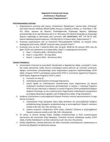 Regulamin Promocji pod nazwą „Punktonauci: Rywalizacja” zwany dalej („Regulaminem”) POSTANOWIENIA OGÓLNE 1. Organizatorem promocji pod nazwą „Punktonauci: Rywalizacja”, zwanej dalej „Promocją” jest Polski Koncern Naftowy ORLEN Spółka Akcyjna z siedzibą w Płocku, ul. Chemików 7, 09411 Płock, wpisana do Rejestru Przedsiębiorców Krajowego Rejestru Sądowego prowadzonego przez Sąd Rejonowy dla m.st. Warszawy XIV Wydział Gospodarczy Krajowego Rejestru Sądowego w Warszawie pod numerem: KRS 0000028860, NIP: 774 00 01 454, kapitał zakładowy/kapitał wpłacony: 534.636.326,25 zł (zwana dalej „Organizatorem”). 2. Promocja organizowana jest na terytorium Rzeczypospolitej Polskiej, na stacjach paliw działających pod marką „ORLEN” (zwanych dalej „Stacjami Paliw”). 3. Promocja trwa od dnia 1 kwietnia 2016 roku od godz. 00:00 do 30 czerwca 2016 roku do godz. 23:59 i jest podzielona na 3 etapy (dalej „Etap”) z następującymi terminami: a. Etap I: 1 kwietnia 2016 – 30 kwietnia 2016, b. Etap II: 1 maja 2016 – 31 maja 2016, c. Etap III: 1 czerwca 2016 – 30 czerwca 2016. ZASADY PROMOCJI 4. Uczestnikiem Promocji na warunkach określonych w Regulaminie (dalej „Uczestnik”), może być każda pełnoletnia osoba fizyczna posiadająca pełną zdolność do czynności prawnych, będąca uczestnikiem prowadzonego przez Organizatora programu lojalnościowego VITAY (dalej „Program VITAY”), posiadająca ważną Kartę VITAY w rozumieniu regulaminu Programu VITAY (dalej „Regulamin Programu VITAY”), która: a. ma konto na vitay.pl, b. zaakceptuje postanowienia niniejszego Regulaminu, c. wyrazi zgodę na automatyczne przetwarzanie przez Organizatora jej danych osobowych (analityka biznesowa) gromadzonych w związku z realizacją Programu VITAY (w tym informacji o nabytych w ramach Programu VITAY produktach/usługach objętych Promocją), w celu ustalenia przez Organizatora indywidualnie przypisanych jej progów zakupowych zgodnie z pkt 13 Regulaminu (dalej „Progi Zakupowe”). 5. Każdemu Uczestnikowi w poszczególnych Etapach Promocji zostaną zaprezentowane na jego koncie na vitay.pl: a. indywidualne Progi Zakupowe, które będą określone dla poszczególnych kategorii produktów/usług (kategorie produktów/usług w poszczególnych Etapach wskazane zostały w pkt 14a, 15a i 16a poniżej), oraz b. zadania związane z Programem VITAY (dalej „Zadania”) (Zadania w poszczególnych Etapach wskazane zostały w pkt 14b, 15b i 16b poniżej). 6. Za zakup, w okresie danego Etapu, każdego produktu/usługi w ilości przekraczającej wyznaczony dla Uczestnika Próg Zakupowy, Uczestnik otrzyma dodatkowe punkty VITAY (dalej „Punkty Dodatkowe”), w ilości wskazanej w pkt 14a, 15a i 16a poniżej. 7. Punkty Dodatkowe, zostaną doliczone do salda Uczestnika automatycznie, każdorazowo w terminie do 48 godzin od dokonania zakupu. 8. Jeżeli w okresie trwania danego Etapu Uczestnik osiągnie Progi Zakupowe dotyczące co najmniej trzech dowolnych kategorii wyznaczonych dla danego Etapu i spełni co najmniej dwa z trzech Zadań wyznaczonych dla danego Etapu, liczba przyznanych Uczestnikowi w danym Etapie Punktów Dodatkowych zostanie podwojona. 9. Punkty za spełnienie przez Uczestnika warunku określonego w pkt 8 powyżej, zostaną doliczone do salda Uczestnika nie później niż do 5 dnia miesiąca następującego po zakończeniu danego Etapu. 10. Dodatkowo każdy Uczestnik otrzyma po 100 punktów VITAY za udział w danym Etapie Promocji. 11. Zgromadzone w Promocji punkty podlegają wymianie na nagrody i kupony, na zasadach określonych w Regulaminie Programu VITAY. 12. Promocja może być łączona z innymi promocjami oferowanymi przez Organizatora. 13. Próg zakupowy, tj. ilość produktów/usług, którą musi przekroczyć Uczestnik, aby uzyskać Dodatkowe Punkty jest ustalana indywidualnie, w każdym Etapie dla każdego Uczestnika na podstawie analizy jego dotychczasowej historii zakupowej dotyczącej produktów/usług objętych Promocją (tj. na podstawie informacji o ilości nabytych przez Uczestnika - przed przystąpieniem do Promocji - produktów/usług z użyciem karty VITAY). Uczestnikom o takiej samej historii zakupowej produktów/usług objętych Promocją przedstawione zostaną jednakowe Progi Zakupowe. Dokonanie przez Organizatora analizy w celu ustalenia indywidualnego Progu Zakupowego jest możliwe wyłącznie po uzyskaniu uprzedniej zgody Uczestnika. Wyrażenie zgody przez Uczestnika jest dobrowolne, jednak niezbędne, aby wziąć udział w Promocji. SZCZEGÓŁOWE WARUNKI PROMOCJI W POSZCZEGÓLNYCH ETAPACH 14. Etap I: a. Kategorie produktów/usług, w których zostaną wyznaczone indywidualne Progi Zakupowe wraz z liczbą Punktów Dodatkowych za zakup w Etapie I każdego produktu/usługi po przekroczeniu wyznaczonego Uczestnikowi Progu Zakupowego: Kategoria produktu Punkty Dodatkowe: i. Kawa standard (210 ml lub 70 ml) / mega (420 ml) 50 / 100 (za 1 szt.) ii. Hot-dog standard / mega 50 / 100 (za 1 szt.) iii. Paliwo Pb lub ON / LPG 6 / 4 (za 1 litr) iv. Kawa mielona lub ziarnista Stop Cafe 250g 300 (za 1 szt.) v. Ciastko z oferty Stop Cafe 100 (za 1 szt.) b. Zadania związane z Programem VITAY: i. Zadanie I: użycie w okresie trwania Etapu I aplikacji mobilnej VITAY do celu naliczenia punktów VITAY za zakupy na Stacji Paliw, lub ii. Zadanie II: wyrażenie przed lub w trakcie trwania Etapu I (poprzez zaznaczenie odpowiednich znaczników po zalogowaniu do serwisu www.vitay.pl w sekcji Moje Konto) co najmniej trzech z czterech następujących zgód: 1. Zgoda na dedykowaną ofertę handlową, 2. Zgoda na Promocje i Marketing Partnerów VITAY, 3. Zgoda na otrzymywanie informacji handlowych drogą elektroniczną, 4. Zgoda na wykorzystywanie telekomunikacyjnych urządzeń końcowych. Treść poszczególnych zgód dostępna na www.vitay.pl w sekcji Moje Konto. iii. Zadanie III (zadanie edukacyjne): lepsze poznanie Programu VITAY poprzez wykonanie w