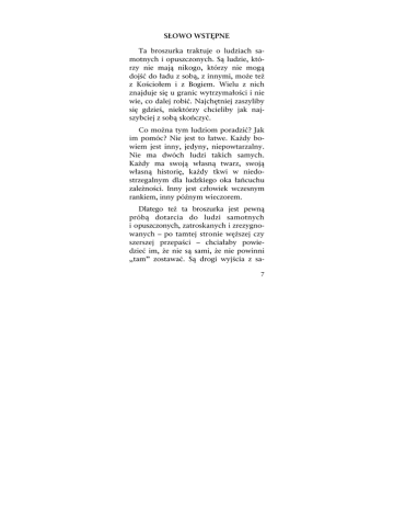 SŁOWO WSTĘPNE Ta broszurka traktuje o ludziach samotnych i opuszczonych. Są ludzie, którzy nie mają nikogo, którzy nie mogą dojść do ładu z sobą, z innymi, może też z Kościołem i z Bogiem. Wielu z nich znajduje się u granic wytrzymałości i nie wie, co dalej robić. Najchętniej zaszyliby się gdzieś, niektórzy chcieliby jak najszybciej z sobą skończyć. Co można tym ludziom poradzić? Jak im pomóc? Nie jest to łatwe. Każdy bowiem jest inny, jedyny, niepowtarzalny. Nie ma dwóch ludzi takich samych. Każdy ma swoją własną twarz, swoją własną historię, każdy tkwi w niedostrzegalnym dla ludzkiego oka łańcuchu zależności. Inny jest człowiek wczesnym rankiem, inny późnym wieczorem. Dlatego też ta broszurka jest pewną próbą dotarcia do ludzi samotnych i opuszczonych, zatroskanych i zrezygnowanych – po tamtej stronie węższej czy szerszej przepaści – chciałaby powiedzieć im, że nie są sami, że nie powinni „tam” zostawać. Są drogi wyjścia z sa7 motności i ścieżki ratunkowe, które – by zostać przy porównaniu – prowadzą ponad przepaścią. Nie wszystko, co można by na ten temat powiedzieć, mogło tu zostać napisane. Albowiem to, czy udręczonemu człowiekowi uda się przezwyciężyć nędzę osamotnienia, zależy od wielu czynników – od temperamentu, dobrej woli, rozmiarów odosobnienia, wreszcie – od Bożej pomocy. Nikt nie może przyjść do Pana, jeżeli go nie pociągnie Ojciec (J 6,44). Jednocześnie broszurka ta skierowana jest do wszystkich, którzy powinni starać się, aby w ich otoczeniu było mniej samotności, opuszczenia, mniej cierpienia i łez. Na drzwiach pewnego kościoła można było przeczytać: „Poszukaj kogoś samotnego”. Zdanie, które dotyczy każdego chrześcijanina – bez wyjątku. Nasz chory świat potrzebuje wielu ludzi gotowych do niesienia pomocy! Te wywody są podyktowane szczęśliwym doświadczeniem autorów, że w ludziach tkwi wiele złota, także tam, gdzie trudno się go spodziewać. Wciąż można obserwować, jak ludzie przełamują się, gdy mają bezpośrednio do 8 czynienia z nieszczęściem. Ci ludzie wiedzą – zazwyczaj na gruncie własnych doświadczeń – jak ważne jest podstawowe wyzwanie ludzkiego współżycia: Niech każdy ma na oku nie tylko swoje własne sprawy, ale też i drugich (Flp 2,4). Niech ta broszurka – podyktowana praktyką i pisana dla potrzeb praktycznych – będzie małym krokiem do tego, żeby coraz więcej ludzi mogło powiedzieć: „Nie poddam się – wezmę się znów w garść – warto jest żyć”. Niech będzie ponadto skromnym, ale uporczywym apelem do wszystkich o wsparcie pełne siły i odwagi, miłości i oddania – dla tych, którzy – jak chory przy sadzawce Betesda – nie mają nikogo i potrzebują pomocy. 9 10 I. SAMOTNOŚĆ MA WIELE TWARZY „Ludzie są bardziej samotni niż się wydaje”. Ta wypowiedź pewnego doświadczonego duszpasterza może nastroić melancholijnie. Żyje się tak po prostu, z dnia na dzień, i sądzi się, że wszystko jest w najlepszym porządku. Ale pozory mylą. Od czasu do czasu jest się zaskakiwanym zdarzeniami, które świadczą o czymś zgoła przeciwnym. W rubryce „zaginieni” jednego z dzienników można było przeczytać, co następuje: Pan Wagner (nazwisko zmienione) zalegał z opłatami za gaz i wodę. Nie płacił także za prenumeratę swojej gazety. Pisemne upomnienia pozostawały bez odpowiedzi. W końcu przy użyciu siły wyłamano drzwi do jego mieszkania. Wtedy milczenie tego człowieka wyjaśniło się. Pan Wagner leżał martwy na kanapie. Nikt za nim nie tęsknił, nikt nie zwrócił uwagi na jego nieobecność. Pan Wagner nie mógł dojść do ładu ze swoim życiem. Żonę stracił jakiś czas temu, syn mieszkał daleko i nie 11 troszczył się o ojca. W wielkim domu czynszowym 70-letni rencista nie miał nikogo, z kim mógłby porozmawiać. Samotność, lodowaty chłód otoczenia, milczące mijanie się w pośpiechu – staruszek nie mógł już tego wszystkiego wytrzymać. Nerwy nie wytrzymały, zaszył się w swoim mieszkaniu. Doświadczył na własnej skórze tego wszystkiego, co pewien samotny człowiek wyraził kiedyś tymi słowami: „Nigdzie człowiek nie jest tak samotny, jak pomiędzy ludźmi”. Jak zmarł – nie wiadomo. Gdy wdarła się do niego policja, był już martwy. Urzędy zwróciły na niego uwagę, ponieważ nie płacił rachunków. Pan Wagner został przez swoje otoczenie całkowicie zapomniany. To wydarzenie nie jest niczym wyjątkowym. Ciągle zdarza się, że ludzie leżą gdzieś całe tygodnie, nawet miesiące, aż natkną się na nich przedstawiciele prawa. Na cmentarzach są groby bez nazwisk, bez daty urodzenia i śmierci – i to wszystko w wieku kartotek i formularzy, komputerów i elektronicznego przetwarzania danych. 12 Można popaść w przerażenie czytając w gazecie, co następuje: gdzieś na nasypie kolejowym znaleziono zwłoki mężczyzny. Policja ocenia jego wiek na 18–20 lat. Żadnych dokumentów! Do dziś nie wiadomo, kim jest, czy stał się ofiarą wypadku, czy samobójstwa. Pochowano go na małym wiejskim cmentarzyku, jak chrześcijanina. Policja nie mogła ustalić jego nazwiska. Sprawdzono wszystkie meldunki o zaginionych, żaden nie dotyczył nieznajomego. Człowiek może żyć, umrzeć, zniknąć bez śladu w aktach, nie będąc przez nikogo zauważony ani opłakiwany. W naszych czasach – z ich pośpiechem i zabieganiem – gdy tak się przyzwyczajamy do niezwykłych zdarzeń, że przestają zwracać naszą uwagę, kusi, żeby szybko zapomnieć o tego rodzaju wypadkach i przejść do porządku dziennego. Ale tego nam nie wolno. Jest niezmiernie ważne, żeby zastanawiać się nad takimi wydarzeniami. 1. LUDZIE SKAZANI NA MILCZENIE Śmierć 70-letniego rencisty albo młodego mężczyzny na nasypie kolejowym to alarmujące sygnały, świadczące o czę13 sto nieznośnej i niewyobrażalnej wręcz samotności, w jak