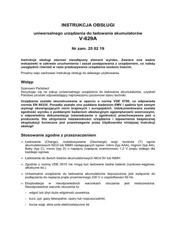 INSTRUKCJA OBSŁUGI uniwersalnego urządzenia do ładowania akumulatorów V-629A Nr zam. 25 02 19 Instrukcja obsługi stanowi nieodłączny element wyrobu. Zawiera ona ważne wskazówki w zakresie uruchomienia i zasad postępowania z urządzeniem, co należy uwzględnić również w razie przekazywania urządzenia osobom trzecim. Prosimy więc zachować Instrukcję obsługi do dalszego użytkowania. Wstęp Szanowni Państwo! Decydując się na zakup uniwersalnego urządzenia do ładowania akumulatorów, uzyskali Państwo produkt odpowiadający najnowszemu poziomowi stanu techniki. Urządzenie zostało skonstruowane w oparciu o normę VDE 0700, co odpowiada normie EN 60335. Ponadto zostało ono poddane badaniom EMV i spełnia tym samym wymogi obowiązujących norm krajowych i europejskich. Udokumentowana została zgodność wyrobu z poddanymi badaniom atestacyjnym egzemplarzami wzorcowymi, a odpowiednia dokumentacja (oświadczenie o zgodności) przechowywana jest u producenta. Dla utrzymania niezawodności urządzenia i zapewnienia bezpiecznej eksploatacji konieczne jest przestrzeganie przez Użytkownika niniejszej Instrukcji obsługi! Stosowanie zgodne z przeznaczeniem • Ładowanie (Charge), rozładowywanie (Discharge) wzgl. kontrola (T) ogniw akumulatorowych NiCd lub NiMH następujących typów: mikro (typ AAA), mignon (typ AA), Baby (typ C), mono (typ D) o napięciu (napięcie znamionowe) 1,2 V prądu stałego dla każdego ogniwa. • Ładowanie do dwóch bloków akumulatorowych NiCd 9V lub NiMH • Zgodnie z normą VDE 0510 nie mogą być ładowane żadne baterie (cynkowo-węglowe, alkaliczne itd.). • Uniwersalne urządzenie do ładowania akumulatorów dopuszczone jest wyłącznie do podłączenia do napięcia prądu przemiennego 230 V o częstotliwości 50 Hz. • Eksploatacja w nieodpowiednich Nieodpowiednie warunki otoczenia to: warunkach otoczenia - wilgoć lub zbyt duża wilgotność powietrza, - kurz, pył, gazy łatwopalne, opary lub rozpuszczalniki, - burze wzgl. silne pola elektrostatyczne itd. jest niedozwolona. Zastosowanie, odbiegające od uprzednio opisanego, prowadzi do uszkodzenia wyrobu, co dodatkowo związane jest np. z ryzykiem zwarcia, pożaru, porażenia prądem itp. Nie wolno dokonywać przeróbek czy modyfikacji w obrębie urządzenia! Należy bezwzględnie przestrzegać wskazań dot. bezpieczeństwa pracy urządzenia. Elementy obsługi 1. 2. 3. 4. 5. Urządzenie do ładowania akumulatorów Przewód zasilający (sieciowy) dwubiegunowy, bez zestyku ochronnego Lampka kontrolna Przełącznik kontroli (Test - T), ładowania (Charge „C”) i rozładowywania (Discharge „D”) Kieszenie ładowania: 4 x dla ogniw typu AAA, AA, C i D oraz 2 x dla bloku akumulatorowego (8,4 V) 6. Diody świecące kontroli ładowania 7. Tabela prądów ładowania (spód obudowy) Spis treści Wstęp Stosowanie zgodne z przeznaczeniem Elementy obsługi Spis treści Wskazania dot. bezpieczeństwa pracy Opis funkcjonowania Podłączenie, uruchomienie, ładowanie Rozładowywanie Kontrola (naładowania) Usuwanie urządzenia po upływie żywotności Usuwanie zakłóceń Konserwacja Dane techniczne strona 1 1 2 2 3 4 4 5 5 5 6 6 6 Wskazania dot. bezpieczeństwa pracy W razie uszkodzeń spowodowanych nieprzestrzeganiem niniejszej Instrukcji Obsługi następuje ustanie roszczeń z tytułu gwarancji! Nie ponosimy żadnej odpowiedzialności za szkody powstałe w dalszej konsekwencją takiego postępowania! Nie ponosimy również odpowiedzialności za szkody za szkody materialne czy szkody na zdrowiu lub życiu osób powstałe wskutek niekompetentnego obchodzenia się z produktem lub nieprzestrzegania Wskazań dot. bezpieczeństwa pracy! W takich przypadkach także wygasają wszelkie roszczenia gwarancyjne. Konstrukcja urządzenia odpowiada klasie ochrony II. Dwubiegunowy przewód zasilający EURO jest w sposób trwały połączony z obudową. Należy uważać, by izolacja (obudowy wzgl. przewodu sieciowego) nie uległa uszkodzeniu ani zniszczeniu. Urządzenia do ładowania akumulatorów i akcesoria muszą być przechowywane w miejscach niedostępnych dla dzieci. W jednostkach prowadzących działalność gospodarczą należy przestrzegać przepisów prewencji wypadkowej przemysłowych organizacji branżowych (przepisy dla urządzeń elektrycznych i środków produkcji). W szkołach, placówkach edukacyjnych i warsztatach amatorskich eksploatacja urządzeń do ładowania akumulatorów wraz z akcesoriami winna być nadzorowana przez przeszkolony personel. Urządzenie należy uruchamiać jedynie po dokładnym zamknięciu i przykręceniu obudowy. Urządzenia do ładowania akumulatorów nie mogą być pozostawione podczas eksploatacji bez nadzoru. W przypadku uszkodzenia zasilacze sieciowe i urządzenia do ładowania akumulatorów mogą wytwarzać stanowiące zagrożenie napięcie stałe powyżej 50 V, również wtedy, gdy podane napięcie wyjściowe tych urządzeń jest niższe. Podczas prac prowadzonych pod napięciem dopuszczonych do stosowania w tym celu. wolno używać wyłącznie narzędzi wyraźnie Należy unikać eksploatacji w nieodpowiednich warunkach otoczenia. Prowadzi to do uszkodzenia wrażliwej części elektronicznej wewnątrz urządzenia, a tym samym do ewentualnego narażenia życia Użytkownika. Nieodpowiednie warunki otoczenia to: - zbyt duża wilgotność powietrza (wilgotność wzgl. > 75 %, tworzenie się skroplin), - wilgoć, - kurz, pył, gazy łatwopalne, opary lub rozpuszczalniki, benzyna, - zbyt wysoka temperatura otoczenia (> ok. +40°C), - silne pola elektromagnetyczne (silniki lub transformatory) wzgl. elektrostatyczne (doładowanie). Podczas ładowania akumulatorów prosimy koniecznie przestrzegać przepisów producenta w zakresie ładowania odnośnych akumulatorów. W razie niekompetentnego obchodzenia się z akumulatorem (zbyt duży prąd ładowania lub odwrócenie biegunów) może dojść do jego przeładowania wzgl. zniszczenia. W najgorszym wypadku możliwe jest 