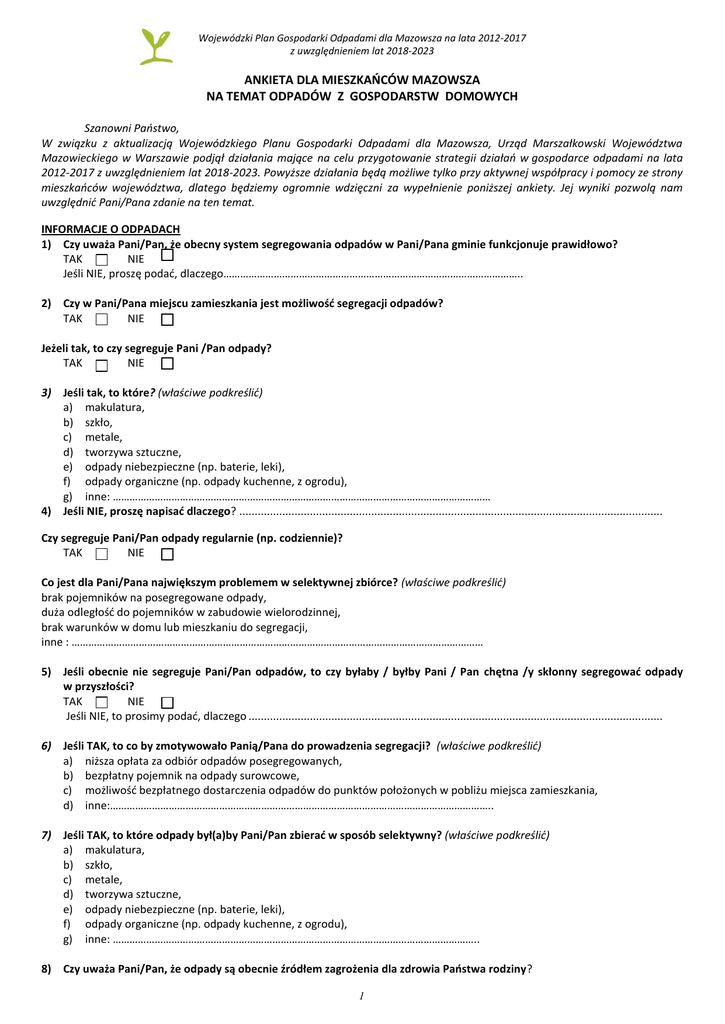 Wojewódzki Plan Gospodarki Odpadami dla Mazowsza na lata 2012-2017 z uwzględnieniem lat 2018-2023 ANKIETA DLA MIESZKAOCÓW MAZOWSZA NA TEMAT ODPADÓW Z GOSPODARSTW DOMOWYCH Szanowni Paostwo, W związku z aktualizacją Wojewódzkiego Planu Gospodarki Odpadami dla Mazowsza, Urząd Marszałkowski Województwa Mazowieckiego w Warszawie podjął działania mające na celu przygotowanie strategii działao w gospodarce odpadami na lata 2012-2017 z uwzględnieniem lat 2018-2023. Powyższe działania będą możliwe tylko przy aktywnej współpracy i pomocy ze strony mieszkaoców województwa, dlatego będziemy ogromnie wdzięczni za wypełnienie poniższej ankiety. Jej wyniki pozwolą nam uwzględnid Pani/Pana zdanie na ten temat. INFORMACJE O ODPADACH 1) Czy uważa Pani/Pan, że obecny system segregowania odpadów w Pani/Pana gminie funkcjonuje prawidłowo? TAK NIE Jeśli NIE, proszę podad, dlaczego…………………………………………………………………………………………….. 2) Czy w Pani/Pana miejscu zamieszkania jest możliwośd segregacji odpadów? TAK NIE Jeżeli tak, to czy segreguje Pani /Pan odpady? TAK NIE 3) Jeśli tak, to które? (właściwe podkreślid) a) makulatura, b) szkło, c) metale, d) tworzywa sztuczne, e) odpady niebezpieczne (np. baterie, leki), f) odpady organiczne (np. odpady kuchenne, z ogrodu), g) inne: ……………………………………………………………………………………………………………………… 4) Jeśli NIE, proszę napisad dlaczego? .......................................................................................................................................... Czy segreguje Pani/Pan odpady regularnie (np. codziennie)? TAK NIE Co jest dla Pani/Pana największym problemem w selektywnej zbiórce? (właściwe podkreślid) brak pojemników na posegregowane odpady, duża odległośd do pojemników w zabudowie wielorodzinnej, brak warunków w domu lub mieszkaniu do segregacji, inne : ………………………………………………………………………………………………………………………………… 5) Jeśli obecnie nie segreguje Pani/Pan odpadów, to czy byłaby / byłby Pani / Pan chętna /y skłonny segregowad odpady w przyszłości? TAK NIE Jeśli NIE, to prosimy podad, dlaczego ....................................................................................................................................... 6) Jeśli TAK, to co by zmotywowało Panią/Pana do prowadzenia segregacji? (właściwe podkreślid) a) niższa opłata za odbiór odpadów posegregowanych, b) bezpłatny pojemnik na odpady surowcowe, c) możliwośd bezpłatnego dostarczenia odpadów do punktów położonych w pobliżu miejsca zamieszkania, d) inne:……………………………………………………………………………………………………………………….. 7) Jeśli TAK, to które odpady był(a)by Pani/Pan zbierad w sposób selektywny? (właściwe podkreślid) a) makulatura, b) szkło, c) metale, d) tworzywa sztuczne, e) odpady niebezpieczne (np. baterie, leki), f) odpady organiczne (np. odpady kuchenne, z ogrodu), g) inne: ………………………………………………………………………………………………………………….. 8) Czy uważa Pani/Pan, że odpady są obecnie źródłem zagrożenia dla zdrowia Paostwa rodziny? 1 Wojewódzki Plan Gospodarki Odpadami dla Mazowsza na lata 2012-2017 z uwzględnieniem lat 2018-2023 TAK NIE 9) Jaką kwotę przeznacza Pani/Pan miesięcznie na opłaty za odpady? ............................................................................................................................................................................................... 10) Czy byłaby Pani/Pan skłonna/y przeznaczyd na ten cel większą kwotę wiedząc, że w ten sposób chroni się ludzi i środowisko naturalne? TAK NIE Jeśli TAK, proszę podad maksymalną miesięczną kwotę możliwą do przeznaczenia przez Panią/Pana na ten cel: .…………….. 11) Od 2013 gminy powinny wprowadzid opłaty za przejęcie od mieszkaoców obowiązku zagospodarowania odpadów komunalnych. Realizacji jakich działao oczekuje Pani/Pan w ramach obowiązkowej opłaty wnoszonej przez mieszkaoców na rzecz gminy (można zaznaczyd kilka możliwości): a) zapewnienia odbioru odpadów bez ich wstępnej segregacji, bez względu na cenę za usługę; b) możliwości ponoszenia niższej opłaty, w przypadku przekazywania przez mieszkaoców odpadów posegregowanych; c) możliwości bezpłatnego przekazania odpadów problematycznych (tj. odpady wielkogabarytowe, zużyty sprzęt RTV, AGD, odpady farb, lakierów, odpady z remontu mieszkao); d) informowania przez gminę o prawach i obowiązkach mieszkaoców w zakresie odpadów komunalnych; e) organizacji przez gminę wydarzeo (spotkao, konkursów, festynów, wizyt w zakładach zagospodarowania odpadów) przybliżających tematykę odpadów; f) poszukiwania bezpieczniejszych dla środowiska i taoszych metod przetwarzania odpadów komunalnych. INSTALACJE W GOSPODARCE ODPADAMI 12) Czy wie Pani/Pan jakie instalacje do przetwarzania odpadów funkcjonują w pobliżu Pani/Pana miejsca zamieszkania (składowisko odpadów, kompostownia, sortownia, instalacja termicznego unieszkodliwiania odpadów? TAK NIE Jeżeli tak, proszę je wymienid ................................................................................................................................... 13) Jaki wpływ Pani/Pana zdaniem wywiera/-ją powyższe instalacje na otoczenie? .................................................................................................................................................................................. 14) Czy uważa Pani/Pan, że są to instalacje, które stanowią zagrożenie dla zdrowia ludzi? TAK NIE 15) Czy uważa Pani/Pan, że są to instalacje, które stanowią zagroże