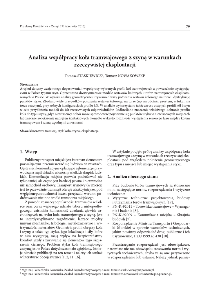 Problemy Kolejnictwa – Zeszyt 171 (czerwiec 2016) 79 Analiza współpracy koła tramwajowego z szyną w warunkach rzeczywistej eksploatacji Tomasz STAŚKIEWICZ1 , Tomasz NOWAKOWSKI2 Streszczenie Artykuł dotyczy wzajemnego dopasowania i współpracy wybranych profili kół tramwajowych z powszechnie występującymi w Polsce typami szyn. Opracowano dwuwymiarowe modele zestawów kołowych i torów tramwajowych eksploatowanych w Polsce. W wyniku analizy geometrycznej uzyskano obrazy położenia zestawu kołowego na torze i dystrybucję punktów styku. Zbadano wiele przypadków położenia zestawu kołowego na torze (np. na odcinku prostym, w łuku i na torze zużytym), przy różnych konfiguracjach profilu kół. W analizie wykorzystano także zarysy zużytych profili kół i szyn w celu przybliżenia modeli do ich rzeczywistych odpowiedników. Podkreślono znaczenie właściwego dobrania profilu koła do typu szyny, gdyż niewłaściwy dobór może spowodować pojawienie się punktów styku w niewłaściwych miejscach lub znaczne zwiększenie naprężeń kontaktowych. Ponadto wykryto możliwość wystąpienia zerowego luzu między kołem tramwajowym i szyną, zgodnymi z normami. Słowa kluczowe: tramwaj, styk koło-szyna, eksploatacja 1. Wstęp Publiczny transport miejski jest istotnym elementem pozwalającym przemieszczać się ludziom w miastach. Gęste sieci komunikacyjne oplatające aglomeracje przywodzą na myśl układ krwionośny wielkich skupisk ludzkich. Komunikacja miejska pozwala podróżować nie tylko taniej, ale często jest bardziej pewna i niezawodna niż samochód osobowy. Transport szynowy (w mieście jest to przeważnie tramwaj) oferuje atrakcyjniejsze, pod względem punktualności i czasu przejazdu, warunki podróżowania niż inne środki transportu miejskiego. Z powodu rosnącej popularności tramwajów w Polsce oraz coraz większego udziału taboru niskopodłogowego, zaistniała konieczność zbadania zjawisk zachodzących na styku koła tramwajowego z szyną. Jest to interdyscyplinarne zagadnienie, łączące między innymi mechanikę, tribologię, metaloznawstwo i wytrzymałość materiałów. Geometria profili obręczy koła i szyny, a także typ styku, jego lokalizacja i siły, które w nim występują, mają wpływ na bezpieczeństwo, komfort jazdy i zużywanie się elementów tego skojarzenia ciernego. Problem styku koła tramwajowego z szyną jest w Polsce dotychczas mało zgłębiony. Istnieje niewiele publikacji na ten temat i należy ich szukać w literaturze obcojęzycznej [1, 2, 11‒16]. 1 2 W artykule podjęto próbę analizy współpracy koła tramwajowego z szyną w warunkach rzeczywistej eksploatacji pod względem położenia geometrycznego oraz typu i miejsca lub miejsc wystąpienia styku. 2. Analiza obecnego stanu Przy budowie torów tramwajowych są stosowane m.in. następujące normy, rozporządzenia i wytyczne techniczne: Wytyczne techniczne projektowania, budowy i utrzymania torów tramwajowych [17], PN-K-92011 – Torowiska tramwajowe – Wymagania i badania [8], PN-K-92009 – Komunikacja miejska – Skrajnia budowli [7], Rozporządzenie Ministra Transportu i Gospodarki Morskiej w sprawie warunków technicznych, jakim powinny odpowiadać drogi publiczne i ich usytuowanie, Dz.U.1999.43.430 [10]. Przestrzeganie rozporządzeń jest obowiązkowe, natomiast nie ma obowiązku stosowania norm i wytycznych technicznych, chyba że są one przytoczone w rozporządzeniu lub ustawie. Należy jednak pamię- Mgr inż.; Politechnika Poznańska, Zakład Pojazdów Szynowych; e-mail: [email protected]. Mgr inż.; Politechnika Poznańska, Zakład Pojazdów Szynowych; e-mail: [email protected]. Staśkiewicz T., Nowakowski T. 80 tać o tym, że normy i wytyczne zawierają wiedzę popartą doświadczeniem eksploatacyjnym, stąd ich stosowanie może być korzystne dla jakości funkcjonowania systemu tramwajowego. Trzeba pamiętać również, że są to zapisy w dużej części powstałe w czasach, gdy eksploatowano wyłącznie tabor wysokopodłogowy, a zwłaszcza pojazd typu Konstal 105N. W związku z tym niektóre sformułowania są niejasne lub nie mogą być odniesione do współczesnych pojazdów. W Polsce do budowy torowisk tramwajowych wykorzystuje się szyny kolejowe (49E1, 60E1) oraz rowkowe (59R2, 60R2 i starsze 180S i 180P). W każdym systemie tramwajowym, w zależności od potrzeb spotyka się zarówno szyny kolejowe, jak i rowkowe. Z obserwacji autorów wynika, że szyny rowkowe, które powinny być stosowane w sytuacjach określonych w wytycznych technicznych, bywają wykorzystywane w nieuzasadnionych lokalizacjach (torowisko wydzielone, tor prosty) [17]. Obecnie najpowszechniej stosowanymi szynami są 49E1 oraz 60R2. Wyróżnia się następujące profile obręczy kół: T, PST i TW. Profil T jest najstarszym, stożkowym profilem, który według [3] miał być wycofany z końcem 2001 roku. Profil PST zaprojektowano dla Poznańskiego Szybkiego Tramwaju w latach dziewięćdziesiątych ubiegłego wieku na podstawie obserwacji profili zużytych, natomiast profil TW będący modyfikacją profilu T, jest wykorzystywany jedynie lokalnie w Warszawie. Na rysunku 1 przedstawiono porównanie zarysów profili T i PST. Zwraca uwagę fakt, że profile według rysunku 1 różnią się wymiarem długości prowadnej (odległość między punktami atakującymi położonymi na obu kołach zestawu kołowego), co skutkuje tym, że profil T tworzy z szyną luz o wartości 2,5 mm, a profil PST – 5 mm. W Niemczech proponuje się, aby luz był nie mniejszy niż 5 mm [9]. Sprawdzenie wpływu luzu na dynamikę jazdy tramwaju oraz tempo zużywania się kół będzie prowadzone w dalszej części badań, w projekcie Lider. W związku z postępującą wymianą taboru na nowoczesny, niskopodłogowy oraz modernizacją i budowa torów, pojawiła się potrzeba aktualizacji i dostosowania istniejących wytycznych oraz przepisów do nowych warunków. Wskazana byłaby także ich nauko