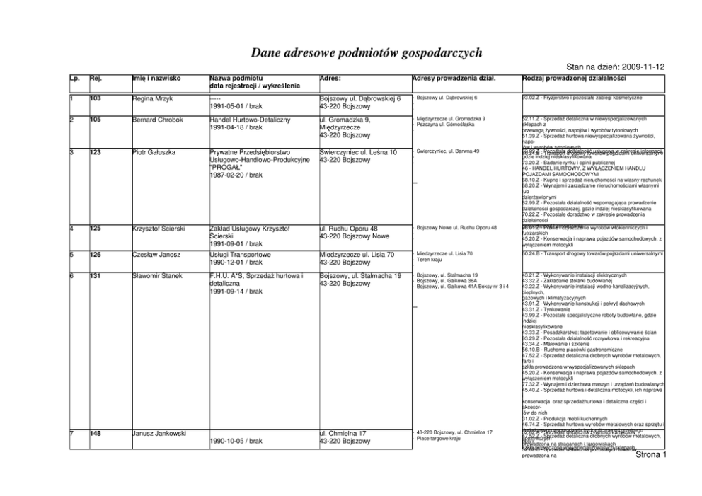 Dane adresowe podmiotów gospodarczych Stan na dzień: 2009-11-12 Lp. Rej. Imię i nazwisko Nazwa podmiotu data rejestracji / wykreślenia Adres: Adresy prowadzenia dział. Rodzaj prowadzonej działalności 1 103 Regina Mrzyk ----1991-05-01 / brak Bojszowy ul. Dąbrowskiej 6 43-220 Bojszowy - Bojszowy ul. Dąbrowskiej 6 - 93.02.Z - Fryzjerstwo i pozostałe zabiegi kosmetyczne 2 105 Bernard Chrobok Handel Hurtowo-Detaliczny 1991-04-18 / brak ul. Gromadzka 9, Międzyrzecze 43-220 Bojszowy - Międzyrzecze ul. Gromadzka 9 - Pszczyna ul. Górnośląska - 3 123 Piotr Gałuszka Prywatne Przedsiębiorstwo Usługowo-Handlowo-Produkcyjne "PROGAŁ" 1987-02-20 / brak Świerczyniec ul. Leśna 10 43-220 Bojszowy - Świerczyniec, ul. Barwna 49 - 52.11.Z - Sprzedaż detaliczna w niewyspecjalizowanych sklepach z przewagą żywności, napojów i wyrobów tytoniowych 51.39.Z - Sprzedaż hurtowa niewyspecjalizowana żywności, napojów i wyrobów tytoniowych 63.99.Z działalność usługowa w zakresie informacji, 60.24.B -- Pozostała Transport drogowy towarów pojazdami uniwersalnymi gdzie indziej niesklasyfikowana 73.20.Z - Badanie rynku i opinii publicznej 46 - HANDEL HURTOWY, Z WYŁĄCZENIEM HANDLU POJAZDAMI SAMOCHODOWYMI 68.10.Z - Kupno i sprzedaż nieruchomości na własny rachunek 68.20.Z - Wynajem i zarządzanie nieruchomościami własnymi lub dzierżawionymi 82.99.Z - Pozostała działalność wspomagająca prowadzenie działalności gospodarczej, gdzie indziej niesklasyfikowana 70.22.Z - Pozostałe doradztwo w zakresie prowadzenia działalności gospodarczej i zarządzania 96.01.Z - Pranie i czyszczenie wyrobów włókienniczych i futrzarskich 45.20.Z - Konserwacja i naprawa pojazdów samochodowych, z wyłączeniem motocykli _ _ 4 125 Krzysztof Ścierski Zakład Usługowy Krzysztof Ścierski 1991-09-01 / brak ul. Ruchu Oporu 48 43-220 Bojszowy Nowe - Bojszowy Nowe ul. Ruchu Oporu 48 - 5 126 Czesław Janosz Usługi Transportowe 1990-12-01 / brak Miedzyrzecze ul. Lisia 70 43-220 Bojszowy - Miedzyrzecze ul. Lisia 70 - Teren kraju - _ 60.24.B - Transport drogowy towarów pojazdami uniwersalnymi 6 131 Sławomir Stanek F.H.U. A*S, Sprzedaż hurtowa i detaliczna 1991-09-14 / brak Bojszowy, ul. Stalmacha 19 43-220 Bojszowy - Bojszowy, ul. Stalmacha 19 - Bojszowy, ul. Gaikowa 36A - Bojszowy, ul. Gaikowa 41A Boksy nr 3 i 4 43.21.Z - Wykonywanie instalacji elektrycznych 43.32.Z - Zakładanie stolarki budowlanej 43.22.Z - Wykonywanie instalacji wodno-kanalizacyjnych, cieplnych, gazowych i klimatyzacyjnych 43.91.Z - Wykonywanie konstrukcji i pokryć dachowych 43.31.Z - Tynkowanie 43.99.Z - Pozostałe specjalistyczne roboty budowlane, gdzie indziej niesklasyfikowane 43.33.Z - Posadzkarstwo; tapetowanie i oblicowywanie ścian 93.29.Z - Pozostała działalność rozrywkowa i rekreacyjna 43.34.Z - Malowanie i szklenie 56.10.B - Ruchome placówki gastronomiczne 47.52.Z - Sprzedaż detaliczna drobnych wyrobów metalowych, farb i szkła prowadzona w wyspecjalizowanych sklepach 45.20.Z - Konserwacja i naprawa pojazdów samochodowych, z wyłączeniem motocykli 77.32.Z - Wynajem i dzierżawa maszyn i urządzeń budowlanych 45.40.Z - Sprzedaż hurtowa i detaliczna motocykli, ich naprawa i konserwacja oraz sprzedażhurtowa i detaliczna części i akcesoriów do nich 31.02.Z - Produkcja mebli kuchennych 46.74.Z - Sprzedaż hurtowa wyrobów metalowych oraz sprzętu i dodatkowego wyposażenia hydraulicznego i grzejnego 52.62.A - Sprzedaż detaliczna żywności i artykułów 47.52.Z - Sprzedaż detaliczna drobnych wyrobów metalowych, spożywczych farb i prowadzona na straganach i targowiskach szkła prowadzona wyspecjalizowanych 52.62.B - Sprzedażwdetaliczna pozostałychsklepach towarów _ 7 148 Janusz Jankowski 1990-10-05 / brak ul. Chmielna 17 43-220 Bojszowy - 43-220 Bojszowy, ul. Chmielna 17 - Place targowe kraju _ prowadzona na Strona 1 Lp. Rej. Imię i nazwisko 7 148 Janusz Jankowski 8 156 Henryk Kostyra 9 159 Gabriel Lotawiec Nazwa podmiotu data rejestracji / wykreślenia Adres: Adresy prowadzenia dział. Rodzaj prowadzonej działalności ul. Chmielna 17 - straganach i targowiskach Kostyra Henryk Handel art. spoż. przem. i gastronomia 1992-01-31 / brak ul. Św.Jana 56 43-220 Bojszowy - ul. Św. Jana 56, 43-220 Bojszowy 47 - HANDEL DETALICZNY, Z WYŁĄCZENIEM HANDLU DETALICZNEGO POJAZDAMI SAMOCHODOWYMI - 43-220 Bojszowy, ul. Świętego Jana 58 - Sklep 55 - ZAKWATEROWANIE spożywczo-przemysłowy; 43-220 Bojszowy, ul. 56 - DZIAŁALNOŚĆ USŁUGOWA ZWIĄZANA Z Świętego Jana 48 - Drink Bar "Dworski" WYŻYWIENIEM Handel i Usługi 1992-01-20 / brak Bojszowy ul. Bliska 1 43-220 Bojszowy - Bojszowy ul. Gaikowa 32 - Bojszowy ul. Bliska 1 - 41-214 Sosnowiec, ul. Stawowa 4 _ _ 10 167 Zygmunt Wójcik 11 169 Józef Fuchs 12 19 13 20 ul. Kręta 11. 43-220 Świerczyniec - Bieruń ul.Licealna 17 - Urbanowice ul. Oświęcimska 192 - Place targowe kraju STUDIO FOTOGRAFICZNE, Ośrodek Szkolenia Kierowców 1992-03-01 / brak Bojszowy ul. Bliska 26 43-220 Bojszowy - 43-220 Bojszowy, ul. Bliska 26 - Hubert Tatoj -----1986-09-01 / brak Bojszowy Nowe ul. Ruchu Oporu 162 43-220 Bojszowy - Bojszowy Nowe ul. Ruchu Oporu 162 - Teren kraju - _ 49.41.Z - Transport drogowy towarów Wilhelm Hachuła Instalacje Hydrauliczne 1983-06-20 / brak Bojszowy, ul. Równa 1 43-220 Bojszowy - 43-220 Bojszowy, ul. Dąbrowskiej 53 - 43-220 Bojszowy, ul. Równa 1, - Teren całego kraju. _ 41 - ROBOTY BUDOWLANE ZWIĄZANE ZE WZNOSZENIEM BUDYNKÓW 42 - ROBOTY ZWIĄZANE Z BUDOWĄ OBIEKTÓW INŻYNIERII LĄDOWEJ I WODNEJ 43 - ROBOTY BUDOWLANE SPECJALISTYCZNE 25 - PRODUKCJA METALOWYCH WYROBÓW GOTOWYCH, Z WYŁĄCZENIEM MASZYN I URZĄDZEŃ 28 - PRODUKCJA MASZYN I URZĄDZEŃ, GDZIE INDZIEJ NIESKLASYFIKOWANA 22 - PRODUKCJA WYROBÓW Z GUMY I TWORZYW SZTUCZNYCH 49 - TRANSPORT LĄDOWY ORAZ TRANSPORT RUROCIĄGOWY 71 - DZIAŁALNOŚĆ W ZAKRESIE ARCHITEKTURY I INŻYNIERII; BADANIA I ANALIZY TECHNICZNE 74.12.Z - Działalność rachunkowo-księgowa 65.21.Z - Leasing finansowy 67.