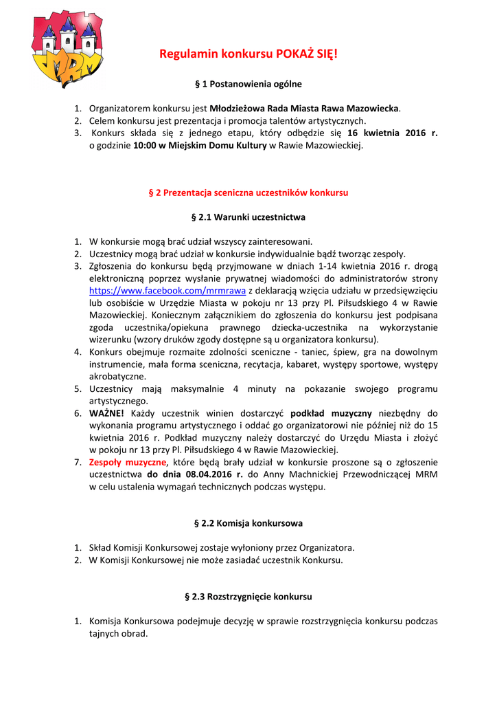 Regulamin konkursu POKAŻ SIĘ! § 1 Postanowienia ogólne 1. Organizatorem konkursu jest Młodzieżowa Rada Miasta Rawa Mazowiecka. 2. Celem konkursu jest prezentacja i promocja talentów artystycznych. 3. Konkurs składa się z jednego etapu, który odbędzie się 16 kwietnia 2016 r. o godzinie 10:00 w Miejskim Domu Kultury w Rawie Mazowieckiej. § 2 Prezentacja sceniczna uczestników konkursu § 2.1 Warunki uczestnictwa 1. W konkursie mogą brać udział wszyscy zainteresowani. 2. Uczestnicy mogą brać udział w konkursie indywidualnie bądź tworząc zespoły. 3. Zgłoszenia do konkursu będą przyjmowane w dniach 1-14 kwietnia 2016 r. drogą elektroniczną poprzez wysłanie prywatnej wiadomości do administratorów strony https://www.facebook.com/mrmrawa z deklaracją wzięcia udziału w przedsięwzięciu lub osobiście w Urzędzie Miasta w pokoju nr 13 przy Pl. Piłsudskiego 4 w Rawie Mazowieckiej. Koniecznym załącznikiem do zgłoszenia do konkursu jest podpisana zgoda uczestnika/opiekuna prawnego dziecka-uczestnika na wykorzystanie wizerunku (wzory druków zgody dostępne są u organizatora konkursu). 4. Konkurs obejmuje rozmaite zdolności sceniczne - taniec, śpiew, gra na dowolnym instrumencie, mała forma sceniczna, recytacja, kabaret, występy sportowe, występy akrobatyczne. 5. Uczestnicy mają maksymalnie 4 minuty na pokazanie swojego programu artystycznego. 6. WAŻNE! Każdy uczestnik winien dostarczyć podkład muzyczny niezbędny do wykonania programu artystycznego i oddać go organizatorowi nie później niż do 15 kwietnia 2016 r. Podkład muzyczny należy dostarczyć do Urzędu Miasta i złożyć w pokoju nr 13 przy Pl. Piłsudskiego 4 w Rawie Mazowieckiej. 7. Zespoły muzyczne, które będą brały udział w konkursie proszone są o zgłoszenie uczestnictwa do dnia 08.04.2016 r. do Anny Machnickiej Przewodniczącej MRM w celu ustalenia wymagań technicznych podczas występu. § 2.2 Komisja konkursowa 1. Skład Komisji Konkursowej zostaje wyłoniony przez Organizatora. 2. W Komisji Konkursowej nie może zasiadać uczestnik Konkursu. § 2.3 Rozstrzygnięcie konkursu 1. Komisja Konkursowa podejmuje decyzję w sprawie rozstrzygnięcia konkursu podczas tajnych obrad. 2. Komisja Konkursowa wytypuje trzech zwycięzców konkursu. Komisja może również przyznać wyróżnienia i nagrody pocieszenia. § 2.4 Nagrody 1. Dla laureatów konkursu przewidziane są nagrody rzeczowe. 2. Werdykt Komisji Konkursowej jest ostateczny i nie można się od niego odwołać. § 3 Postanowienia końcowe 1. Organizator zastrzega sobie prawo do zmiany postanowień niniejszego regulaminu przed rozpoczęciem Konkursu. 2. Organizator zastrzega sobie prawo do odwołania Konkursu bez podawania przyczyn.