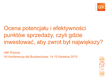 Ocena potencjału i efektywności punktów sprzedaży, czyli gdzie inwestować, aby zwrot był największy? GfK Polonia VII Konferencja dla Budownictwa, 14-15 Kwietnia 2015 © GfK 2015 | VII Konferencja dla Budownictwa. | 14-15 Kwietnia 2015 1 Informacje o firmie © GfK 2015 | VII Konferencja dla Budownictwa. | 14-15 Kwietnia 2015 2 Nasze myślenie w szerokiej perspektywie poznali już klienci w ponad 100 krajach Albania Algieria Argentyna Australia Austria Azerbejdżan Bahrajn Bangladesz Białoruś Belgia Boliwia Bośnia i Hercegowina Botswana Brazylia Bułgaria Kambodża Kanada Chile Chiny Kolumbia Chorwacja Cypr Czechy Dania Ekwador Egipt Estonia Finlandia Francja Gruzja Niemcy Grecja Gwatemala Hongkong Węgry Indie Indonezja Iran Irak Irlandia Izrael Włochy Wybrzeże Kości Słoniowej Japonia Jordania Kazachstan Kenia Korea Kuwejt Kirgistan Łotwa Liban Libia Litwa © GfK 2015 | VII Konferencja dla Budownictwa. | 14-15 Kwietnia 2015 Macedonia Malezja Meksyk Czarnogóra Maroko Mozambik Holandia Nowa Zelandia Nigeria Norwegia Oman Pakistan Panama Paragwaj Peru Filipiny Polska Portugalia Katar Rumunia Rosja Arabia Saudyjska Senegal Serbia Singapur Słowacja Słowenia Republika Południowej Afryki Hiszpania Sudan Szwecja Szwajcaria Syria Tadżykistan Tajwan Tanzania Tajlandia Tunezja Turcja Turkmenistan Uganda Ukraina Zjednoczone Emiraty Arabskie Wielka Brytania Urugwaj USA Uzbekistan Wenezuela Wietnam Jemen 3 Należymy do dziesięciu najlepszych firm zajmujących się badaniem rynku na świecie Ranking globalny Firma Sprzedaż 2013 1 US $ million Zmiana 2 % 1 Nielsen Holdings N.V. 6 045 4.0 2 Kantar* 3 389 1.6 3 IMS Health Inc. 2 544 6.1 4 Ipsos SA 2 274 0.8 5 GfK SE 1 985 0.8 6 Information Resources Inc. 845 4.1 7 Westat Inc. 583 17.0 8 dunnhumby Ldt. 454 8.8 9 INTAGE Holdings Inc. 436 6.5 The NPD Group Inc. 288 5.4 10 * Dane szacunkowe ** W roku finansowym zakończonym w marcu 2014 1 Przychody ogółem, które obejmują działalność poza badawczą, dla niektórych firm są znacznie wyższe. 2 Tempo wzrostu z roku na rok jest regulowane w taki sposób, aby nie obejmowało dochodów lub strat z nabycia lub zbycia. Źródło: Honomichl Global Top 25 Report 2015 © GfK 2015 | VII Konferencja dla Budownictwa. | 14-15 Kwietnia 2015 4 GfK Polonia zasoby 25 lat na rynku polskim (od 1990) 253 pracowników 1600 ankieterów i koordynatorów regionalnych – sieć ogólnopolska 90 mln PLN – obrót w 2013 450 laptopów do badań CAPI 8 % – wzrost względem 2012 72 stanowiska CATI (wzrost w branży: 5%) 3 miejsce w rankingu firm badawczych w Polsce 5200 podmiotów – Panel Retail & Technology 8000 gospodarstw domowych – Panel Gospodarstw Domowych GfK 8000 Media Efficiency Panel 11 000 indywidualnych uczestników – Panel indywidualny GfK 145 000 indywidualnych uczestników (online) – Access Panel GfK © GfK 2015 | VII Konferencja dla Budownictwa. | 14-15 Kwietnia 2015 5 Certyfikowana jakość Firma GfK Polonia jest członkiem międzynarodowych i krajowych organizacji, w tym: European Society for Opinion and Marketing Research Polskie Towarzystwo Badaczy Rynku i Opinii GfK Polonia posiada certyfikat Programu Kontroli Jakości Pracy Ankieterów (PKJPA) we wszystkich 8 kategoriach badań : • • • • • • • • Badania realizowane techniką ankieterskich wywiadów osobistych/ audytoryjnych – PAPI Badania realizowane techniką ankieterskich wywiadów osobistych ze wspomaganiem komputerowym – CAPI Badania realizowane techniką ankieterskich wywiadów telefonicznych z systemowym wspomaganiem komputerowym – CATI Badania CAWI Badania, w których materiał przygotowywany jest samodzielnie przez badane osoby Badania jakościowe Retail Audit Mystery Shopping © GfK 2015 | VII Konferencja dla Budownictwa. | 14-15 Kwietnia 2015 6 Bezpieczeństwo informacji Zapewniamy certyfikowaną jakość bezpieczeństwa informacji zgodnie z najwyższymi standardami OFBOR GfK Polonia posiada certyfikat Programu Kontroli Jakości Bezpieczeństwa Informacji (PKJBI) © GfK 2015 | VII Konferencja dla Budownictwa. | 14-15 Kwietnia 2015 7 GfK Polonia: nasze wartości Zaangażowanie w problem Klienta Jakość Przestrzegamy najwyższych standardów jakości na każdym etapie badania (PKJPA, procedury kontroli, wyczerpujące raporty, etc.) Staramy się jak najlepiej zrozumieć potrzeby Klienta i pomóc w rozwiązaniu jego problemu GfK Polonia Innowacyjność Niestandardowe podejście do klasycznych metod badawczych, rozwój nowych metod w oparciu o nowoczesne technologie © GfK 2015 | VII Konferencja dla Budownictwa. | 14-15 Kwietnia 2015 Know-How Dysponujemy pełnym portfolio metod Grupy GfK, rozwijanych na całym świecie w ponad 100 krajach; wyciągamy wnioski biznesowe na podstawie wyników badań 8 Badanie potencjału punktów sprzedaży © GfK 2015 | VII Konferencja dla Budownictwa. | 14-15 Kwietnia 2015 9 Co to jest geomarketing? Geomarketing to analiza danych firmowych lub rynkowych z uwzględnieniem komponentu geograficznego po to aby pozyskać więcej informacji do podejmowania decyzji biznesowych. 34 5,70 2 15 4 27 1,533 83 413 11 966 5,40 2 1527 1,53 4 96 10 3 413 8396611 5 34 © GfK 2015 | VII Konferencja dla Budownictwa. | 14-15 Kwietnia 2015 10 Co to jest geomarketing? Grupa docelowa Klienci Gdzie mieszkają moi klienci? Gdzie znajduje się moja grupa docelowa? Gdzie? Obrót Potencjał Gdzie generowana jest większość mojego obrotu? Gdzie jest atrakcyjny potencjał ? Geomarketing odpowiada na pytanie „gdzie ?”: © GfK 2015 | VII Konferencja dla Budownictwa. | 14-15 Kwietnia 2015 11 Kroki analityczne w identyfikowaniu potencjału sprzedażowego © GfK 2015 | VII Konferencja dla Budownictwa. | 14-15 Kwietnia 2015 12 KROKI 1-2: Przykładowe zmienne geomarketingowe definiujące potencjał © GfK 2015 | VII Konferencja dla Budownictwa. | 14-15 Kwietnia 2015 13 KROKI 1-2: Indeks Siły Nabywczej GfK vs. DIY INDEKS SIŁY NABYWCZEJ GfK coroczny szacunek GfK pokazujący całkowitą wartość tow