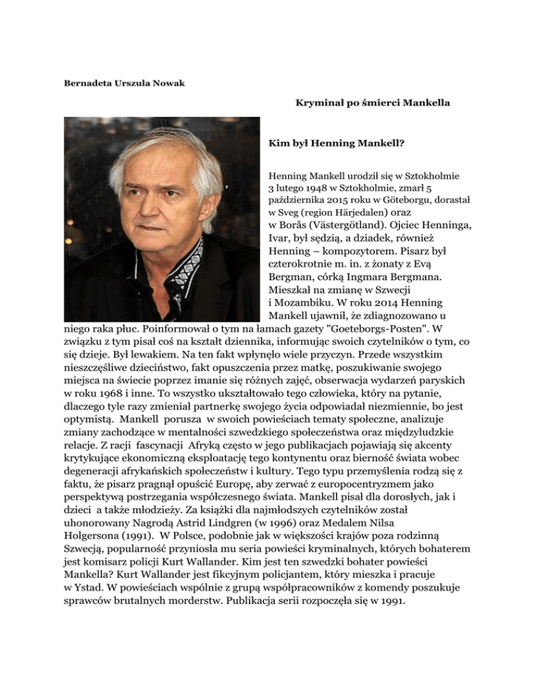 Bernadeta Urszula Nowak Kryminał po śmierci Mankella Kim był Henning Mankell? Henning Mankell urodził się w Sztokholmie 3 lutego 1948 w Sztokholmie, zmarł 5 października 2015 roku w Göteborgu, dorastał w Sveg (region Härjedalen) oraz w Borås (Västergötland). Ojciec Henninga, Ivar, był sędzią, a dziadek, również Henning – kompozytorem. Pisarz był czterokrotnie m. in. z żonaty z Evą Bergman, córką Ingmara Bergmana. Mieszkał na zmianę w Szwecji i Mozambiku. W roku 2014 Henning Mankell ujawnił, że zdiagnozowano u niego raka płuc. Poinformował o tym na łamach gazety "Goeteborgs-Posten". W związku z tym pisał coś na kształt dziennika, informując swoich czytelników o tym, co się dzieje. Był lewakiem. Na ten fakt wpłynęło wiele przyczyn. Przede wszystkim nieszczęśliwe dzieciństwo, fakt opuszczenia przez matkę, poszukiwanie swojego miejsca na świecie poprzez imanie się różnych zajęć, obserwacja wydarzeń paryskich w roku 1968 i inne. To wszystko ukształtowało tego człowieka, który na pytanie, dlaczego tyle razy zmieniał partnerkę swojego życia odpowiadał niezmiennie, bo jest optymistą. Mankell porusza w swoich powieściach tematy społeczne, analizuje zmiany zachodzące w mentalności szwedzkiego społeczeństwa oraz międzyludzkie relacje. Z racji fascynacji Afryką często w jego publikacjach pojawiają się akcenty krytykujące ekonomiczną eksploatację tego kontynentu oraz bierność świata wobec degeneracji afrykańskich społeczeństw i kultury. Tego typu przemyślenia rodzą się z faktu, że pisarz pragnął opuścić Europę, aby zerwać z europocentryzmem jako perspektywą postrzegania współczesnego świata. Mankell pisał dla dorosłych, jak i dzieci a także młodzieży. Za książki dla najmłodszych czytelników został uhonorowany Nagrodą Astrid Lindgren (w 1996) oraz Medalem Nilsa Holgersona (1991). W Polsce, podobnie jak w większości krajów poza rodzinną Szwecją, popularność przyniosła mu seria powieści kryminalnych, których bohaterem jest komisarz policji Kurt Wallander. Kim jest ten szwedzki bohater powieści Mankella? Kurt Wallander jest fikcyjnym policjantem, który mieszka i pracuje w Ystad. W powieściach wspólnie z grupą współpracowników z komendy poszukuje sprawców brutalnych morderstw. Publikacja serii rozpoczęła się w 1991. O twórczości Autor kładzie duży nacisk na pokazanie żmudnej pracy policji, drobiazgowo rejestruje procesy myślowe swoich bohaterów. Skupia się na dociekaniach psychologicznych, a rozwikłanie zagadki zabójstwa poparte jest solidną i wytrwałą pracą policjantów, którzy nie są wolni od ludzkich słabostek, zdarza im się mylić i popełniać błędy. Sporo miejsca w utworach pisarza zajmuje analiza społeczna. Bohaterowie Mankella żyją w XX i XXI wieku w społeczeństwie dobrobytu szwedzkiego modelu socjalnego, gdzie stawić trzeba czoła brutalnym stosunkom społecznych, wszechobecnej przemocy, której źródła są niezwykle złożone. Na porządku dziennym jest zdrada małżeńska, rozpad związków małżeńskich, rozpad rodzin, alkoholizm, kłopoty związane z utratą pracy, negatywne doświadczenia z dzieciństwa, które rzutują na dorosłe życie bohaterów. Konstrukcja powieści sprawić może polskiemu czytelnikowi niejeden kłopot, ale fabułę kształtują: realizm i maksymalizacja prawdopodobieństwa zdarzeń. Pisarz stworzył cykl dwunastu powieści związanych z Kurtem Wallanderem. Nazwisko to miało się pojawić zupełnie przypadkowo, jako pozycja w książce telefonicznej i po raz pierwszy zostało użyte przez autora w roku 1991 w powieści „Morderca bez twarzy”. Sam autor wyjaśniał sprawę następująco – nie był ani miłośnikiem, ani tym bardziej znawcą powieści kryminalnej, ale skoro utwory tego typu pokazują ciemną stronę rzeczywistości, winien pokazać zło, aby potępić rasizm, ksenofobię, wyzysk słabych, przemoc wobec kobiet. Twórca stworzył postać komisarza – człowieka mało sympatycznego, mruka borykającego się z rozmaitymi kłopotami osobistymi i służbowymi, ale przede wszystkim człowieka, który ma świadomość swoich wad, ograniczeń, błędów. Wallander ma kłopoty nie tylko z nadwagą, ale i alkoholem. „Rok temu prowadziłem samochód mocno podchmielony i nie stało się nic, bo koledzy mnie osłonili.”1 Wallander jest rozwodnikiem, żona Mona odeszła od niego, a z jedyną córką Lindą też nie łączą go najlepsze relacje. Komisarz im bardziej stary szuka pozytywnych relacji ze swą jedynaczką oraz innymi kobietami. Skomplikowane więzi łączą go z ojcem, którego stara się przynajmniej raz w tygodniu odwiedzać w jego samotni. Nie potrafi z nim rozmawiać, bo starszy pan nigdy nie zaakceptował tego, że syn postanowił być policjantem. Chłód relacji na linii dziecko – ojciec przełożył się na jego stosunki z córką. Kurt Wallander również będzie miał kłopoty, aby pogodzić z tym, że córka zostanie policjantką ( „Nim nadejdzie mróz”). Przypuszcza się, że chorującego na cukrzycę i alzheimera komisarza miała w kolejnych powieściach zastąpić Linda. Niestety życie napisało inny scenariusz. Pisarz w roku 2013 uległ ciężkiemu wypadkowi samochodowemu, a trakcie badań ujawniły się guzy na karku i w płucach. O raku pisarz poinformował czytelników popularnej gazety, a w pisanym przez siebie dzienniku „ Grząskie piaski” informował o postępach choroby, samopoczuciu i refleksjach nad życiem. Literatura, którą uprawiał Mankell określana jest mianem popularnej. Pomimo tego uprawiali ją wielcy twórcy np. Agata Christie, Conan – Doyle a współcześnie Umberto Eco – znany filolog, profesor kilku włoskich uniwersytetów. Nie ulega wątpliwości, że w kulturze postmodernistycznej renesans przeżywają twórcy literatury kryminalnej, czego dowodem fakt, iż Mankell za swoją twórczość był wielokrotnie nagradzany. W roku 2014 otrz