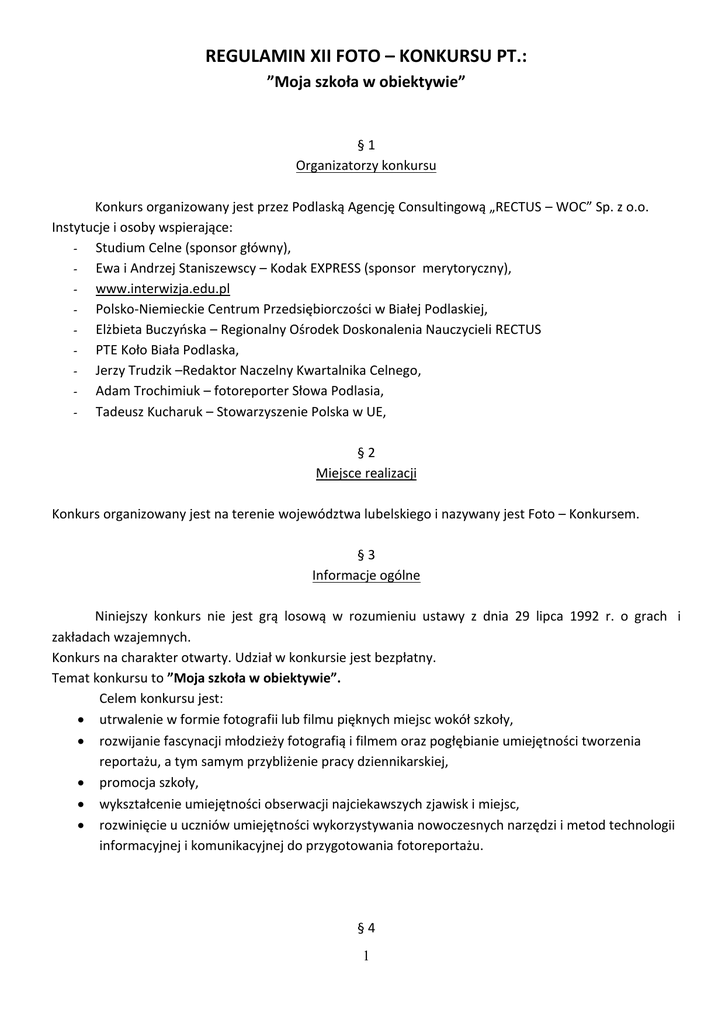 REGULAMIN XII FOTO – KONKURSU PT.: ”Moja szkoła w obiektywie” §1 Organizatorzy konkursu Konkurs organizowany jest przez Podlaską Agencję Consultingową „RECTUS – WOC” Sp. z o.o. Instytucje i osoby wspierające: - Studium Celne (sponsor główny), - Ewa i Andrzej Staniszewscy – Kodak EXPRESS (sponsor merytoryczny), - www.interwizja.edu.pl - Polsko-Niemieckie Centrum Przedsiębiorczości w Białej Podlaskiej, - Elżbieta Buczyńska – Regionalny Ośrodek Doskonalenia Nauczycieli RECTUS - PTE Koło Biała Podlaska, - Jerzy Trudzik –Redaktor Naczelny Kwartalnika Celnego, - Adam Trochimiuk – fotoreporter Słowa Podlasia, - Tadeusz Kucharuk – Stowarzyszenie Polska w UE, §2 Miejsce realizacji Konkurs organizowany jest na terenie województwa lubelskiego i nazywany jest Foto – Konkursem. §3 Informacje ogólne Niniejszy konkurs nie jest grą losową w rozumieniu ustawy z dnia 29 lipca 1992 r. o grach i zakładach wzajemnych. Konkurs na charakter otwarty. Udział w konkursie jest bezpłatny. Temat konkursu to ”Moja szkoła w obiektywie”. Celem konkursu jest: utrwalenie w formie fotografii lub filmu pięknych miejsc wokół szkoły, rozwijanie fascynacji młodzieży fotografią i filmem oraz pogłębianie umiejętności tworzenia reportażu, a tym samym przybliżenie pracy dziennikarskiej, promocja szkoły, wykształcenie umiejętności obserwacji najciekawszych zjawisk i miejsc, rozwinięcie u uczniów umiejętności wykorzystywania nowoczesnych narzędzi i metod technologii informacyjnej i komunikacyjnej do przygotowania fotoreportażu. §4 1 Uczestnicy Konkurs adresowany jest do uczniów gimnazjów i szkół ponadgimnazjalnych. Zgłoszenie do konkursu polega na nadesłaniu w przewidzianym terminie pracy konkursowej wraz z wypełnioną deklaracją uczestnictwa. Z każdej szkoły może zgłosić się kilku lub kilkunastu uczniów, ale każdy z nich przygotowuje indywidualnie i samodzielnie własną pracę na temat "Moja szkoła w obiektywie”. Nadsyłając prace na Foto – Konkurs uczestnik wyraża zgodę na umieszczenie jego danych osobowych w bazie danych organizatora i przetwarzanie ich do celów związanych z Foto – Konkursem. §5 Harmonogram konkursu Termin nadsyłania prac upływa w dniu 18.03.2016 r. Prace należy przesyłać wraz z wypełnioną deklaracją uczestnictwa zamieszczoną na stronach www.interwizja.edu.pl lub www.rectus.edu.pl za pomocą Internetu w formie elektronicznej na adres e-mail: [email protected] lub wywołane bądź na płytach CD dostarczyć do biura organizatora: Podlaska Agencja Consultingowa „RECTUS-WOC” Sp. z o.o. ul. Warszawska 14, p.6 21-500 Biała Podlaska Praca powinna zawierać oryginalne fotografie lub film wykonane przez uczniów dowolną techniką, do których należy dołączyć krótki opis (max 500 znaków do każdego zdjęcia/filmu). Prace oceni Jury, powołane przez organizatora. Jury wybierze 10 najlepszych prac w kategorii zdjęcie i 3 najlepsze prace w kategorii film. Werdykt Jury jest nieodwołalny. Wyróżnione prace zostaną umieszczone na stronie internetowej organizatora. Niezależnie od Jury, prace oceniać będą także internauci. Głosowanie internautów odbędzie się w dniach 21.04.2016 - – 25.04.2016 r. W Internecie pod głosowanie internautów będą wystawione prace zajmujące pierwszych 10 miejsc w kategorii zdjęcie (w ocenie jury), oraz wszystkie nadesłane filmy. O ostatecznych wynikach obrad jury powiadomimy e-mailem lub drogą pocztową do dnia 30.04.2016 r. Oficjalna lista laureatów Foto – Konkursu oraz nagrodzone prace będą umieszczona na stronach internetowych organizatora: www.interwizja.edu.pl i www.rectus.edu.pl. Na przełomie kwietnia i maja 2016 r. nastąpi otwarcie wystawy prac konkursowych w siedzibie organizatora. Pierwszego dnia wystawy odbędzie się uroczyste wręczenie nagród. Prace konkursowe dostarczone po terminie nie będą oceniane. §6 Praca konkursowa Praca powinna zawierać od jednej do pięciu fotografii lub krótki film (od 2 do 4 minut) wykonanych przez uczniów dowolną techniką (kolorowe lub czarno-białe, przy użyciu sprzętu tradycyjnego lub cyfrowego), do których należy dołączyć deklarację uczestnictwa. Deklaracja powinna zawierać dokładne dane dotyczące szkoły i autora prac konkursowych (adresy pocztowe i elektroniczne) oraz krótki opis (max. 500 znaków do każdego zdjęcia lub filmu). 2 Ocena prac zgłoszonych do Foto – Konkursu będzie oparta na następujących kryteriach: - wartość merytoryczna prac, - oryginalność pomysłu wykonania pracy, - trafność doboru fotografii/filmu, - artystyczna strona pracy, - umiejętność przekazu informacji. Organizatorzy zastrzegają sobie prawo do zachowania i nieodpłatnego wykorzystania prac konkursowych. Prosimy uczestników Foto – Konkursu o zachowanie negatywów, kopii prac lub CDROMów. Prace zgłoszone na konkurs nie będą odsyłane. Organizator nie bierze odpowiedzialności za uszkodzenie prac podczas przesyłki. §7 Nagrody Prace zostaną umieszczone na stronach internetowych organizatora www.interwizja.edu.pl oraz www.rectus.edu.pl Autorzy 10 najlepszych prac (w ocenie Jury) w kategorii zdjęcie oraz autorzy 3 prac w kategorii film zostaną nagrodzeni dyplomami i nagrodami rzeczowymi ufundowanymi przez organizatorów i sponsorów konkursu. Dyplomy oraz nagrody rzeczowe otrzymają również autorzy prac w kategorii zdjęcie i w kategorii film, którzy zajmą pierwsze miejsce w głosowaniu internautów. Nagrody zostaną wręczone pierwszego dnia wystawy lub będą do odebrania w biurze organizatora. Brak możliwości kontaktu ze zwycięzcą w ciągu 20 dni od jego wyłonienia lub stwierdzenie jego nieprawdziwych danych spowoduje wybranie kolejnego laureata z puli finalistów. Kwestie nienormowane regulaminem a dotyczące konkursu zawsze rozstrzyga organizator. §8 Kontakt z organizatorem Podlaska Agencja Consultingowa „RECTUS-WOC” Sp. z o.o. ul. Warszawska 14, p.6 21-500 Bia