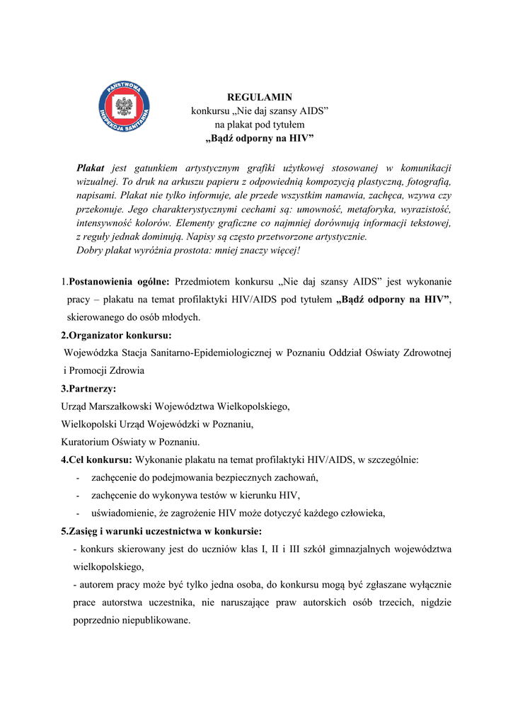 REGULAMIN konkursu „Nie daj szansy AIDS” na plakat pod tytułem „Bądź odporny na HIV” Plakat jest gatunkiem artystycznym grafiki użytkowej stosowanej w komunikacji wizualnej. To druk na arkuszu papieru z odpowiednią kompozycją plastyczną, fotografią, napisami. Plakat nie tylko informuje, ale przede wszystkim namawia, zachęca, wzywa czy przekonuje. Jego charakterystycznymi cechami są: umowność, metaforyka, wyrazistość, intensywność kolorów. Elementy graficzne co najmniej dorównują informacji tekstowej, z reguły jednak dominują. Napisy są często przetworzone artystycznie. Dobry plakat wyróżnia prostota: mniej znaczy więcej! 1.Postanowienia ogólne: Przedmiotem konkursu „Nie daj szansy AIDS” jest wykonanie pracy – plakatu na temat profilaktyki HIV/AIDS pod tytułem „Bądź odporny na HIV”, skierowanego do osób młodych. 2.Organizator konkursu: Wojewódzka Stacja Sanitarno-Epidemiologicznej w Poznaniu Oddział Oświaty Zdrowotnej i Promocji Zdrowia 3.Partnerzy: Urząd Marszałkowski Województwa Wielkopolskiego, Wielkopolski Urząd Wojewódzki w Poznaniu, Kuratorium Oświaty w Poznaniu. 4.Cel konkursu: Wykonanie plakatu na temat profilaktyki HIV/AIDS, w szczególnie: - zachęcenie do podejmowania bezpiecznych zachowań, - zachęcenie do wykonywa testów w kierunku HIV, - uświadomienie, że zagrożenie HIV może dotyczyć każdego człowieka, 5.Zasięg i warunki uczestnictwa w konkursie: - konkurs skierowany jest do uczniów klas I, II i III szkół gimnazjalnych województwa wielkopolskiego, - autorem pracy może być tylko jedna osoba, do konkursu mogą być zgłaszane wyłącznie prace autorstwa uczestnika, nie naruszające praw autorskich osób trzecich, nigdzie poprzednio niepublikowane. 6. Ramy czasowe trwania konkursu: - etap szkolny 15.09.2014r. – 17.10.2014r. - etap powiatowy 20.10.2014r. – 31.10.2014r. - etap wojewódzki 03.11.2014r. – 21.11.2014r. - posiedzenie wojewódzkiej komisji konkursowej – do 21 listopada 2014r. - impreza podsumowujące i wręczenie nagród laureatom konkursu – do 27 listopada 2014r. - ogłoszenie wyników na stronie internetowej WSSE w Poznaniu – do 28 listopada 2014r. 7. Zakres tematyczny: Zadanie konkursowe polega na wykonaniu przez młodzież plakatu pod tytułem „Bądź odporny na HIV”. Plakat powinien jednoznacznie kojarzyć się z profilaktyką HIV/AIDS i bezpiecznymi zachowaniami chroniącymi przez zakażeniem HIV. Autorzy mają w swoich pracach zachęcić młodych ludzi do zainteresowania się tematyką HIV/AIDS. Prace konkursowe nie mogą wzbudzać agresji i nietolerancji wobec osób żyjących z HIV. 8. Zasady przeprowadzenia konkursu: a. zadania dla uczestników konkursu: - wykonanie plakatu w dowolnej technice plastycznej, możliwość wykorzystania grafiki komputerowej - format: jednostronny, arkusz A3 (29,7 cm x 42 cm), - na odwrocie pracy należy umieścić godło autora, - autor może zgłosić tylko jedną pracę. b. liczba etapów konkursu - konkurs składa się z trzech etapów: szkolnego, powiatowego, wojewódzkiego. c. osoby odpowiedzialne /zespoły organizacyjne/ za przeprowadzenie poszczególnych etapów: - etap szkolny: szkolny koordynatorzy wychowania zdrowotnego, nauczyciele, wychowawcy klas, przedstawiciele medycyny szkolnej, - etap powiatowy: pracownicy oświaty zdrowotnej i promocji zdrowia powiatowych stacji sanitarno-epidemiologicznych województwa wielkopolskiego, - etap wojewódzki: pracownicy Oddziału Oświaty Zdrowotnej i Promocji Zdrowia Wojewódzkiej Stacji Sanitarno-Epidemiologicznej w Poznaniu, d. liczba uczestników przechodzących do dalszych etapów konkursu: - z etapu szkolnego do etapu powiatowego: laureaci I miejsca z poszczególnych szkół, - z etapu powiatowego do etapu wojewódzkiego: laureaci I miejsca z powiatów. e. sposób zgłaszania uczestników: uczestnicy ze szkół gimnazjalnych województwa wielkopolskiego rekrutują się samodzielnie. f. sposób opisania prac konkursowych: - dołączyć kopertę, opatrzoną tym samym godłem autora, w której należy umieścić dokładne i czytelne dane autora: imię i nazwisko, klasa, adres szkoły, numer telefonu szkoły, załącznik F/IT/PT/PZ/01/03/02 - zgodę opiekunów na udział dziecka w konkursie. g. prace należy przesłać: - etap powiatowy – właściwa powiatowa stacja sanitarno-epidemiologiczna, - etap wojewódzki – Wojewódzka Stacja Sanitarno-Epidemiologiczna w Poznaniu, Oddział Oświaty Zdrowotnej i Promocji Zdrowia, os. Przyjaźni 118, 61-680 Poznań. 8. Zasady oceny oraz skład komisji konkursowej: a. oceniane będą tylko indywidualne, własnoręcznie wykonane plakaty, b. sposób oceny: - zgodność z regulaminem, - czytelność przekazu, - pomysłowość, - poprawność merytoryczna, - estetyka wykonania (czystość i staranność wykonania prac, brak zagnieceń, plam itp.) c. skład komisji konkursowej: - etap szkolny: dyrektor szkoły, nauczyciel sztuki, przedstawiciel medycyny szkolnej, - etap powiatowy: pracownik ds. oświaty zdrowotnej i promocji zdrowia powiatowej stacji sanitarno-epidemiologicznej, nauczyciel sztuki, pracownik służby zdrowia, przedstawiciel starostwa powiatowego, urzędu miast i gmin, - etap wojewódzki: pracownik Oddziału Oświaty Zdrowotnej i Promocji Zdrowia Wojewódzkiej Stacji Sanitarno-Epidemiologicznej w Poznaniu, przedstawiciel władz rządowych/samorządowych, przedstawiciel Kuratorium Oświaty w Poznaniu, plastyk, pracownik służby zdrowia. 9. Zasady nagradzania: a. fundatorzy nagród: - etap powiatowy: powiatowe stacje sanitarno – epidemiologiczne województwa wielkopolskiego, starostwa powiatowe, urzędy miast i gmin, partnerzy, - etap wojewódzki: Wojewódzka Stacja Sanitarno – Epidemiologiczna w Poznaniu, Urząd Marszałkowski Województwa Wielkopolskiego, Wielkopolski Urząd Wojewódzki w Poznaniu, Kuratorium Oświaty w Poznaniu. b. liczba laureatów: - etap szkolny – I, II, III miejsce, - etap powiatowy – I, II, III miejsce, - e