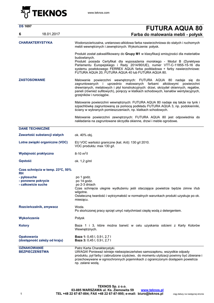 www.teknos.com DS 1697 6 FUTURA AQUA 80 18.01.2017 CHARAKTERYSTYKA Farba do malowania mebli - połysk Wodorozcieńczalna, uretanowo-alkidowa farba nawierzchniowa do stałych i ruchomych mebli wewnętrznych i zewnętrznych. Wykończenie: połysk. Produkt został zakwalifikowany do Grupy M1 w klasyfikacji emisyjności dla materiałów budowlanych. Produkt posiada Certyfikat dla wyposażenia morskiego - Moduł B (Dyrektywa Parlamentu Europejskiego i Rady 2014/90/UE), numer VTT-C-11855-15-16 dla systemu powłokowego FERREX AQUA farba podkładowa + farby nawierzchniowe: FUTURA AQUA 20, FUTURA AQUA 40 lub FUTURA AQUA 80. ZASTOSOWANIE Malowanie powierzchni wewnętrznych: FUTURA AQUA 80 nadaje się do zagruntowanych i uprzednio malowanych farbami alkidowymi powierzchni drewnianych, metalowych i płyt konstrukcyjnych: drzwi, skrzydeł okiennych, regałów, paneli (również sufitowych), poręczy w klatkach schodowych, kanałów wentylacyjnych, grzejników i rurociągów. Malowanie powierzchni wewnętrznych: FUTURA AQUA 80 nadaje się także na tynk i szpachlówkę zagruntowaną za pomocą podkładu FUTURA AQUA 3, np. podokienniki, ściany w wybranych pomieszczeniach, np. klatkach schodowych. Malowanie powierzchni zewnętrznych: FUTURA AQUA 80 jest odpowiednia do nakładania na zagruntowane skrzydła okienne, drzwi i meble ogrodowe. DANE TECHNICZNE Zawartość substancji stałych ok. 40% obj. Lotne związki organiczne (VOC) EU VOC wartości graniczne (kat. A/d): 130 g/l 2010. VOC produktu: max 130 g/l. Wydajność praktyczna 8-10 m2/l Gęstość ok. 1,2 g/ml Czas schnięcia w temp. 23oC, 50% RH - pyłosuche - ponowne pokrycie - całkowicie suche po 1 godz. po 14 godz. po 2-3 dniach Czas schnięcia ulegnie wydłużeniu jeśli otaczające powietrze będzie zimne i/lub wilgotne. Ostateczną twardość i wytrzymałość w normalnych warunkach produkt uzyskuje po ok. miesiącu. Rozcieńczalnik, zmywacz Woda. Po skończonej pracy sprzęt umyć natychmiast ciepłą wodą z detergentem. Wykończenie Połysk Kolory Baza 1 i 3, które można barwić w celu uzyskania odcieni z Karty Kolorów Wewnętrznych. Opakowania (dostępność zależy od kraju) Baza 1: 0,45 l, 0,9 l, 2,7 l Baza 3: 0,45 l, 0,9 l, 2,7 l OZNAKOWANIE BEZPIECZEŃSTWA Patrz Karta Charakterystyki. UWAGA! Ponieważ istnieje niebezpieczeństwo samozapłonu, wszystkie odpady produktu, pył farby i zabrudzone czyściwo, do momentu utylizacji powinny być zbierane i przechowywane w ogniochronnych pojemnikach z ograniczonym dostępem powietrza np. zalane wodą. 1 TEKNOS Sp. z o.o. www.teknos.pl 03-885 WARSZAWA ul. Ks. Ziemowita 59 TEL +48 22 67-87-004; FAX +48 22 67-87-995; e-mail: [email protected] ciąg dalszy na następnej stronie FUTURA AQUA 80 SPOSÓB STOSOWANIA Przygotowanie podłoża DS 1697-6 strona 2 Niemalowane powierzchnie oczyścić z kurzu i zabrudzeń. Uprzednio malowane powierzchnie umyć środkiem czyszczącym do farb RENSA SUPER. Zmatowić twarde lub błyszczące powierzchnie i usunąć kurz. Wygładzić wszelkie nierówności powierzchni przy użyciu wypełniacza SILORA A. Gruntowanie Powierzchnie drewniane, płyty pilśniowe i konstrukcyjne oraz ocynkowane powierzchnie metalowe zagruntować za pomocą podkładu FUTURA AQUA 3. Rdzewiejące powierzchnie stalowe oraz aluminiowe i miedziane zagruntować FERREX AQUA farbą antykorozyjną. Nakładanie Przed użyciem farbę dokładnie wymieszać. W razie konieczności farbę rozcieńczyć wodą (5-15% obj.). Nakładać w jednej lub dwóch warstwach pędzlem lakierniczym, wałkiem mohairowym, packą lub za pomocą natrysku. Przy malowaniu gładkich powierzchni np. drzwi, zeszlifować ślady pozostawione przez wałek za pomocą packi lub pędzla lakierniczego. Do nanoszenia natryskiem bezpowietrznym stosować dyszę o średnicy 0.011 - 0.013”. Warunki podczas nakładania Malowana powierzchnia musi być sucha. W czasie nakładania i schnięcia farby temperatura otoczenia, powierzchni oraz farby powinna być wyższa niż +10°C, a wilgotność względna powietrza poniżej 80%. Przy niskiej wilgotności i/lub temp. powyżej +21°C, czas schnięcia jest krótszy. Aplikacja będzie łatwiejsza, jeśli powietrze będzie nawilżane i/lub temp. w miejscu malowania jest niższa. Dobra wentylacja podczas aplikacji skraca czas schnięcia. Przechowywanie Nie może zamarzać. Informacje zawarte w karcie danych zostały stworzone w oparciu o badania laboratoryjne i praktyczne doświadczenie. Nie mając wpływu na warunki aplikacji jak również sposób postępowania możemy brać odpowiedzialność wyłącznie za jakość wyrobu i gwarantować, że odpowiada on naszym normom. Nie bierzemy również odpowiedzialności za straty lub uszkodzenia powstałe w wyniku nanoszenia wyrobów niezgodnie z zaleceniami lub z powodu niewłaściwego ich użycia. Najnowsze wersje kart danych technicznych i charakterystyki znajdują się na stronie: www.teknos.com. 2 TEKNOS Sp. z o.o. www.teknos.pl 03-885 WARSZAWA ul. Ks. Ziemowita 59 TEL +48 22 67-87-004; FAX +48 22 67-87-995; e-mail: [email protected]