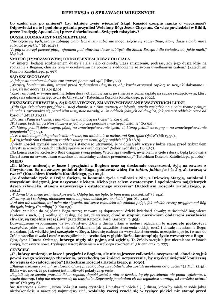 REFLEKSJA O SPRAWACH WIECZNYCH Co czeka nas po śmierci? Czy istnieje życie wieczne? Skąd Kościół czerpie naukę o wieczności? Odpowiedzi na te i podobne pytania przyniósł Wcielony Bóg: Jezus Chrystus. Co więc powiedział w Biblii, przez Tradycję Apostolską i przez doświadczenia Świętych mistyków? DUSZA LUDZKA JEST NIEŚMIERTELNA "Nie bójcie się tych, którzy zabijają ciało, lecz duszy zabić nie mogą. Bójcie się raczej Tego, który duszę i ciało może zatracić w piekle." (Mt 10,28) “A gdy otworzył pieczęć piątą, ujrzałem pod ołtarzem dusze zabitych dla Słowa Bożego i dla świadectwa, jakie mieli.” (Ap 6,9) ŚMIERĆ (TYMCZASOWYM) ODDZIELENIEM DUSZY OD CIAŁA “W śmierci, będącej rozdzieleniem duszy i ciała, ciało człowieka ulega zniszczeniu, podczas, gdy jego dusza idzie na spotkanie z Bogiem, chociaż trwa w oczekiwaniu na ponowne zjednoczenie ze swoim uwielbionym ciałem.” (Katechizm Kościoła Katolickiego, p. 997) SĄD SZCZEGÓŁOWY „A jak postanowione ludziom raz umrzeć, potem zaś sąd” (Hbr 9,27) „Wszyscy bowiem musimy stanąć przed trybunałem Chrystusa, aby każdy otrzymał zapłatę za uczynki dokonane w ciele, złe lub dobre” (2 Kor 5,10) “Każdy człowiek w swojej nieśmiertelnej duszy otrzymuje zaraz po śmierci wieczną zapłatę na sądzie szczegółowym, który polega na odniesieniu jego życia do Chrystusa” (Katechizm Kościoła Katolickiego, p. 1022). PRZYJŚCIE CHRYSTUSA, SĄD OSTATECZNY, ZMARTWYCHWSTANIE WSZYSTKICH LUDZI „Gdy Syn Człowieczy przyjdzie w swej chwale, a z Nim wszyscy aniołowie, wtedy zasiądzie na swoim tronie pełnym chwały. I zgromadzą się przed Nim wszystkie narody, a On oddzieli jednych od drugich, jak pasterz oddziela owce od kozłów” (Mt 25,31-32). „Bóg zaś i Pana wskrzesił, i nas również swą mocą wskrzesi” (1 Kor 6,14). „Tak samo będziemy z Nim złączeni w jedno przez podobne zmartwychwstanie” (Rz 6,5). „Ci, którzy pełnili dobre czyny, pójdą na zmartwychwstanie życia; ci, którzy pełnili złe czyny – na zmartwychwstanie potępienia” (J 5,29). „Lecz o dniu owym lub godzinie nikt nie wie, ani aniołowie w niebie, ani Syn, tylko Ojciec" (Mk 13,32). " „Czy jednak Syn Człowieczy znajdzie wiarę na ziemi, gdy przyjdzie?" (Łk 18,8). „Święty Kościół rzymski mocno wierzy i stanowczo utrzymuje, że w dniu Sądu wszyscy ludzie staną przed trybunałem Chrystusa w swoich ciałach i zdadzą sprawę ze swych czynów” (Sobór Lyoński II, DS. 859). „Na końcu czasów Królestwo Boże osiągnie swoją pełnię. Wtedy sprawiedliwi, uwielbieni w ciele i duszy, będą królować z Chrystusem na zawsze, a sam wszechświat materialny zostanie przemieniony” (Katechizm Kościoła Katolickiego, p. 1060). NIEBO „Ci, którzy umierają w łasce i przyjaźni z Bogiem oraz są doskonale oczyszczeni, żyją na zawsze z Chrystusem. Są na zawsze podobni do Boga, ponieważ widzą Go takim, jakim jest (1 J 3,2), twarzą w twarz” (Katechizm Kościoła Katolickiego, p. 1023). „To doskonałe życie z Trójcą Świętą, ta komunia życia i miłości z Nią, z Dziewicą Maryją, aniołami i wszystkimi świętymi, jest nazywane niebem. Niebo jest celem ostatecznym i spełnieniem najgłębszych dążeń człowieka, stanem najwyższego i ostatecznego szczęścia” (Katechizm Kościoła Katolickiego, p. 1024). „W domu Ojca mego jest mieszkań wiele. Gdyby tak nie było, to bym wam powiedział” (J 14,2). „Cieszmy się i radujmy, albowiem nasza nagroda wielka jest w niebie” (por. Mt 5,12a). „Ani oko nie widziało, ani ucho nie słyszało, ani serce człowieka nie zdołało pojąć, jak wielkie rzeczy przygotował Bóg dla tych, którzy Go miłują” (1 Kor 2,9). „Święci w niebie do oglądania Boga twarzą w twarz są dopuszczeni dzięki światłości chwały; tę światłość Bóg wlewa każdemu z nich, (…) według ich zasług, ale tak, że wszyscy, choć w stopniu nierównym obdarzeni światłością chwały, są zupełnie szczęśliwi” (Katechizm Katolicki, kard. Gasparri, p. 595). Doświadczenie wspomnianej już św. Faustyny: „Dziś w duchu byłam w niebie i oglądałam te niepojęte piękności i szczęście, jakie nas czeka po śmierci. Widziałam, jak wszystkie stworzenia oddają cześć i chwałę nieustannie Bogu; widziałam, jak wielkie jest szczęście w Bogu, które się rozlewa na wszystkie stworzenia, uszczęśliwiając je, i wraca do Źródła wszelka chwała i cześć z uszczęśliwienia, i wchodzą w głębie Boże, kontemplują życie wewnętrzne Boga – Ojca, Syna i Ducha Świętego, którego nigdy nie pojmą ani zgłębią. To Źródło szczęścia jest niezmienne w istocie swojej, lecz zawsze nowe, tryskające uszczęśliwieniem wszelkiego stworzenia” (Dzienniczek, p. 777). CZYŚCIEC „Ci, którzy umierają w łasce i przyjaźni z Bogiem, ale nie są jeszcze całkowicie oczyszczeni, chociaż są już pewni swego wiecznego zbawienia, przechodzą po śmierci oczyszczenie, by uzyskać świętość konieczną do wejścia do radości nieba” (Katechizm Kościoła Katolickiego, p. 1030). „Dlatego właśnie sprawił, że złożono ofiarę przebłagalną za zabitych, aby zostali uwolnieni od grzechu” (2 Mch 12,45). Biblia więc mówi, że po śmierci jest możliwość pokuty za grzechy. „Pogódź się ze swoim przeciwnikiem szybko, dopóki jesteś z nim w drodze, by cię przeciwnik nie podał sędziemu, a sędzia dozorcy, i aby nie wtrącono cię do więzienia. Zaprawdę powiadam ci: nie wyjdziesz stamtąd, aż zwrócisz ostatni grosz” (Mt 5:25-6). Św. Katarzyna z Genui: „Istota Boża jest samą czystością i nieskazitelnością i (…) dusza, która by miała w sobie jakąś niedoskonałość, a nawet jej najmniejszy cień, wolałaby raczej rzucić się w tysiące piekieł niż stanąć przed Boskim Majestatem z jakąś zmazą na sobie. Widząc zatem, że czyściec jest na to przeznaczony, żeby ją oczyścić (