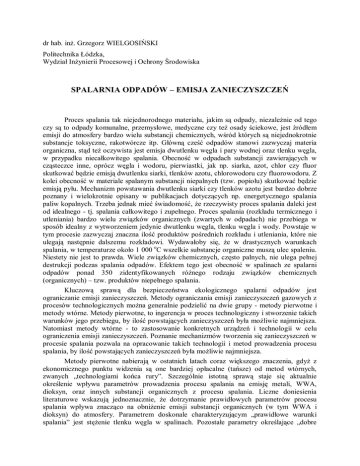 dr hab. inż. Grzegorz WIELGOSIŃSKI Politechnika Łódzka, Wydział Inżynierii Procesowej i Ochrony Środowiska SPALARNIA ODPADÓW – EMISJA ZANIECZYSZCZEŃ Proces spalania tak niejednorodnego materiału, jakim są odpady, niezależnie od tego czy są to odpady komunalne, przemysłowe, medyczne czy też osady ściekowe, jest źródłem emisji do atmosfery bardzo wielu substancji chemicznych, wśród których są niejednokrotnie substancje toksyczne, rakotwórcze itp. Główną cześć odpadów stanowi zazwyczaj materia organiczna, stąd też oczywista jest emisja dwutlenku węgla i pary wodnej oraz tlenku węgla, w przypadku niecałkowitego spalania. Obecność w odpadach substancji zawierających w cząsteczce inne, oprócz węgla i wodoru, pierwiastki, jak np. siarka, azot, chlor czy fluor skutkować będzie emisją dwutlenku siarki, tlenków azotu, chlorowodoru czy fluorowodoru. Z kolei obecność w materiale spalanym substancji niepalnych (tzw. popiołu) skutkować będzie emisją pyłu. Mechanizm powstawania dwutlenku siarki czy tlenków azotu jest bardzo dobrze poznany i wielokrotnie opisany w publikacjach dotyczących np. energetycznego spalania paliw kopalnych. Trzeba jednak mieć świadomość, że rzeczywisty proces spalania daleki jest od idealnego - tj. spalania całkowitego i zupełnego. Proces spalania (rozkładu termicznego i utleniania) bardzo wielu związków organicznych (zwartych w odpadach) nie przebiega w sposób idealny z wytworzeniem jedynie dwutlenku węgla, tlenku węgla i wody. Powstaje w tym procesie zazwyczaj znaczna ilość produktów pośrednich rozkładu i utleniania, które nie ulegają następnie dalszemu rozkładowi. Wydawałoby się, że w drastycznych warunkach spalania, w temperaturze około 1 000 oC wszelkie substancje organiczne muszą ulec spaleniu. Niestety nie jest to prawda. Wiele związków chemicznych, często palnych, nie ulega pełnej destrukcji podczas spalania odpadów. Efektem tego jest obecność w spalinach ze spalarni odpadów ponad 350 zidentyfikowanych różnego rodzaju związków chemicznych (organicznych) – tzw. produktów niepełnego spalania. Kluczową sprawą dla bezpieczeństwa ekologicznego spalarni odpadów jest ograniczanie emisji zanieczyszczeń. Metody ograniczania emisji zanieczyszczeń gazowych z procesów technologicznych można generalnie podzielić na dwie grupy - metody pierwotne i metody wtórne. Metody pierwotne, to ingerencja w proces technologiczny i stworzenie takich warunków jego przebiegu, by ilość powstających zanieczyszczeń była możliwie najmniejsza. Natomiast metody wtórne - to zastosowanie konkretnych urządzeń i technologii w celu ograniczenia emisji zanieczyszczeń. Poznanie mechanizmów tworzenia się zanieczyszczeń w procesie spalania pozwala na opracowanie takich technologii i metod prowadzenia procesu spalania, by ilość powstających zanieczyszczeń była możliwie najmniejsza. Metody pierwotne nabierają w ostatnich latach coraz większego znaczenia, gdyż z ekonomicznego punktu widzenia są one bardziej opłacalne (tańsze) od metod wtórnych, zwanych „technologiami końca rury”. Szczególnie istotną sprawą staje się aktualnie określenie wpływu parametrów prowadzenia procesu spalania na emisję metali, WWA, dioksyn, oraz innych substancji organicznych z procesu spalania. Liczne doniesienia literaturowe wskazują jednoznacznie, że dotrzymanie prawidłowych parametrów procesu spalania wpływa znacząco na obniżenie emisji substancji organicznych (w tym WWA i dioksyn) do atmosfery. Parametrem doskonale charakteryzującym „prawidłowe warunki spalania” jest stężenie tlenku węgla w spalinach. Pozostałe parametry określające „dobre warunki spalania” to przede wszystkim tzw. „trzy T” - temperatura, turbulencja oraz czas przebywania spalin w odpowiedniej temperaturze. Podstawowe znaczenie ma jednak zapewnienie warunków spalania bliskiego spalaniu całkowitemu i zupełnemu, przy zminimalizowaniu ilości powstającego tlenku węgla. Warunki takie panują przy prawidłowym natlenieniu strefy spalania, przy optymalnym stężeniu tlenu (dla spalania węgla 6 - 8 %, współczynnik nadmiaru powietrza ok. 1,7 - 1,8). W przypadku spalania odpadów wymagane jest większe natlenienie strefy spalania i zapewnienie sumarycznego współczynnika nadmiaru powietrza rzędu 2,2 - 2,4 (stężenie tlenu w spalinach opuszczających strefę spalania i dopalania 10 - 13 %). Badania prowadzone pod koniec lat dziewięćdziesiątych wykazały bardzo ścisłą korelację pomiędzy stężeniem niektórych zanieczyszczeń w spalinach, a stężeniem tlenku węgla, co jednoznacznie świadczy o wpływie warunków spalania na emisję zanieczyszczeń organicznych (w tym dioksyn i furanów). Spaliny po oddaniu ciepła kierowane są do systemu oczyszczania spalin. Jest on zazwyczaj wielostopniowy i zapewnia ponad 99 % usunięcie zanieczyszczeń. W świetle licznych doświadczeń konstrukcyjnych i eksploatacyjnych można stwierdzić, że współczesny system oczyszczania spalin w instalacji termicznego przekształcania odpadów musi obejmować następujące elementy: System odpylania spalin (elektrofiltr lub filtry tkaninowe). Efektywność systemu odpylania jest bardzo istotna z punktu widzenia ochrony środowiska, gdyż to właśnie pył jest nośnikiem emisji metali ciężkich (rtęć, ołów, kadm, miedź, chrom, mangan, arsen, nikiel, antymon i tal), jak również cząsteczki pyłu są doskonałym sorbentem dioksyn, stąd też dążenie do maksymalizacji wydajności urządzeń odpylających. Zazwyczaj w nowoczesnych, dużych spalarniach odpadów (komunalnych lub przemysłowych) do odpylania spalin stosuje się elektrofiltry - urządzenia pozwalające zatrzymać nawet 99,9 % emitowanego pyłu. Wadą elektrofiltrów jest dodatni wpływ pola elektrostatycznego na przebieg syntezy „de novo” polichlorowanych dioksyn i furanów. Ostatnio coraz częściej stosuje się filtry tkaninowe. Dzięk