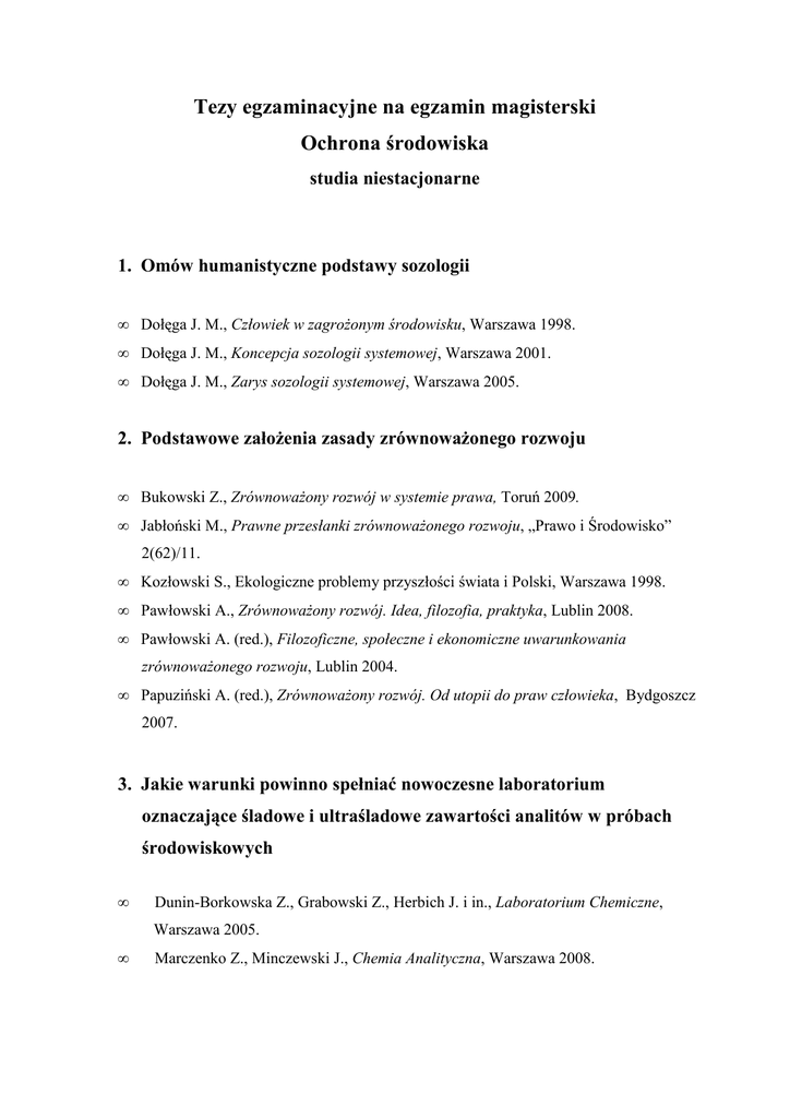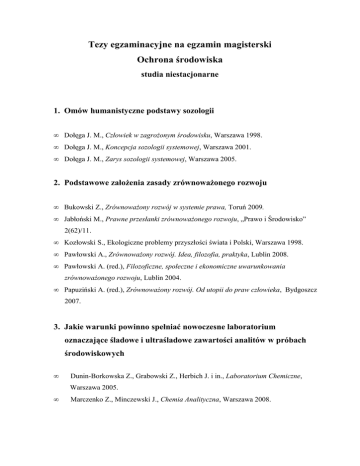 Tezy egzaminacyjne na egzamin magisterski Ochrona środowiska studia niestacjonarne 1. Omów humanistyczne podstawy sozologii • Dołęga J. M., Człowiek w zagroŜonym środowisku, Warszawa 1998. • Dołęga J. M., Koncepcja sozologii systemowej, Warszawa 2001. • Dołęga J. M., Zarys sozologii systemowej, Warszawa 2005. 2. Podstawowe załoŜenia zasady zrównowaŜonego rozwoju • Bukowski Z., ZrównowaŜony rozwój w systemie prawa, Toruń 2009. • Jabłoński M., Prawne przesłanki zrównowaŜonego rozwoju, „Prawo i Środowisko” 2(62)/11. • Kozłowski S., Ekologiczne problemy przyszłości świata i Polski, Warszawa 1998. • Pawłowski A., ZrównowaŜony rozwój. Idea, filozofia, praktyka, Lublin 2008. • Pawłowski A. (red.), Filozoficzne, społeczne i ekonomiczne uwarunkowania zrównowaŜonego rozwoju, Lublin 2004. • Papuziński A. (red.), ZrównowaŜony rozwój. Od utopii do praw człowieka, Bydgoszcz 2007. 3. Jakie warunki powinno spełniać nowoczesne laboratorium oznaczające śladowe i ultraśladowe zawartości analitów w próbach środowiskowych • Dunin-Borkowska Z., Grabowski Z., Herbich J. i in., Laboratorium Chemiczne, Warszawa 2005. • Marczenko Z., Minczewski J., Chemia Analityczna, Warszawa 2008. 4. Problematyka i geneza powstania ekofilozofii • Dołęga J. M., Ekofilozofia – nauka XXI wieku, „Problemy Ekorozwoju”, 2006, vol. 1, No 1, s. 17-22. • Konstańczak S., Wybrane zagadnienia ekofilozofii, Słupsk 2005. • Tyburski W., Powstanie i rozwój filozofii ekologicznej, „Problemy Ekorozwoju”, 2006, vol. 1, No 1, s. 7-15. 5. Proszę wyjaśnić co oznacza pojęcie wysoka jakość środowiska naturalnego • Polska 2025 - długookresowa strategia trwałego i zrównowaŜonego rozwoju, Warszawa 2000. 6. Na przykładzie wybranej gminy wymień i scharakteryzuj zadania samorządów lokalnych w zakresie edukacji ekologicznej • Krukowska - Szopa I., Szatan S., Program Edukacji Ekologicznej dla Powiatu Polkowickiego na lata 2009 - 2015, Legnica 2009. • Polityka ekologiczna Państwa w latach 2009 - 2012 z perspektywą do roku 2016, Ministerstwo Ochrony Środowiska, Warszawa 2008. • Program Ochrony Środowiska Województwa Mazowieckiego na lata 2007 - 2010 z uwzględnieniem perspektywy do 2014 r., Warszawa 2007. • Program Edukacji Ekologicznej dla Dolnego Śląska, Zarząd Województwa Dolnośląskiego, Wrocław 2005. • Program Edukacji Ekologicznej dla ZrównowaŜonego Rozwoju Gminy Radzymin na lata 2012 -2015, Urząd Miasta i Gminy Radzymin, Radzymin 2012. 7. Park Narodowy - zagroŜenie czy szansa dla regionu, w którym się znajduje? • Ustawa o ochronie przyrody z dnia 16 kwietnia 2004 r. (tekst jednolity DzU z 2009 r. nr 151, poz. 1220 z późn. zm.). • Ustawa o planowaniu i zagospodarowaniu przestrzennym z dnia 27 marca 2003 r. (DzU z 2003 r. nr 80, poz. 717 z późn. zm.). • Ustawa o lasach z dnia 28 września 1991 r. (tekst jednolity DzU z 2005 r. nr 45, poz. 435). 8. System planowania przestrzennego w Polsce. Podstawowe cele i zasady planowania przestrzennego • Bajerowski T. (red.), Podstawy teoretyczne gospodarki przestrzennej i zarządzania przestrzenią, Olsztyn 2003. • Cymerman R. (red.), Podstawy planowania przestrzennego i projektowania urbanistycznego, Olsztyn 2011. • Domański R., Podstawy planowania przestrzennego, Warszawa 1989. • Domański R., Przestrzenna transformacja gospodarki, Warszawa 1997. • Kafka K., Planowanie i zagospodarowanie przestrzenne w świetle nowych przepisów, Katowice 2003. • Kwaśniak P., Plan miejscowy w systemie zagospodarowania przestrzennego, Warszawa 2009. 9. Obowiązki podmiotów w zakresie opłat za korzystanie ze środowiska • Górski M., Pchałek M., Radecki W., i in., Prawo ochrony środowiska. Komentarz, Warszawa 2011. • Ustawa Prawo ochrony środowiska z dnia 27 kwietnia 2001 r. (Dz. U. z 2008 r. Nr 25, poz. 150 z późn. zm.). • Rozporządzenie Rady Ministrów z dnia 14 października 2008 r. w sprawie opłat za korzystanie ze środowiska (Dz. U. 2009, nr 196 poz. 1217). • Broszura informacyjna na temat opłat za korzystanie ze środowiska …, Urząd Marszałkowski Województwa Mazowieckiego w Warszawie, Departament Opłat Środowiskowych. 10. Omów zagadnienie zaleŜności troficznych, które występują pomiędzy Ŝywymi organizmami i podaj konkretne przykłady • Pyłka-Gutowska E., Ekologia z ochroną środowiska: przewodnik, Warszawa 1998. • Krebs Ch. J., Ekologia, Warszawa 2001. • Mackenzie A., Ball A. S., Virdee S. R., Ekologia. Krótkie wykłady, Warszawa 2005.