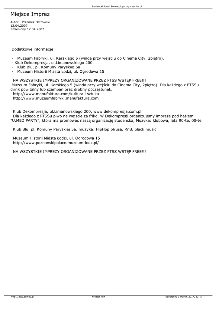 Studencki Portal Stomatologiczny - zemby.pl Miejsce Imprez Autor: Przemek Ostrowski 12.04.2007. Zmieniony 12.04.2007. Dodatkowe informacje: - Muzeum Fabryki, ul. Karskiego 5 (winda przy wejściu do Cinema City, 2piętro). - Klub Dekompresja, ul.Limanowskiego 200. - Klub Blu, pl. Komuny Paryskiej 5a - Muzeum Historii Miasta Łodzi, ul. Ogrodowa 15 NA WSZYSTKIE IMPREZY ORGANIZOWANE PRZEZ PTSS WSTĘP FREE!!! Muzeum Fabryki, ul. Karskiego 5 (winda przy wejściu do Cinema City, 2piętro). Dla każdego z PTSSu drink powitalny lub szampan oraz drobny poczęstunek. http://www.manufaktura.com/kultura i sztuka http://www.muzeumfabryki.manufaktura.com Klub Dekompresja, ul.Limanowskiego 200, www.dekompresja.com.pl Dla każdego z PTSSu piwo na wejscie za friko. W Dekompresji organizujemy impreze pod hasłem "U.MED PARTY", która ma promować naszą organizację studencką. Muzyka: klubowa, lata 90-te, 00-te Klub Blu, pl. Komuny Paryskiej 5a. muzyka: HipHop pl/usa, RnB, black music Muzeum Historii Miasta Łodzi, ul. Ogrodowa 15 http://www.poznanskipalace.muzeum-lodz.pl/ NA WSZYSTKIE IMPREZY ORGANIZOWANE PRZEZ PTSS WSTĘP FREE!!! http://ptss.zemby.pl Kreator PDF Utworzono 3 March, 2017, 22:17