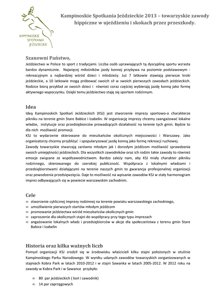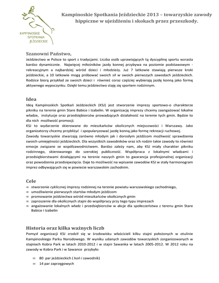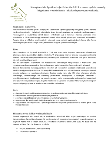 Kampinoskie Spotkania Jeździeckie 2013 – towarzyskie zawody hippiczne w ujeżdżeniu i skokach przez przeszkody. Szanowni Państwo, Jeździectwo w Polsce to sport z tradycjami. Liczba osób uprawiających tą dyscyplinę sportu wzrasta bardzo dynamicznie. Najwięcej miłośników jazdy konnej przybywa na poziomie podstawowym rekreacyjnym a najbardziej wśród dzieci i młodzieży. Już 7 latkowie stawiają pierwsze kroki jeździeckie, a 10 latkowie mogą próbować swoich sił w swoich pierwszych zawodach jeździeckich. Rodzice biorą przykład ze swoich dzieci i również coraz częściej wybierają jazdę konną jako formę aktywnego wypoczynku. Dzięki temu jeździectwo staję się sportem rodzinnym. Idea Ideą Kampinoskich Spotkań Jeździeckich (KSJ) jest stworzenie imprezy sportowo-o charakterze pikniku na terenie gmin Stare Babice i Izabelin. W organizację imprezy chcemy zaangażować lokalne władze, instytucje oraz przedsiębiorców prowadzących działalność na terenie tych gmin. Będzie to dla nich możliwość promocji. KSJ to wydarzenie skierowane do mieszkańców okolicznych miejscowości i Warszawy. Jako organizatorzy chcemy przybliżyć i spopularyzować jazdę konną jako formę rekreacji ruchowej. Zawody towarzyskie stwarzają zarówno młodym jak i dorosłym jeźdźcom możliwość sprawdzenia swoich umiejętności jeździeckich. Dla wszystkich zawodników oraz ich rodzin takie zawody to również emocje związane ze współzawodnictwem. Bardzo zależy nam, aby KSJ miały charakter pikniku rodzinnego, skierowanego do szerokiej publiczność. Współpraca z lokalnymi władzami i przedsiębiorstwami działającymi na terenie naszych gmin to gwarancja profesjonalnej organizacji oraz powodzenia przedsięwzięcia. Daje to możliwość na wpisanie zawodów KSJ w stały harmonogram imprez odbywających się w powiecie warszawskim zachodnim. Cele • • • • • stworzenie cyklicznej imprezy rodzinnej na terenie powiatu warszawskiego zachodniego, umożliwienie pierwszych startów młodym jeźdźcom promowanie jeździectwa wśród mieszkańców okolicznych gmin zaproszenie dla okolicznych stajni do współpracy przy tego typu imprezach angażowanie lokalnych władz i przedsiębiorców w akcje dla społeczeństwa z terenu gmin Stare Babice i Izabelin Historia oraz kilka ważnych liczb Pomysł organizacji KSJ zrodził się w środowisku właścicieli kilku stajni położonych w otulinie Kampinoskiego Parku Narodowego. W wyniku udanych zawodów towarzyskich zorganizowanych w stajniach Kobra Park w latach 2010-2012 i w stajni Sawanka w latach 2005-2012. W 2012 roku na zawody w Kobra Park i w Sawance przybyło: • • 80 par jeździeckich ( koń i zawodnik) 14 par zaprzęgowych • • około 700 osób publiczności rozegrano 12 konkursów i rozdano 40 nagród rzeczowych Tak narodził się pomysł organizacji cyklu imprez sportowo-rodzinnych pod nazwą Kampinoskie Spotkania Jeździeckie. W organizacji KSJ biorą udział : • Stajnia Kobra Park - miejscowość Borzęcin Duży • Stajnia HorseWorks - miejscowość Koczargi Nowe • Stajnia Justyny Milej - miejscowość Koczargi Nowe • Stajnia Sawanka - miejscowość Truskaw • Stajnia Zielonki - miejscowość Zielonki Opis imprezy Kampinoskie Spotkania Jeździeckie to cykl zawodów dla jeźdźców amatorsko uprawiających jeździectwo, rozgrywany w czterech stajniach na terenie gminy Stare Babice i Izabelin. W 2013 roku przewidziane są cztery edycje, podczas których zawodnicy będą zdobywać punkty za zajmowane miejsca. Zdobywca największej ilości punktów we wszystkich edycjach wygrywa cały cykl zawodów. W każdej edycji, niezależnie od wyników w całym cyklu, będą wyłaniani zwycięzcy w poszczególnych konkursach. Terminy rozgrywania zawodów w 2013 : • • • • 18 maja – stajnia Kobra Park 9 czerwca – stajnia HorseWorks i Stajnia Justyny Milej 31 sierpnia – stajnia Zielonki 28 września – stajnia Sawanka Rozgrywane będą konkursy: • • • • w ujeżdżeniu w skokach przez przeszkody „Pierwszy krok” konkurs dla najmłodszych, w którym jeźdźcy przy pomocy swoich instruktorów będą mieli do pokonania tor przeszkód. Zawodnicy będą mieli do wykonania zadania takie jak: przeniesienie piłki siedząc na koniu, powieszenie gumowego kółka na stojaku i inne. „Debiuty” – konkurs ujeżdżenia i skoków dla młodzieży i dorosłych, którzy opanowali podstawowe umiejętności jeździeckie rozgrywany w stępie i kłusie Wokół placu konkursowego będą przygotowane atrakcje dla publiczności: • „Klub młodego jeźdźca”- gry i zabawy edukacyjne o koniach i jeździectwie prowadzone przez wolontariuszy, • • • • • • • Przejażdżki bryczką oraz oprowadzanki na kucykach i koniach, Dmuchane zjeżdżalnie, ścianka wspinaczkowa, trampolina (w zależności od możliwości finansowych), Obóz oddziału kawalerii, Stoiska sponsorów oraz instytucji wspierających KSJ, Przewidziane są pokazy jeździeckie – kaskaderskie, woltyżerskie, powożenia. Stoiska gastronomiczne Stoiska z artykułami dla dzieci i inne Przewidujemy w każdej edycji udział: • • • 40 par jeździeckich 500 osób publiczności Relacja z zawodów dotrze do ok. 3000 czytelników gazet partnerskich Partnerzy • • • • • Powiat Warszawa-Zachód Gmina Stare Babice Gmina Izabelin Gminny Ośrodek Sportu i Rekreacji Stare Babice Dzielnica Warszawa-Bemowo Partnerami medialnymi są: • • • • • • Gazeta „Gallop” Portal www.adkonie.pl Portal www.ZwalczNude.pl Portal www.gminababice.pl „Gazeta Babicka” Gazeta „Listy do Sąsiada” Promocja Promocja zawodów będzie się odbywać poprzez : • • • • • media partnerskie - artykuły, krótkie audycje informacyjne, banery reklamowe na portalach internetowych strony internetowe patronów medialnych oraz stronie internetowej Polskiego Związku Jeździeckiego Facebook stajni-organizatorów oraz patronów medialnych Reklam