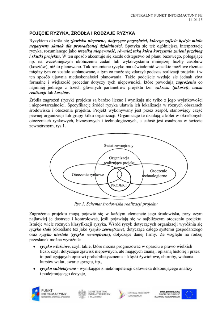 CENTRALNY PUNKT INFORMACYJNY FE 14-04-15 POJĘCIE RYZYKA, ŹRÓDŁA I RODZAJE RYZYKA Ryzykiem określa się zjawisko niepewne, dotyczące przyszłości, którego zajście będzie miało negatywny skutek dla prowadzonej działalności. Spotyka się też ogólniejszą interpretację ryzyka, rozumianego jako wszelką niepewność, również taką która korzystnie zmieni przebieg i skutki projektu. W ten sposób akcentuje się każde odstępstwo od planu bazowego, polegające np. na wcześniejszym ukończeniu zadań lub wykorzystaniu mniejszej liczby zasobów (kosztów), niż to planowano. Tak rozumiane ryzyko ma uświadomić wszelkie możliwe różnice między tym co zostało zaplanowane, a tym co może się zdarzyć podczas realizacji projektu i w ten sposób ujawnia niedoskonałości planowania. Takie podejście wydaje się jednak zbyt formalne i większość procedur dotyczy tych niepewności, które powodują zagrożenia co najmniej jednego z trzech głównych parametrów projektu tzn. zakresu (jakości), czasu realizacji lub kosztów. Źródła zagrożeń (ryzyk) projektu są bardzo liczne i wynikają nie tylko z jego wyjątkowości i niepowtarzalności. Specyfikację źródeł ryzyka ułatwia ich lokalizacja w różnych obszarach środowiska i otoczenia projektu. Projekt wykonywany jest przez zespół, stanowiący część pewnej organizacji lub grupy kilku organizacji. Organizacje te działają z kolei w określonych otoczeniach rynkowych, biznesowych i technologicznych, a całość jest osadzona w świecie zewnętrznym, rys.1. Świat zewnętrzny Organizacja realizująca projekt Otoczenie technologiczne Otoczenie rynkowe PROJEKT Rys.1. Schemat środowiska realizacji projektu Zagrożenia projektu mogą pojawić się w każdym elemencie jego środowiska, przy czym najłatwiej je dostrzec i kontrolować, jeśli pojawiają się w najbliższym otoczeniu projektu. Istnieje wiele różnych klasyfikacji ryzyka. Wśród ryzyk dotyczących organizacji wyróżnia się ryzyko stałe (określane też jako ryzyko zewnętrzne), dotyczące całego systemu gospodarczego oraz ryzyko niestałe (ryzyko wewnętrzne), dotyczące danej firmy. Ze względu na rodzaj przesłanek można wyróżnić: ryzyko właściwe, czyli takie, które można prognozować w oparciu o prawo wielkich liczb, czyli dotyczące zjawisk niepewnych, ale mających znaną i opisaną historię i przez to podlegających opisowi probabilistycznemu – klęski żywiołowe, choroby, wahania kursów walut, awarie sprzętu, itp., ryzyko subiektywne - wynikające z niekompetencji człowieka dokonującego analizy i podejmującego decyzje, 2 ryzyko obiektywne – wynikające z nieprzewidywalności przyszłych zdarzeń, np. odkrycia naukowe, nowe technologie, przewroty polityczne, itp. W projekcie powinno się kontrolować ryzyko właściwe i eliminować ryzyko subiektywne. Na zagrożenia wynikające z ryzyka obiektywnego nie mamy na ogół wpływu i zagrożenia tego rodzaju pozostają na ogół poza kontrolą zespołu projektowego. Ze względu na niepewności warunków działalności gospodarczej wyróżnia się: ryzyko działalności - zależne od wahań popytu, cen, itp., ryzyko płynności - oznaczające, że składnik aktywów może nie znaleźć natychmiast nabywcy chętnego do jego zakupu po cenie rynkowej, ryzyko nieściągalności - występujące, gdy dłużnik nie jest w stanie spłacić długu lub odsetek, ryzyko rynkowe - ryzyko globalnych zmian na rynku (np. bessa na giełdzie), ryzyko stopy procentowej - odnoszące się do wahań kursów papierów wartościowych, walut i stóp procentowych, W zależności od prawdopodobieństwa pojawienia się ryzyka określa się ryzyko: normalne, które musimy podjąć, bo jest ono naturalne dla danego typu projektów, dopuszczalne, na które możemy sobie pozwolić, niedopuszczalne, przekraczające poziom dopuszczalny, niezbędne, na które nie można sobie nie pozwolić (trzeba je podjąć). Podane przykłady klasyfikacji źródeł i rodzajów ryzyka pomagają uświadomić złożoność ewentualnych zagrożeń, na jakie jest narażony projekt w fazie realizacji. Praktyka pokazuje bezlitośnie, że prawie wszystkie projekty przebiegają inaczej, niż je planowano 1 (ryzyko obiektywne), ale bardzo wiele projektów kończy się niepowodzeniem spowodowanym wyłącznie niewłaściwą „obsługą” ryzyka właściwego. Niedocenianie ryzyk projektu oraz zbyt powszechna nonszalancja w ich ocenie powoduje niedoskonałość planowania, co prowadzi najczęściej do powstawania planów nadmiernie optymistycznych kończących się fiaskiem. Z kolei zbytnia zachowawczość (ostrożność) powoduje planowanie nadmiernie pesymistyczne a takie projekty mają niewielkie szanse powodzenia (konkurencja!) już w fazie inicjacji, czyli na etapie podpisywania kontraktu. Rolą menedżera (kierownika) projektu jest odpowiednie postępowanie, polegające na podejmowaniu wyważonych decyzji, uwzględniających dostępną wiedzę o ryzykach projektu oraz metodach zarządzania ryzykami. Zaleca się także wyodrębnić w zespołach projektowych osoby zajmujące się tym zakresem jako menedżerowie ryzyka, wspomagający pracę menedżera projektu. ELEMENTY ZARZĄDZANIA RYZYKIEM Stosowane są dwa podejścia do ryzyka: I. polegające na wczesnej identyfikacji zagrożeń oraz podjęciu działań dla ich uniknięcia i ograniczenia skutków, AKTYWNE (WYPRZEDZAJĄCE), polegające na śledzeniu realizacji projektu, wykrywaniu zaistniałych zagrożeń i ograniczaniu szkodliwości skutków. Niemal wszystkie opracowania przedstawiają zgodnie jednolitą strukturę ZR, na którą składają się cztery elementy: II. REAKTYWNE (PRZECIWDZIAŁAJĄCE), 3 1. IDENTYFIKACJA RYZYKA, 2. ILOŚCIOWA OCENA RYZYKA, 3. PLANOWANIE OBSŁUGI RYZYKA, 4. MONITOROWANIE I KIEROWANIE ZAGROŻENIAMI Trzy pierwsze elementy dotyczą głównie aktywnego zarządzania ryzykiem, zaś element czwarty to z reguły działanie reaktywne. Podział ten nie jest jednak