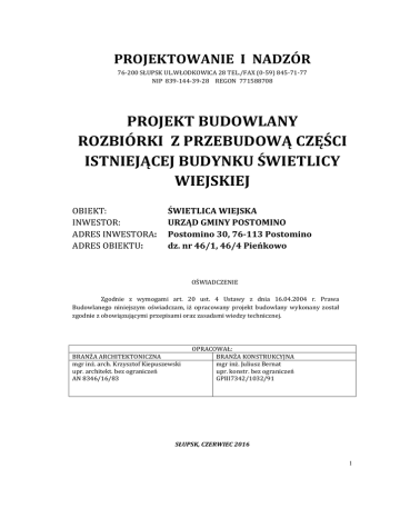 PROJEKTOWANIE I NADZÓR 76-200 SŁUPSK UL.WŁODKOWICA 28 TEL./FAX (0-59) 845-71-77 NIP 839-144-39-28 REGON 771588708 PROJEKT BUDOWLANY ROZBIÓRKI Z PRZEBUDOWĄ CZĘŚCI ISTNIEJĄCEJ BUDYNKU ŚWIETLICY WIEJSKIEJ OBIEKT: INWESTOR: ADRES INWESTORA: ADRES OBIEKTU: ŚWIETLICA WIEJSKA URZĄD GMINY POSTOMINO Postomino 30, 76-113 Postomino dz. nr 46/1, 46/4 Pieńkowo OŚWIADCZENIE Zgodnie z wymogami art. 20 ust. 4 Ustawy z dnia 16.04.2004 r. Prawa Budowlanego niniejszym oświadczam, iż opracowany projekt budowlany wykonany został zgodnie z obowiązującymi przepisami oraz zasadami wiedzy technicznej. BRANŻA ARCHITEKTONICZNA mgr inż. arch. Krzysztof Kiepuszewski upr. architekt. bez ograniczeń AN 8346/16/83 OPRACOWAŁ: BRANŻA KONSTRUKCYJNA mgr inż. Juliusz Bernat upr. konstr. bez ograniczeń GPIII7342/1032/91 SŁUPSK, CZERWIEC 2016 1 ZAWARTOŚĆ OPRACOWANIA 1. 2. 3. 4. 5. 6. 7. Strona tytułowa Zawartość opracowania Opis techniczny Bezpieczeństwo i Ochrona Zdrowia Informacje o obszarze oddziaływania Stwierdzenia przyg. zawodowego i zaświadczenia z Izby Część graficzna: - rys. nr 1 – Projekt zagospodarowania terenu - rys. nr 2 – Rzut parteru – inwentaryzacja - rys. nr 3 – Rzut dachu – inwentaryzacja - rys. nr 4 – Przekrój A-A – inwentaryzacja - rys. nr 5 – Rzut parteru - rys. nr 6 – Rzut dachu - rys. nr 7 – Przekrój A-A - rys. nr 8 – Elewacje s. 1 s. 2 s. 3 – 7 s. 8 – 15 s. 16 – 18 s. 19 – 23 2 OPIS TECHNICZNY Do projektu rozbiórki z przebudową części istniejącej budynku świetlicy wiejskiej. I. Podstawa opracowania - II. Umowa zawarta z Inwestorem Wizja lokalna Uzgodnienia z inwestorem Obowiązujące przepisy i normy Przedmiot opracowania Przedmiotem niniejszego opracowania jest rozbiórka z przebudową części istniejącej budynku świetlicy wiejskiej w stanie nie nadającym się do dalszego użytkowania z uwagi na zużycie i zniszczenia spowodowane brakiem należytej konserwacji. III. Opis lokalizacji Budynek świetlicy wiejskiej zlokalizowany jest na działce 46/1 i 46/4 w miejscowości Pieńkowo, gmina Postomino. IV. Opis ogólny Budynek położony jest na obszarze dwóch działek – jedna część na działce nr 46/4, zamieszkana przez osobę prywatna, druga część na działce 46/1, należącej do Gminy Postomino, w której znajduje się przedmiotowa świetlica wiejska. Świetlica służyła do spotkań miejscowej ludności. Budynek wybudowany w technologii szachulcowej, parterowy z poddaszem. Stropy drewniane, z belek 20x20 cm w rozstawie około 110 cm, wypełnione gliną wymieszana z sieczką. Podłogi parteru – w części terakota i deska podłogowa, oparta na legarach drewnianych 20x20 cm. Pod pomieszczeniem szatni wykonane podpiwniczenie z wejściem od strony wschodniej. Dach dwuspadowy o nachyleniu połaci 21° i 6° pokryty płytą falista PCV z lukarną usytuowaną na środku połaci dachowej z kalenicą prostopadłą do drogi. Więźba dachowa wykonana jako płatwiowo – 3 kleszczowa o przekroju krokwi 10x15 cm i rozstawie około 110 cm. Płatwie, słupy, kleszcze wykonane z belek o przekroju 18x18 cm. Konstrukcję nośna stanowią ściany szachulcowe z belek o przekroju 20x20 cm oraz murowane z cegły pełnej grubości 24 cm (strona północna) i 36 cm (strona południowa). Fundamenty budynku kamienne o szerokości 60 cm. Budynek wyposażony w trzy kominy murowane z cegły pełnej. Posiada kanalizację sanitarną i instalację elektryczną, które w części świetlicy wyłączone są z eksploatacji. Stan techniczny budynku zły. W poszyciu dachu występują liczne nieszczelności powodujące degradację elementów drewnianych. Belki stropowe oraz podwaliny skorodowane. Elementy drewniane niezabezpieczone preparatami grzybobójczymi i owadobójczymi. Ugięcia podciągów i belek w części sali. Tynki wewnętrzne porysowane z miejscowymi odparzeniami, zacieki na ścianach powstałe przez nieszczelności obróbek. Farba łuszczy się w obwodzie budynku w strefie przyfundamentowej. Brak izolacji poziomej oddzielającej elementy drewniane od kamienia. Stolarka drzwiowa wewnętrzna w fazie rozkładu. Tynki zewnętrzne wykonane jako cementowe zarysowane z miejscowymi odparzeniami. Elewacja od strony wschodniej wykonana z desek mocowanych w pionie przegnita. Stolarka okienna zluzowana. Słupy ścian nośnych w całkowitej degradacji. V. Rozbiórka budynku Przed przystąpieniem do robót rozbiórkowych należy wykonać wszelkie niezbędne zabezpieczenia terenu rozbiórki - wygrodzić przed dostępem osób postronnych i oznakować o grożącym niebezpieczeństwie. Dodatkowo na ogrodzeniu oznakować tablicami koloru żółtego informującymi o grożącym niebezpieczeństwie. Przed przystąpieniem do rozbiórki należy wykonać odłączenie istniejących przyłączy energetycznych i wodociągowych oraz kanalizacyjnych od budynku do instalacji zewnętrznych. Projektuje się rozbiórkę metodą tradycyjną w następującej kolejności: 1. Demontaż urządzeń i przewodów instalacyjnych. Urządzenia i instalacje przewidziane do demontażu podlegają rozbiórce w pierwszej kolejności. Rury stalowe pociąć na odcinki do transportu do punktu złomu. 4 2. Rozbiórka stolarki drzwiowej i okiennej. Skrzydła drzwiowe i okienne zdjąć z zawiasów, zdemontować opaski, ościeżnice wykuć z muru. Po wyjęciu okien otwory zaleca się zabić deskami lub blatami dla zapewnienia bezpieczeństwa pracy przy następnych robotach. 3. Rozbiórka pokrycia dachowego i obróbek blacharskich. Rozbiórkę pokrycia prowadzić od góry kalenicy w kierunku okapu. Projektowana rozbiórka dachu nie narusza konstrukcji dachu części nierozbieranej. 4. Rozbiórka kominów murowanych. Rozbiórkę prowadzić od góry odspajając pojedyncze cegły. 5. Rozbiórka więźby dachowej oraz słupów podtrzymujących. W pierwszej kolejności dokonać demontażu łat z desek rozpoczynając od kalenicy i posuwając się w dół. Następnie zdemontować krokwie z równoczes