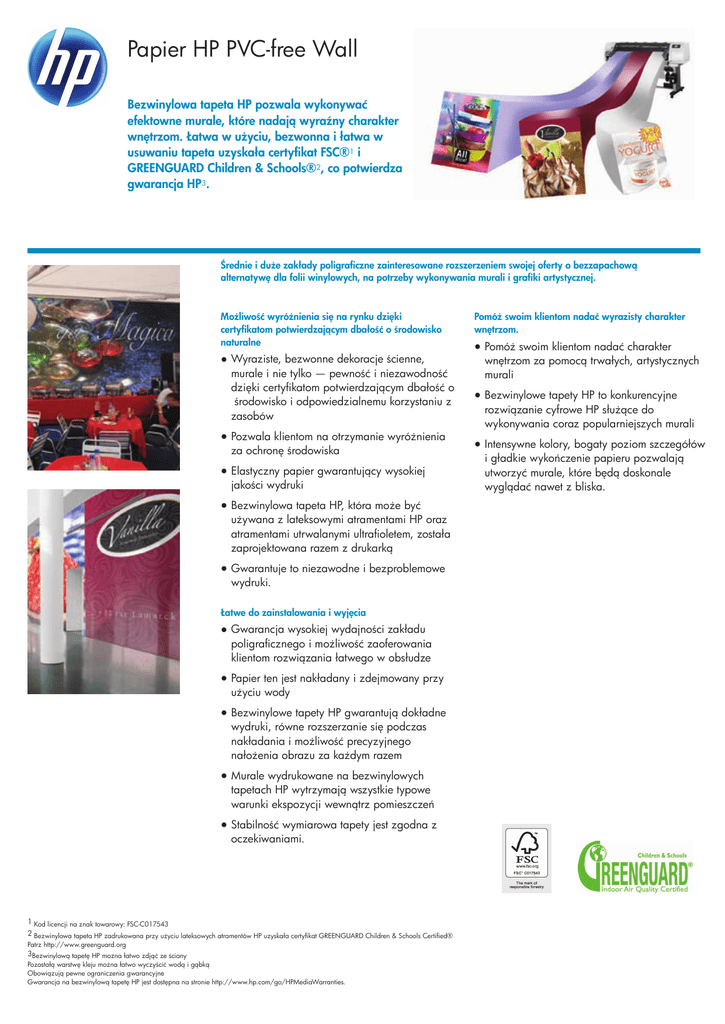 Papier HP PVC-free Wall Bezwinylowa tapeta HP pozwala wykonywać efektowne murale, które nadają wyraźny charakter wnętrzom. Łatwa w użyciu, bezwonna i łatwa w usuwaniu tapeta uzyskała certyfikat FSC®1 i GREENGUARD Children & Schools®2, co potwierdza gwarancja HP3. Średnie i duże zakłady poligraficzne zainteresowane rozszerzeniem swojej oferty o bezzapachową alternatywę dla folii winylowych, na potrzeby wykonywania murali i grafiki artystycznej. Możliwość wyróżnienia się na rynku dzięki certyfikatom potwierdzającym dbałość o środowisko naturalne ● Wyraziste, bezwonne dekoracje ścienne, murale i nie tylko — pewność i niezawodność dzięki certyfikatom potwierdzającym dbałość o środowisko i odpowiedzialnemu korzystaniu z zasobów ● Pozwala klientom na otrzymanie wyróżnienia za ochronę środowiska ● Elastyczny papier gwarantujący wysokiej jakości wydruki ● Bezwinylowa tapeta HP, która może być używana z lateksowymi atramentami HP oraz atramentami utrwalanymi ultrafioletem, została zaprojektowana razem z drukarką ● Gwarantuje to niezawodne i bezproblemowe wydruki. Łatwe do zainstalowania i wyjęcia ● Gwarancja wysokiej wydajności zakładu poligraficznego i możliwość zaoferowania klientom rozwiązania łatwego w obsłudze ● Papier ten jest nakładany i zdejmowany przy użyciu wody ● Bezwinylowe tapety HP gwarantują dokładne wydruki, równe rozszerzanie się podczas nakładania i możliwość precyzyjnego nałożenia obrazu za każdym razem ● Murale wydrukowane na bezwinylowych tapetach HP wytrzymają wszystkie typowe warunki ekspozycji wewnątrz pomieszczeń ● Stabilność wymiarowa tapety jest zgodna z oczekiwaniami. 1 Kod licencji na znak towarowy: FSC-C017543 2 Bezwinylowa tapeta HP zadrukowana przy użyciu lateksowych atramentów HP uzyskała certyfikat GREENGUARD Children & Schools Certified® Patrz http://www.greenguard.org 3Bezwinylową tapetę HP można łatwo zdjąć ze ściany Pozostałą warstwę kleju można łatwo wyczyścić wodą i gąbką Obowiązują pewne ograniczenia gwarancyjne Gwarancja na bezwinylową tapetę HP jest dostępna na stronie http://www.hp.com/go/HPMediaWarranties. Pomóż swoim klientom nadać wyrazisty charakter wnętrzom. ● Pomóż swoim klientom nadać charakter wnętrzom za pomocą trwałych, artystycznych murali ● Bezwinylowe tapety HP to konkurencyjne rozwiązanie cyfrowe HP służące do wykonywania coraz popularniejszych murali ● Intensywne kolory, bogaty poziom szczegółów i gładkie wykończenie papieru pozwalają utworzyć murale, które będą doskonale wyglądać nawet z bliska. Papier HP PVC-free Wall Dane techniczne produktu Waga Grubość Nieprzejrzystość Jasność Biel Laminowanie Wykończenie Podłoże samoprzylepne Temperatura pracy Wilgotność podczas pracy Środek zmniejszający palność Wodotrwałość Czas suszenia Okres trwałości Temperatura przechowywania Wilgotność przechowywania Kraj pochodzenia Informacje o zamawianiu 175 g/m², wg metody testowej ISO 536 178 mikronów (7 mili) wg metody testowej ISO 534 94% wg metody testowej TAPPI T-425 83% wg metody testowej ISO 2470 85 wg metody testowej ISO 11475 Brak Matowy Klej do tapet aktywowany w kontakcie z wodą Od 15 do 30°C wilgotność względna 15-80% Klasa A Tak Nie dotyczy Rok w oryginalnym, fabrycznie zamkniętym opakowaniu Od 15 do 30°C wilgotność względna 15-80% Wyprodukowano w Stanach Zjednoczonych Numer produktu CH098B CH003B CH103A Gwarancja HP oferuje gamę materiałów samoprzylepnych objętych gwarancją braku wad materiału i powłoki oraz defektów, które wywierałyby wpływ na użytkowanie, a także gwarancją zgodności parametrów ze specyfikacjami opublikowanymi przez HP. Gwarancja te obejmuje także ważne parametry użytkowe, takie jak trwałość ekspozycyjna i łatwość usuwania z określonych powierzchni. (Bezwinylową tapetę HP można łatwo usunąć ze ściany. Pozostałą warstwę kleju można łatwo zmyć wodą i gąbką). Obowiązują pewne ograniczenia gwarancji. Pełny tekst gwarancji jest dostępny pod adresem http://www.hp.com/go/HPMediaWarranties. Wymiary rolki 1067 mm x 30,5 m 1372 mm x 30,5 m 1372 mm x 91,4 m Kod UPC 886111126217 886111126200 886111125623 Aby uzyskać więcej informacji na temat materiałów do wydruków HP w dużym formacie, odwiedź http://www.hp.com/go/designjet/supplies © 2011 Hewlett-Packard Development Company L.P. Jedyne gwarancje, jakich HP udziela na produkty i usługi, są określone w oświadczeniach gwarancyjnych dostarczanych wraz z takimi produktami i usługami. Żaden zapis niniejszego dokumentu nie może być uważany za dodatkową gwarancję. HP nie ponosi odpowiedzialności za błędy techniczne lub redakcyjne oraz braki występujące w niniejszym dokumencie. 4AA0-4666PLE, Październik 2011