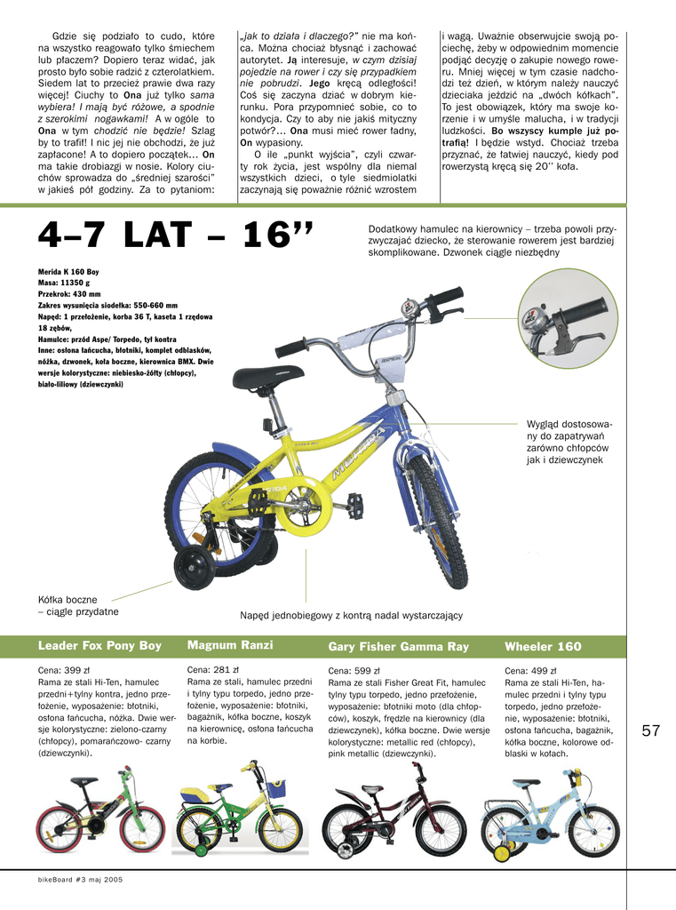 Gdzie się podziało to cudo, które na wszystko reagowało tylko śmiechem lub płaczem? Dopiero teraz widać, jak prosto było sobie radzić z czterolatkiem. Siedem lat to przecież prawie dwa razy więcej! Ciuchy to Ona już tylko sama wybiera! I mają być różowe, a spodnie z szerokimi nogawkami! A w ogóle to Ona w tym chodzić nie będzie! Szlag by to trafił! I nic jej nie obchodzi, że już zapłacone! A to dopiero początek… On ma takie drobiazgi w nosie. Kolory ciuchów sprowadza do „średniej szarości” w jakieś pół godziny. Za to pytaniom: „jak to działa i dlaczego?” nie ma końca. Można chociaż błysnąć i zachować autorytet. Ją interesuje, w czym dzisiaj pojedzie na rower i czy się przypadkiem nie pobrudzi. Jego kręcą odległości! Coś się zaczyna dziać w dobrym kierunku. Pora przypomnieć sobie, co to kondycja. Czy to aby nie jakiś mityczny potwór?… Ona musi mieć rower ładny, On wypasiony. O ile „punkt wyjścia”, czyli czwarty rok życia, jest wspólny dla niemal wszystkich dzieci, o tyle siedmiolatki zaczynają się poważnie różnić wzrostem 4–7 LAT – 16’’ i wagą. Uważnie obserwujcie swoją pociechę, żeby w odpowiednim momencie podjąć decyzję o zakupie nowego roweru. Mniej więcej w tym czasie nadchodzi też dzień, w którym należy nauczyć dzieciaka jeździć na „dwóch kółkach”. To jest obowiązek, który ma swoje korzenie i w umyśle malucha, i w tradycji ludzkości. Bo wszyscy kumple już potrafią! I będzie wstyd. Chociaż trzeba przyznać, że łatwiej nauczyć, kiedy pod rowerzystą kręcą się 20’’ koła. Dodatkowy hamulec na kierownicy – trzeba powoli przyzwyczajać dziecko, że sterowanie rowerem jest bardziej skomplikowane. Dzwonek ciągle niezbędny Merida K 160 Boy Masa: 11350 g Przekrok: 430 mm Zakres wysunięcia siodełka: 550-660 mm Napęd: 1 przełożenie, korba 36 T, kaseta 1 rzędowa 18 zębów, Hamulce: przód Aspe/ Torpedo, tył kontra Inne: osłona łańcucha, błotniki, komplet odblasków, nóżka, dzwonek, koła boczne, kierownica BMX. Dwie wersje kolorystyczne: niebiesko-żółty (chłopcy), biało-liliowy (dziewczynki) Wygląd dostosowany do zapatrywań zarówno chłopców jak i dziewczynek Kółka boczne – ciągle przydatne Napęd jednobiegowy z kontrą nadal wystarczający Leader Fox Pony Boy Magnum Ranzi Gary Fisher Gamma Ray Wheeler 160 Cena: 399 zł Rama ze stali Hi-Ten, hamulec przedni+tylny kontra, jedno przełożenie, wyposażenie: błotniki, osłona łańcucha, nóżka. Dwie wersje kolorystyczne: zielono-czarny (chłopcy), pomarańczowo- czarny (dziewczynki). Cena: 281 zł Rama ze stali, hamulec przedni i tylny typu torpedo, jedno przełożenie, wyposażenie: błotniki, bagażnik, kółka boczne, koszyk na kierownicę, osłona łańcucha na korbie. Cena: 599 zł Rama ze stali Fisher Great Fit, hamulec tylny typu torpedo, jedno przełożenie, wyposażenie: błotniki moto (dla chłopców), koszyk, frędzle na kierownicy (dla dziewczynek), kółka boczne. Dwie wersje kolorystyczne: metallic red (chłopcy), pink metallic (dziewczynki). Cena: 499 zł Rama ze stali Hi-Ten, hamulec przedni i tylny typu torpedo, jedno przełożenie, wyposażenie: błotniki, osłona łańcucha, bagażnik, kółka boczne, kolorowe odblaski w kołach. b i k e B o a r d #3 maj 2005 57