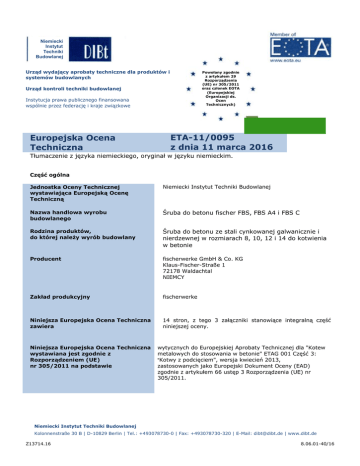 Niemiecki Instytut Techniki Budowlanej Urząd wydający aprobaty techniczne dla produktów i systemów budowlanych Powołany zgodnie z artykułem 29 Rozporządzenia (UE) nr 305/2011 oraz członek EOTA (Europejskiej Organizacji ds. Ocen Technicznych) Urząd kontroli techniki budowlanej Instytucja prawa publicznego finansowana wspólnie przez federację i kraje związkowe Europejska Ocena Techniczna ETA-11/0095 z dnia 11 marca 2016 Tłumaczenie z języka niemieckiego, oryginał w języku niemieckim. Część ogólna Jednostka Oceny Technicznej wystawiająca Europejską Ocenę Techniczną Niemiecki Instytut Techniki Budowlanej Nazwa handlowa wyrobu budowlanego Śruba do betonu fischer FBS, FBS A4 i FBS C Rodzina produktów, do której należy wyrób budowlany Śruba do betonu ze stali cynkowanej galwanicznie i nierdzewnej w rozmiarach 8, 10, 12 i 14 do kotwienia w betonie Producent fischerwerke GmbH & Co. KG Klaus-Fischer-Straße 1 72178 Waldachtal NIEMCY Zakład produkcyjny fischerwerke Niniejsza Europejska Ocena Techniczna zawiera 14 stron, z tego 3 załączniki stanowiące integralną część niniejszej oceny. Niniejsza Europejska Ocena Techniczna wystawiana jest zgodnie z Rozporządzeniem (UE) nr 305/2011 na podstawie wytycznych do Europejskiej Aprobaty Technicznej dla "Kotew metalowych do stosowania w betonie" ETAG 001 Część 3: "Kotwy z podcięciem", wersja kwiecień 2013, zastosowanych jako Europejski Dokument Oceny (EAD) zgodnie z artykułem 66 ustęp 3 Rozporządzenia (UE) nr 305/2011. Niemiecki Instytut Techniki Budowlanej Kolonnenstraße 30 B | D-10829 Berlin | Tel.: +493078730-0 | Fax: +493078730-320 | E-Mail: [email protected] | www.dibt.de Z13714.16 8.06.01-40/16 Niemiecki Instytut Techniki Budowlanej Europejska Ocena Techniczna ETA-11/0095 Strona 2 z 14 | 11 marca 2016 Niniejsza Europejska Ocena Techniczna została wydana przez Jednostkę Oceny Technicznej w jej języku urzędowym. Tłumaczenie niniejszej Europejskiej Oceny Technicznej na inne języki musi być całkowicie zgodne z oryginałem i jako takie oznaczone. Niniejsza Ocena Techniczna może być powielana/odtwarzana, także w formie elektronicznej, wyłącznie w całości i w formie nieskróconej. Częściowe jej powielenie/odtworzenie może nastąpić wyłącznie za pisemną zgodą wystawiającej ją Jednostki Oceny Technicznej. Każde częściowe powielenie/odtworzenie musi zostać jako takie oznaczone. Wystawiająca Jednostka Oceny Technicznej może odwołać niniejszą Europejską Ocenę Techniczną, w szczególności po powiadomieniu przez Komisję zgodnie z artykułem 25 ustęp 3 Rozporządzenia (UE) nr 305/2011. Z13714.16 8.06.01-40/16 Niemiecki Instytut Techniki Budowlanej Europejska Ocena Techniczna ETA-11/0095 Strona 3 z 14 | 11 marca 2016 Część szczegółowa 1 Opis techniczny produktu Śruba do betonu FBS jest kotwą wykonaną ze stali cynkowanej galwanicznie lub stali z powłoką cynkowo-lamelową (oznaczona jako FBS) lub ze stali nierdzewnej (oznaczona jako FBS A4, FBS C) w rozmiarach 8, 10, 12 i 14. Kotwa jest wkręcana do uprzednio nawierconego cylindrycznego otworu. Podczas wkręcania kotwy jej specjalny gwint nacina w podłożu kotwiącym gwint wewnętrzny. Zakotwienie następuje poprzez połączenie kształtowe gwintu specjalnego. W załączniku A przedstawiono produkt i jego opis. 2 Określenie zamierzonego celu zastosowania zgodnie z Europejskim Dokumentem Oceny Spełnienie parametrów podanych w rozdziale 3 można zakładać wyłącznie wtedy, gdy kotwa została zastosowana zgodnie z wytycznymi i warunkami określonymi w załączniku B. Metody badań i oceny stanowiące podstawę niniejszej Europejskiej Oceny Technicznej prowadzą do przyjęcia przewidywalnej długości użytkowania kotwy wynoszącej, co najmniej 50 lat. Dane dotyczące okresu użytkowania nie są równoznaczne z gwarancją producenta; są jedynie informacją pomocną przy wyborze odpowiedniego produktu pod kątem zakładanego, uzasadnionego ekonomicznie okresu użyteczności budowli. 3 Parametry produktu i dane dotyczące metod ich oceny 3.1 Wytrzymałość mechaniczna i stabilność osadzenia (BWR 1) Istotna właściwość 3.2 3.3 Parametry Wartości charakterystyczne nośności na obciążenie wyrywające i ścinające oraz zginanie w betonie Patrz załącznik C 1 i C 2 Odstępy od krawędzi i osiowe Patrz załącznik C 1 i C 2 Przemieszczenia pod obciążeniem wyrywającym i ścinającym Patrz załącznik C 3 Ochrona przeciwpożarowa (BWR 2) Istotna właściwość Reakcja na ogień Parametry Kotwa spełnia wymagania klasy A1 Odporność ogniowa Patrz załącznik C 4 Bezpieczeństwo w trakcie użytkowania (BWR 4) Istotne właściwości dotyczące bezpieczeństwa w trakcie użytkowania zostały ujęte pod wymogiem podstawowym w zakresie wytrzymałości mechanicznej i stabilności. 4 Zastosowany system oceny i sprawdzenie trwałości parametrów z podaniem podstawy prawnej Według wytycznych dla europejskiej aprobaty technicznej ETAG 001, kwiecień 2013, stosowanych jako Europejski Dokument Oceny (EAD) zgodnie z artykułem 66 ustęp 3 rozporządzenia (UE) nr 305/2011 obowiązuje następująca podstawa prawna: [96/582/WE]. Należy zastosować następujący system: 1 Z13714.16 8.06.01-40/16 Niemiecki Instytut Techniki Budowlanej Europejska Ocena Techniczna ETA-11/0095 5 Strona 4 z 14 | 11 marca 2016 Szczegóły techniczne konieczne do realizacji systemu oceny i badania parametrów zgodnie z zastosowanym Europejskim Dokumentem Oceny trwałości Szczegóły techniczne, które są konieczne do realizacji systemu oceny i badania trwałości parametrów, są składnikiem planu badań złożonego w Niemieckim Instytucie Techniki Budowlanej. Wystawiono w Berlinie w dniu 11 marca 2016 roku przez Niemiecki Instytut Techniki Budowlanej. Uwe Bender Kierownik oddziału Uwierzytelniono pieczęć okrągła Z13714.16 8.06.01-40/16 Strona 5 Europejskiej Oceny Technicznej ETA-11/0095 z dnia 11 marca 2016 Niemiecki Instytut Techniki Budowlane