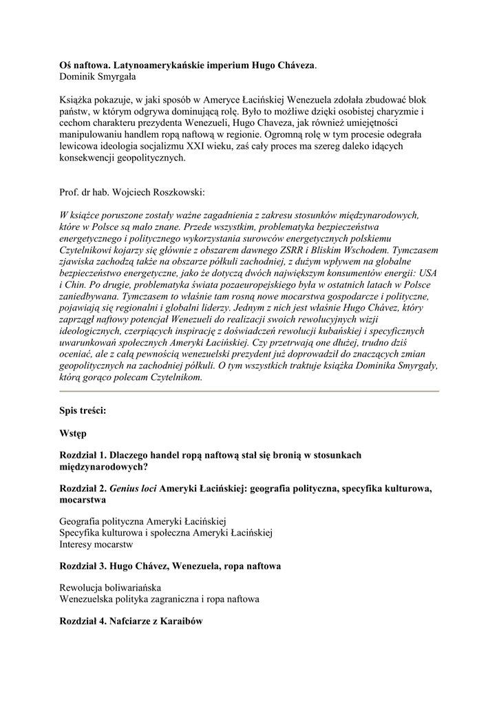 Oś naftowa. Latynoamerykańskie imperium Hugo Cháveza. Dominik Smyrgała Książka pokazuje, w jaki sposób w Ameryce Łacińskiej Wenezuela zdołała zbudować blok państw, w którym odgrywa dominującą rolę. Było to możliwe dzięki osobistej charyzmie i cechom charakteru prezydenta Wenezueli, Hugo Chaveza, jak również umiejętności manipulowaniu handlem ropą naftową w regionie. Ogromną rolę w tym procesie odegrała lewicowa ideologia socjalizmu XXI wieku, zaś cały proces ma szereg daleko idących konsekwencji geopolitycznych. Prof. dr hab. Wojciech Roszkowski: W książce poruszone zostały ważne zagadnienia z zakresu stosunków międzynarodowych, które w Polsce są mało znane. Przede wszystkim, problematyka bezpieczeństwa energetycznego i politycznego wykorzystania surowców energetycznych polskiemu Czytelnikowi kojarzy się głównie z obszarem dawnego ZSRR i Bliskim Wschodem. Tymczasem zjawiska zachodzą także na obszarze półkuli zachodniej, z dużym wpływem na globalne bezpieczeństwo energetyczne, jako że dotyczą dwóch największym konsumentów energii: USA i Chin. Po drugie, problematyka świata pozaeuropejskiego była w ostatnich latach w Polsce zaniedbywana. Tymczasem to właśnie tam rosną nowe mocarstwa gospodarcze i polityczne, pojawiają się regionalni i globalni liderzy. Jednym z nich jest właśnie Hugo Chávez, który zaprzągł naftowy potencjał Wenezueli do realizacji swoich rewolucyjnych wizji ideologicznych, czerpiących inspirację z doświadczeń rewolucji kubańskiej i specyficznych uwarunkowań społecznych Ameryki Łacińskiej. Czy przetrwają one dłużej, trudno dziś oceniać, ale z całą pewnością wenezuelski prezydent już doprowadził do znaczących zmian geopolitycznych na zachodniej półkuli. O tym wszystkich traktuje książka Dominika Smyrgały, którą gorąco polecam Czytelnikom. Spis treści: Wstęp Rozdział 1. Dlaczego handel ropą naftową stał się bronią w stosunkach międzynarodowych? Rozdział 2. Genius loci Ameryki Łacińskiej: geografia polityczna, specyfika kulturowa, mocarstwa Geografia polityczna Ameryki Łacińskiej Specyfika kulturowa i społeczna Ameryki Łacińskiej Interesy mocarstw Rozdział 3. Hugo Chávez, Wenezuela, ropa naftowa Rewolucja boliwariańska Wenezuelska polityka zagraniczna i ropa naftowa Rozdział 4. Nafciarze z Karaibów Petrocaribe Uczeń i Mistrz: stosunki z Kubą Los Comandantes: preferencyjne dostawy surowca do Hondurasu, Nikaragui i Salwadoru ALBA i współpraca energetyczna w jej ramach Rozdział 5. „Strategia kontynentalna” ALBA i dalej: stosunki z Ekwadorem, Boliwią i Argentyną Chile, Peru, Paragwaj, Urugwaj Rozdział 6. Oś ropy i kartel Oś ropy Kartel Rozdział 7. Rękawica Rozdział 8. Ekwador: uczeń przerastający mistrza Podsumowanie Bibliografia