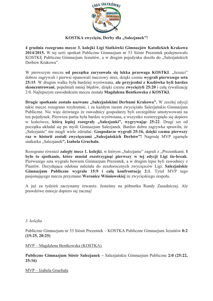 KOSTKA zwycięża, Derby dla „Salezjanek”! 4 grudnia rozegrano mecze 3. kolejki Ligi Siatkówki Gimnazjów Katolickich Krakowa 2014/2015. W tej serii spotkań Publiczne Gimnazjum nr 53 Sióstr Prezentek podejmowało KOSTKĘ Publiczne Gimnazjum Jezuitów, a w drugim pojedynku doszło do „Salezjańskich Derbów Krakowa”. W pierwszym meczu od początku zarysowała się lekka przewaga KOSTKI. „Jezuici” dobrze zagrywali i pierwsi opanowali meczowy stres, dzięki czemu wygrali pierwszego seta 25:15. W drugim walka była bardziej wyrównana, ale przyjezdni z Kozłówka byli bardzo skoncentrowani, popełniali mniej błędów, dzięki czemu zwyciężyli 25:20 i całą rywalizację 2:0. Najlepszym zawodnikiem meczu została Magdalena Bentkowska z KOSTKI. Drugie spotkanie zostało nazwane „Salezjańskimi Derbami Krakowa”. W zeszłej edycji takie mecze rozegrano trzykrotnie, i za każdym razem zwyciężało Salezjańskie Gimnazjum Publiczne. Nic więc dziwnego że zawodnicy gospodarzy byli szczególnie umotywowani na ten pojedynek. Pierwsza partia była bardzo wyrównana, a wszystko rozstrzygnęło się dopiero w końcówce, którą lepiej rozegrały „Salezjanki”, wygrywając 25:22. Drugi set od początku układał się po myśli Gimnazjum Salezjanek. Bardzo dobra zagrywka sprawiła, że „Salezjanie” nie mogli wiele zdziałać. Gospodarze wygrali 25:16, dzięki czemu pierwszy raz w historii zostali zwycięzcami „Salezjańskich Derbów”! Nagrodę MVP zgarnęła siatkarka „Salezjanek”, Izabela Gruchała. Rozegrano również zaległy mecz 1. kolejki, w którym „Salezjanie” zagrali z „Prezentkami. I było to spotkanie, które musiał rozstrzygnąć pierwszy w tej edycji Ligi tie-break. Pierwszego seta wygrało bowiem Gimnazjum Prezentek, a w drugim lepsi byli zawodnicy z Piastów. Decydująca odsłona należała do zeszłorocznych zwycięzców Ligi. Salezjańskie Gimnazjum Publiczne wygrało 15:9 i całą konfrontację 2:1. Tytuł MVP tego pasjonującego meczu przyznano Weronice Wiśniowskiej ze zwycięskiego zespołu. A już za tydzień zaczynamy rewanże. Jesteśmy na półmetku Rundy Zasadniczej. Ale prawdziwe emocje dopiero się zaczną! 3. kolejka Publiczne Gimnazjum nr 53 Sióstr Prezentek – KOSTKA Publiczne Gimnazjum Jezuitów 0:2 (15:25, 20:25) MVP – Magdalena Bentkowska (KOSTKA) Publiczne Gimnazjum Sióstr Salezjanek – Salezjańskie Gimnazjum Publiczne 2:0 (25:22, 25:16) MVP – Izabela Gruchała Zaległy mecz 1. kolejki Salezjańskie Gimnazjum Publiczne – Publiczne Gimnazjum nr 53 Sióstr Prezentek 2:1 (22:25, 25:17, 15:9) MVP – Weronika Wiśniowska (Salezjanie) Tabela: Miejsce Drużyna 1. Publiczne Gimnazjum Sióstr Salezjanek Salezjańskie Gimnazjum Publiczne KOSTKA Publiczne Gimnazjum Jezuitów Publiczne Gimnazjum nr 53 Sióstr Prezentek 2. 3. 4. Mecze Punkty Sety 3 9 6:0 „Małe punkty” 150:81 3 3 5 3 4:3 2:4 150:130 100:135 3 1 1:6 108:162