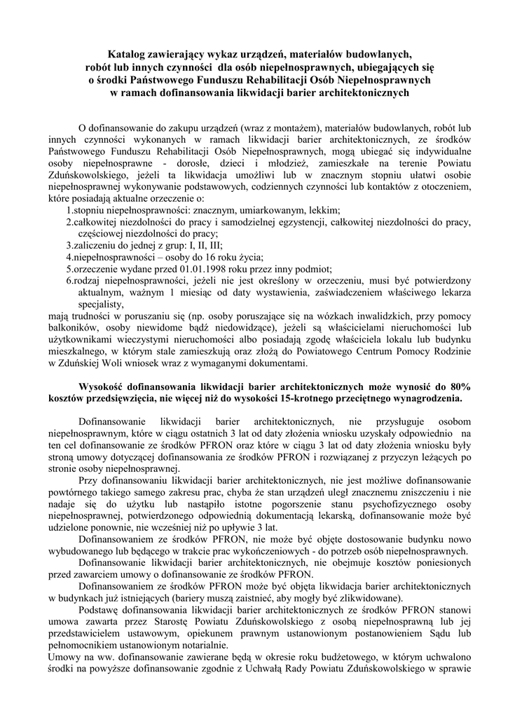 Katalog zawierający wykaz urządzeń, materiałów budowlanych, robót lub innych czynności dla osób niepełnosprawnych, ubiegających się o środki Państwowego Funduszu Rehabilitacji Osób Niepełnosprawnych w ramach dofinansowania likwidacji barier architektonicznych O dofinansowanie do zakupu urządzeń (wraz z montażem), materiałów budowlanych, robót lub innych czynności wykonanych w ramach likwidacji barier architektonicznych, ze środków Państwowego Funduszu Rehabilitacji Osób Niepełnosprawnych, mogą ubiegać się indywidualne osoby niepełnosprawne - dorosłe, dzieci i młodzież, zamieszkałe na terenie Powiatu Zduńskowolskiego, jeżeli ta likwidacja umożliwi lub w znacznym stopniu ułatwi osobie niepełnosprawnej wykonywanie podstawowych, codziennych czynności lub kontaktów z otoczeniem, które posiadają aktualne orzeczenie o: 1.stopniu niepełnosprawności: znacznym, umiarkowanym, lekkim; 2.całkowitej niezdolności do pracy i samodzielnej egzystencji, całkowitej niezdolności do pracy, częściowej niezdolności do pracy; 3.zaliczeniu do jednej z grup: I, II, III; 4.niepełnosprawności – osoby do 16 roku życia; 5.orzeczenie wydane przed 01.01.1998 roku przez inny podmiot; 6.rodzaj niepełnosprawności, jeżeli nie jest określony w orzeczeniu, musi być potwierdzony aktualnym, ważnym 1 miesiąc od daty wystawienia, zaświadczeniem właściwego lekarza specjalisty, mają trudności w poruszaniu się (np. osoby poruszające się na wózkach inwalidzkich, przy pomocy balkoników, osoby niewidome bądź niedowidzące), jeżeli są właścicielami nieruchomości lub użytkownikami wieczystymi nieruchomości albo posiadają zgodę właściciela lokalu lub budynku mieszkalnego, w którym stale zamieszkują oraz złożą do Powiatowego Centrum Pomocy Rodzinie w Zduńskiej Woli wniosek wraz z wymaganymi dokumentami. Wysokość dofinansowania likwidacji barier architektonicznych może wynosić do 80% kosztów przedsięwzięcia, nie więcej niż do wysokości 15-krotnego przeciętnego wynagrodzenia. Dofinansowanie likwidacji barier architektonicznych, nie przysługuje osobom niepełnosprawnym, które w ciągu ostatnich 3 lat od daty złożenia wniosku uzyskały odpowiednio na ten cel dofinansowanie ze środków PFRON oraz które w ciągu 3 lat od daty złożenia wniosku były stroną umowy dotyczącej dofinansowania ze środków PFRON i rozwiązanej z przyczyn leżących po stronie osoby niepełnosprawnej. Przy dofinansowaniu likwidacji barier architektonicznych, nie jest możliwe dofinansowanie powtórnego takiego samego zakresu prac, chyba że stan urządzeń uległ znacznemu zniszczeniu i nie nadaje się do użytku lub nastąpiło istotne pogorszenie stanu psychofizycznego osoby niepełnosprawnej, potwierdzonego odpowiednią dokumentacją lekarską, dofinansowanie może być udzielone ponownie, nie wcześniej niż po upływie 3 lat. Dofinansowaniem ze środków PFRON, nie może być objęte dostosowanie budynku nowo wybudowanego lub będącego w trakcie prac wykończeniowych - do potrzeb osób niepełnosprawnych. Dofinansowanie likwidacji barier architektonicznych, nie obejmuje kosztów poniesionych przed zawarciem umowy o dofinansowanie ze środków PFRON. Dofinansowaniem ze środków PFRON może być objęta likwidacja barier architektonicznych w budynkach już istniejących (bariery muszą zaistnieć, aby mogły być zlikwidowane). Podstawę dofinansowania likwidacji barier architektonicznych ze środków PFRON stanowi umowa zawarta przez Starostę Powiatu Zduńskowolskiego z osobą niepełnosprawną lub jej przedstawicielem ustawowym, opiekunem prawnym ustanowionym postanowieniem Sądu lub pełnomocnikiem ustanowionym notarialnie. Umowy na ww. dofinansowanie zawierane będą w okresie roku budżetowego, w którym uchwalono środki na powyższe dofinansowanie zgodnie z Uchwałą Rady Powiatu Zduńskowolskiego w sprawie określenia zadań i wysokości środków finansowych Państwowego Funduszu Rehabilitacji Osób Niepełnosprawnych, przeznaczonych na realizację tych zadań przez Powiat. Dofinansowaniem ze środków PFRON może być objęty zakup urządzeń, materiałów budowlanych (wraz z robocizną), robót lub innych czynności w ramach likwidacji barier architektonicznych, zawartych w niniejszym katalogu, który w szczególności obejmuje: I. Dla osób niepełnosprawnych z dysfunkcją narządu ruchu lub z koniecznością poruszania się na wózku inwalidzkim 1.budowę pochylni i dojścia do budynku mieszkalnego, zapewniającego osobom niepełnosprawnym samodzielny dostęp do lokalu; 2.dostawę, zakup i montaż urządzenia do transportu pionowego: podnośnika, platformy schodowej, transportera schodowego, windy przyściennej, dźwigu, innych urządzeń; 4.opłaty poniesione z tytułu sporządzenia dokumentów stanowiących podstawę do wydania zgody na dopuszczenie do eksploatacji urządzenia, jeżeli konieczność uzyskania takiej zgody wynika z odrębnych przepisów; 5.dostawę, zakup i montaż poręczy i uchwytów w ciągach komunikacyjnych oraz uchwytów ułatwiających korzystanie z urządzeń higieniczno-sanitarnych; 6.roboty polegające na: likwidacji progów, likwidacji zróżnicowania poziomu podłogi; 7. przystosowanie drzwi: zakup i montaż drzwi o szerokości w świetle ościeżnicy co najmniej 90 cm, zakup i montaż drzwi przesuwnych, zakup i zamontowanie systemu otwierania drzwi, w tym balkonowych, przyciskiem (dla wnioskodawców o niesprawnych rękach), zakup i montaż zabezpieczenia drzwi (do wysokości 40 cm od podłogi) przed uszkodzeniami mechanicznymi i zainstalowanie ościeżnicy stalowej - wyłącznie wnioskodawcom poruszającym się na wózku inwalidzkim, zakup i montaż okuć do drzwi balkonowych i okien, umożliwiające ich samodzielną obsługę przez osobę niepełnosprawną poruszającą się na wózku inwalidzkim, gdy montaż okuć ze względu na stan techniczny okien i drzwi balkonowych jest możliwy - w kuchni i jednym po
