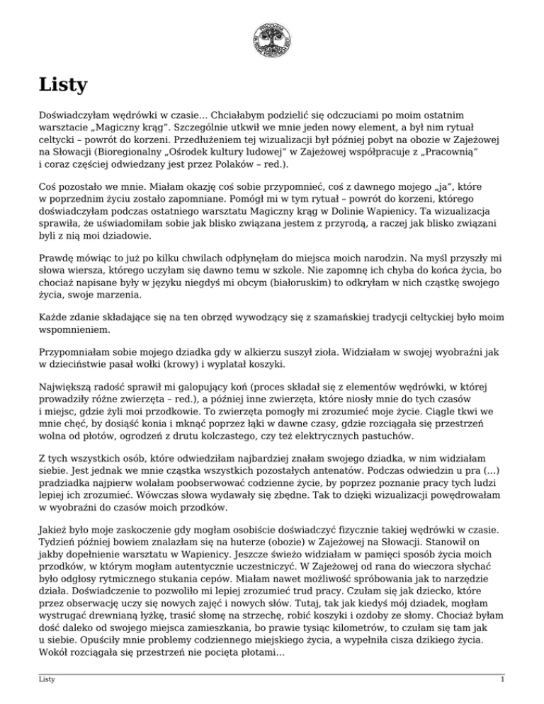 Listy Doświadczyłam wędrówki w czasie… Chciałabym podzielić się odczuciami po moim ostatnim warsztacie „Magiczny krąg”. Szczególnie utkwił we mnie jeden nowy element, a był nim rytuał celtycki – powrót do korzeni. Przedłużeniem tej wizualizacji był później pobyt na obozie w Zajeżowej na Słowacji (Bioregionalny „Ośrodek kultury ludowej” w Zajeżowej współpracuje z „Pracownią” i coraz częściej odwiedzany jest przez Polaków – red.). Coś pozostało we mnie. Miałam okazję coś sobie przypomnieć, coś z dawnego mojego „ja”, które w poprzednim życiu zostało zapomniane. Pomógł mi w tym rytuał – powrót do korzeni, którego doświadczyłam podczas ostatniego warsztatu Magiczny krąg w Dolinie Wapienicy. Ta wizualizacja sprawiła, że uświadomiłam sobie jak blisko związana jestem z przyrodą, a raczej jak blisko związani byli z nią moi dziadowie. Prawdę mówiąc to już po kilku chwilach odpłynęłam do miejsca moich narodzin. Na myśl przyszły mi słowa wiersza, którego uczyłam się dawno temu w szkole. Nie zapomnę ich chyba do końca życia, bo chociaż napisane były w języku niegdyś mi obcym (białoruskim) to odkryłam w nich cząstkę swojego życia, swoje marzenia. Każde zdanie składające się na ten obrzęd wywodzący się z szamańskiej tradycji celtyckiej było moim wspomnieniem. Przypomniałam sobie mojego dziadka gdy w alkierzu suszył zioła. Widziałam w swojej wyobraźni jak w dzieciństwie pasał wołki (krowy) i wyplatał koszyki. Największą radość sprawił mi galopujący koń (proces składał się z elementów wędrówki, w której prowadziły różne zwierzęta – red.), a później inne zwierzęta, które niosły mnie do tych czasów i miejsc, gdzie żyli moi przodkowie. To zwierzęta pomogły mi zrozumieć moje życie. Ciągle tkwi we mnie chęć, by dosiąść konia i mknąć poprzez łąki w dawne czasy, gdzie rozciągała się przestrzeń wolna od płotów, ogrodzeń z drutu kolczastego, czy też elektrycznych pastuchów. Z tych wszystkich osób, które odwiedziłam najbardziej znałam swojego dziadka, w nim widziałam siebie. Jest jednak we mnie cząstka wszystkich pozostałych antenatów. Podczas odwiedzin u pra (…) pradziadka najpierw wolałam poobserwować codzienne życie, by poprzez poznanie pracy tych ludzi lepiej ich zrozumieć. Wówczas słowa wydawały się zbędne. Tak to dzięki wizualizacji powędrowałam w wyobraźni do czasów moich przodków. Jakież było moje zaskoczenie gdy mogłam osobiście doświadczyć fizycznie takiej wędrówki w czasie. Tydzień później bowiem znalazłam się na huterze (obozie) w Zajeżowej na Słowacji. Stanowił on jakby dopełnienie warsztatu w Wapienicy. Jeszcze świeżo widziałam w pamięci sposób życia moich przodków, w którym mogłam autentycznie uczestniczyć. W Zajeżowej od rana do wieczora słychać było odgłosy rytmicznego stukania cepów. Miałam nawet możliwość spróbowania jak to narzędzie działa. Doświadczenie to pozwoliło mi lepiej zrozumieć trud pracy. Czułam się jak dziecko, które przez obserwację uczy się nowych zajęć i nowych słów. Tutaj, tak jak kiedyś mój dziadek, mogłam wystrugać drewnianą łyżkę, trasić słomę na strzechę, robić koszyki i ozdoby ze słomy. Chociaż byłam dość daleko od swojego miejsca zamieszkania, bo prawie tysiąc kilometrów, to czułam się tam jak u siebie. Opuściły mnie problemy codziennego miejskiego życia, a wypełniła cisza dzikiego życia. Wokół rozciągała się przestrzeń nie pocięta płotami… Listy 1 Szkoda, że tydzień minął tak szybko i musiałam wrócić do rzeczywistości gdzie nawet na wsi taki tryb życia nazwanoby zacofaniem. Na podlaskich wsiach tradycja zamiera. Młodzież nie zna już ludowych tańców i pieśni, nie mówiąc o rzemiośle ludowym. Wczoraj, przechodząc przez ulicę, chciałoby się powiedzieć mojego miasta, odczułam brak rozgwieżdżonego nieba z Zajeżowej, ciszy bez samochodów i ciemności nocy. Odczułam tęsknotę nie tylko za zrobieniem czegoś nowego, ale również za osobami, które tam poznałam. Ewa Kamieńska Listy 2