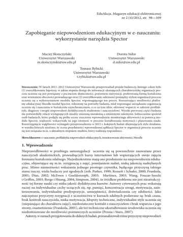 EduAkcja. Magazyn edukacji elektronicznej nr 2 (4)/2012, str. 98—109 Zapobieganie niepowodzeniom edukacyjnym w e-nauczaniu: wykorzystanie narzędzia Spector Maciej Słomczyński Uniwersytet Warszawski [email protected] Dorota Sidor Uniwersytet Warszawski [email protected] Tomasz Rybicki Uniwersytet Warszawski [email protected] Streszczenie: W latach 2011–2012 Uniwersytet Warszawski przeprowadzał projekt badawczy, którego celem było (1) zweryfikowanie hipotezy, w jakim stopniu dostęp do informacji ukazujących charakterystykę organizacji procesu uczenia się jest powiązany z poczuciem skuteczności, poziomem motywacji, preferowaną formą kształcenia oraz wrażeniem obecności prowadzącego oraz (2) zweryfikowanie zależności pomiędzy stylem organizacji procesu uczenia się a wykorzystaniem modułu Spector, wspomagającego ten proces. Rozszerzający możliwości platformy edukacyjnej Moodle moduł Spector, wdrożony na potrzeby badania, miał wspomagać zarządzanie organizacją uczenia się i nauczania w kształceniu asynchronicznym, a co za tym idzie, oferować wsparcie w zakresie profilaktyki, diagnozy i terapii niepowodzeń dydaktycznych studentom i nauczycielowi. Wyniki pierwszej części badania nie potwierdziły relacji występujących miedzy zmienną niezależną a zmiennymi zależnymi. Jednocześnie spośród osób badanych, które podjęły się próby oceny znaczenia wprowadzenia monitoringu aktywności za pomocą modułu Spector, większość wskazywała na jego istotność w procesie kształtowania motywacji i planowania nauki. Rozstrzygnięcie wątpliwości wymagało przeprowadzenia w 2012 r. kolejnych badań obejmujących style działania, w wyniku których ustalono, że ocena przydatności wprowadzonej aplikacji Spector w organizacji procesu uczenia się jest związana m.in. z aktualnym stopniem studiów, który realizują respondenci. Słowa kluczowe: e-nauczanie, profilaktyka niepowodzeń edukacyjnych, monitorowanie aktywności, Moodle 1. Wprowadzenie Nieprawidłowości w przebiegu samoregulacji uczenia się są powszechnie zauważane przez nauczycieli akademickich, prowadzących kursy internetowe lub wspierających swoje zajęcia formami kształcenia zdalnego. Niejednokrotnie mają one przełożenie na niepowodzenia edukacyjne, objawiające się m.in. rezygnacją z zajęć, pomijaniem zadań, niską jakością nadsyłanych prac. Mimo niemożności wskazania jednego prostego czynnika, będącego przyczyną takiego stanu rzeczy, wielu badaczy jest zgodnych (zob. Parker, 1999; Rossett i Schafer, 2000; Frankola, 2001; Diaz, 2002; McEwen i Gueldenzoph, 2003; Martinez, 2003; Wang, Foucar-Szocki i Griffen, 2003; Berge i Huang, 2004; Simpson, 2004), że źródłem problemu nie jest nieatrakcyjność tej formy nauki czy niska jakość dydaktyczna kursów. Autorzy cytowanych prac wskazują raczej na indywidualne cechy uczących się, np. pamięć, koncentracja uwagi, motywacja, zainteresowania, indywidualne predyspozycje, umiejętności, doświadczenia czy zdolności. Jako najczęstsze przyczyny rezygnacji z uczestnictwa w kursach zdalnych podawane są: brak czasu, brak kontroli nauczyciela, niska motywacja, kłopoty techniczne, indywidualne style uczenia się (niepasujące do charakteru zajęć), niedostateczny kontakt z nauczycielem i brak wsparcia z jego strony, osamotnienie (Frankola, 2001), ale też techniczne ukształtowanie środowiska uczenia się niedostosowane do możliwości poznawczych uczniów (Penna i Stara, 2007). Autorzy, w ramach przygotowania do dalszych badań, przeanalizowali różne przyczyny niepowodzeń Maciej Słomczyński, Dorota Sidor, Tomasz Rybicki, Zapobieganie niepowodzeniom... edukacyjnych(dydaktyczne,społeczno-ekonomiczne,biopsychiczne)iwyodrębnilispecyficzneuwarunkowania środowiskowe, które zdają się być nadrzędnymi dla niepowodzeń edukacyjnych w e-kształceniu (Słomczyński i Sidor, 2011). Według autorów, najważniejsze przyczyny niepowodzeń edukacyjnych w kształceniu zdalnym to nie tylko ograniczony dostęp do infrastruktury (komputerów, oprogramowania, łącza internetowego) czy warunki bytowe (socjalne) lub rodzinne, lecz przede wszystkim właściwości środowiska sieciowego, w którym odbywa się proces nauczania−uczenia się. Autorzy założyli, że w przypadku kształcenia asynchronicznego to przede wszystkim obecność dystraktorów, swoboda w doborzeczasuuczeniasięwrazzbrakiempoczuciaobecnościnauczycielaprzyczyniająsiędowystępowania niepowodzeń edukacyjnych. Jednocześnie z wcześniejszych badań (Słomczyński, 2009b, 2010) wynika, że źródła tych niepowodzeń są związane nie tylko z uwarunkowaniami procesu nauczania, ale przede wszystkim dotyczą procesu uczenia się. W przypadku kształcenia zdalnego u podstaw problemów leżą m.in. niewłaściwe nawyki organizacyjne ucznia, które utrudniają, a czasem wręcz uniemożliwiają korzystanie z tej formy kształcenia. Połączenie wspomnianych trudności w odpowiedniej organizacji procesu uczenia się ze środowiskiem, które nie tylko nie wspiera wdrażania dobrych nawyków w tym zakresie, ale wręcz wzmacnia złe, może skutkować zatem zwiększoną w stosunku do kształcenia tradycyjnego skalą problemu niepowodzeń edukacyjnych. Diagnoza niepowodzeń, tak jak w kształceniu tradycyjnym, musi opierać się na wnikliwej obserwacji. Również w kontakcie zapośredniczonym nauczyciel dysponuje wieloma możliwościami przyglądania się aktywności uczniów – chociażby dzięki systematycznej analizie rejestrów aktywności (logów) na platformie. Niepowodzenia doświadcza nie tylko student, który przestaje wchodzić na kurs, ale też student, który oddaje prace tuż przed terminem, pomija całe partie materiału, wywiązuje się tylko z część zadań lub wykonuje je niedbale. Przedmiotem badań było sprawdzenie, w jakim stopniu udostępnienie studentowi informacji ukazujących charakterystykę jego organizacji procesu uczenia się jest powi