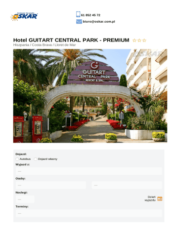 61 852 45 72 [email protected] Hotel GUITART CENTRAL PARK - PREMIUM Hiszpania / Costa Brava / Lloret de Mar Dojazd: Autobus Dojazd własny Wyjazd z: Osoby: Noclegi: Dzień wyjazdu Terminy: Pokój: Wyżywienie: Najtańsza oferta First Minute cena katalogowa do 6 marca 2017: 522,60 zł do 6 marca 2017: 522,60 zł do 4 maja 2017: 1219,40 zł do 4 maja 2017: 1219,40 zł Suma:1742,00 zł Suma: 1742,00 zł Opis oferty Miejscowość Przejazd autokarem PREMIUM Wycieczki autokar-premium-oskar-tablet-gniazdko-usb-wygodne-fotele fakultatywne Realizacja imprezy autokarami PREMIUM to gwarancja: transportu Opinie autokarami z roczników 2015 i 2016 produkcji Irizar i VDL indywidualnego, multimedialnego systemu rozrywki - tablet z dotykowym ekranem w każdym zagłówku (filmy, gry, muzyka itp.). Możliwość podłączenia własnego nośnika danych poprzez wejście AUX lub USB. najwyższej klasy skórzanych lub półskórzanych foteli z możliwością regulacji oparcia lub/i zagłówka największej w Polsce przestrzeni między siedzeniami małej półki przed każdym siedzeniem + siateczki na czasopisma, książki czy telefon bezpłatnego dostępu do sieci WiFi na terenie Polski* gniazdek elektrycznych 230V wydajnej klimatyzacji sterowanej indywidualnie bogato wyposażonego barku udostępnionego w czasie jazdy WC na pokładzie autokaru Idealna i komfortowa podróż… ZAWSZE! Na ternie Polski GWARANTUJEMY, że wszystkie przejazdy realizowane są autobusem, busem lub samochodem osobowym. Zapewnimy komfortowy transport na każdym etapie podróży. Ważne: Autokar Premium jest autokarem docelowym. *jakość usług internetowych może różnić się w zależności od jakości sygnału Atuty kompleks 5 basenów bezpłatne leżaki i parasole bezpłatne zaplecze sportowo-rekreacyjne wspaniały ogród ze sztucznymi wodospadami i tarasami słonecznymi blisko plaży i centrum Położenie Hotel o standardzie 3* należący do doskonale znanej i rozpoznawalnej na europejskim rynku sieci Hoteli Guitart. Guitart Central Park jest uznawany przez wielu Klientów za najatrakcyjniejszy obiekt hotelowy w Lloret de Mar. Położony zaledwie ok. 400 m od plaży "Fanals" i ok. 400 m. od ścisłego centrum Lloret de Mar gwarantuje łatwy dostęp do wszystkich atrakcji oferowanych przez miejscowość Lloret de Mar. Na terenie hotelu do dyspozycji gości jest aż 5 basenów, z czego 4 są otwarte, a poza sezonem 1 z nich jest podgrzewany i kryty. Otoczenie hotelu to pięknie zagospodarowany teren zielony opływający kwiatami, ozdobnymi krzewami i sztucznymi wodospadami pośród których znajdują się tarasy do kąpieli słonecznych. Bezpłatnie do dyspozycji gości są leżaki i parasole. Bogate zaplecze sportoworekreacyjne w ramach którego bezpłatnie korzystać można z kortów tenisowych, ściany wspinaczkowej, tenisa stołowego. Ponadto za opcjonalną opłatą na miejscu - siłownia, sauna, gabinet masażu, bilard. Ponadto hotel oferuje doskonałą, urozmaiconą kuchnię w formie bufetu oraz bogaty program animacyjny dla swoich gości. Guitart Central Park cieszy się bardzo dobrą opinią Klientów z racji na wykwalifikowaną obsługę, międzynarodową atmosferę, doskonałą lokalizację oraz znakomity stosunek ceny do jakości. Zakwaterowanie Pokoje dwuosobowe z łazienkami z możliwością dostawki. Wszystkie pokoje maja TV, sejf ( za opcjonalną dopłatą na miejscu), telefon, klimatyzację (bezpłatną) oraz balkony lub tarasy. Dostępne opcje zakwaterowania pokój 2 osobowy z możliwością dostawki dokwaterowanie (bez dopłat*) lub pokój 1 osobowy (dopłata) *dokwaterowanie: osoby wybierając się pojedynczo, które w momencie rezerwacji nie dokonują dopłaty do pokoju jednoosobowego, mogą zostać zakwaterowanie z jedną lub kilkoma osobami tej samej płci w tzw. opcji dokwaterowania; jednakże w przypadku braku innej rezerwacji w opcji dokwaterowania w terminie do 7 dni przed rozpoczęciem imprezy wymagana jest dopłata do pokoju 1 osobowego Dostępne opcje wyżywienia śniadania (w cenie) obiadokolacje (opcja) Pakiet KOMFORT gwarancja wyboru miejsca w autokarze napoje w autokarze w cenie (6 x do wyboru: kawa, herbata, zimny napój 0,2l) cena: 50 zł/os Pakiet PRESTIGE gwarancja wyboru miejsca w autokarze napoje w autokarze w cenie (6 x do wyboru: kawa, herbata, zimny napój 0,2l) pierwszeństwo wejścia na pokład autokaru nadbagaż 5 kg w cenie suchy prowiant na drogę powrotną cena: 100 zł/os Karta Dużej Rodziny www.oskar.com.pl/zalaczniki/karta_duzej_rodziny Warunki promocji FIRST MINUTE www.oskar.com.pl/zalaczniki/warunki_promocji Ubezpieczenie Warunki ubezpieczenia Bezpieczne Podróże Signal Iduna dokument do pobrania www.oskar.com.pl/zalaczniki/owu Warunki ubezpieczenia Kosztów Imprezy Turystycznej Signal Iduna dokument do pobrania www.oskar.com.pl/zalaczniki/owurg Turystyczny Fundusz Gwarancyjny W związku z powołaniem do życia w dniu 26.11.2016 Turystycznego Funduszu Gwarancyjnego każdy klient Biura Podróży Oskar zobowiązany jest do zapłaty kwoty w wysokości 10zł/os. przy każdorazowej rezerwacji imprezy turystycznej (obowiązuje od dnia 26.11.2016). Kwota przeznaczona na Turystyczny Fundusz Gwarancyjny zostanie automatycznie doliczona do wartości rezerwacji (w momencie jej dokonania). Wyjątkiem są imprezy turystyczne odbywające się w krajach posiadających granicę z Rzeczpospolitą Polską. Składka nie jest przychodem biura. Udogodnienia Klimatyzacja Animacje dla dzieci Regulowane fotele Tacki Multimedia Nowoczesna flota Zawodowy kierowca Pasy bezpieczeństwa Toaleta w autokarze Podnóżki Fitness Dla rodzin z dziećmi Wi-Fi Basen kryty Winda Blisko centrum Życie nocne Bez paszportu Basen odkryty Parking Premium Elite Restauracja hotelowa Region nadmorski Tenis Program ramowy Dzień 1 Wyjazd w Polski zgodnie z rozkładem jazdy autokarów. Przejazd przez Niemcy, Francję. Dzień 2 Przyjazd do Lloret de Mar w godzinach okołopołudniowych. Zakwaterowanie od godz. 14-00. Dzień 3-1