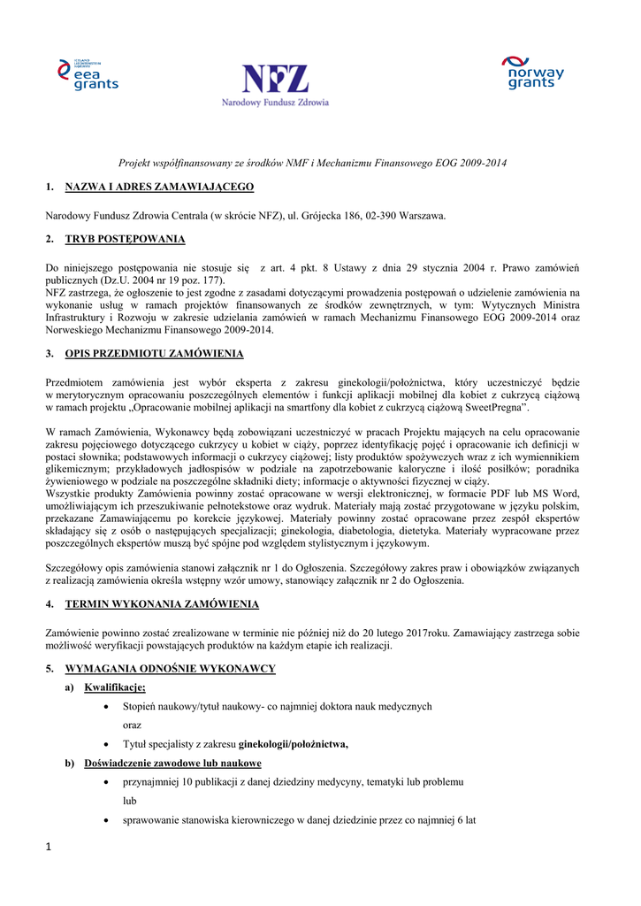 Projekt współfinansowany ze środków NMF i Mechanizmu Finansowego EOG 2009-2014 1. NAZWA I ADRES ZAMAWIAJĄCEGO Narodowy Fundusz Zdrowia Centrala (w skrócie NFZ), ul. Grójecka 186, 02-390 Warszawa. 2. TRYB POSTĘPOWANIA Do niniejszego postępowania nie stosuje się z art. 4 pkt. 8 Ustawy z dnia 29 stycznia 2004 r. Prawo zamówień publicznych (Dz.U. 2004 nr 19 poz. 177). NFZ zastrzega, że ogłoszenie to jest zgodne z zasadami dotyczącymi prowadzenia postępowań o udzielenie zamówienia na wykonanie usług w ramach projektów finansowanych ze środków zewnętrznych, w tym: Wytycznych Ministra Infrastruktury i Rozwoju w zakresie udzielania zamówień w ramach Mechanizmu Finansowego EOG 2009-2014 oraz Norweskiego Mechanizmu Finansowego 2009-2014. 3. OPIS PRZEDMIOTU ZAMÓWIENIA Przedmiotem zamówienia jest wybór eksperta z zakresu ginekologii/położnictwa, który uczestniczyć będzie w merytorycznym opracowaniu poszczególnych elementów i funkcji aplikacji mobilnej dla kobiet z cukrzycą ciążową w ramach projektu „Opracowanie mobilnej aplikacji na smartfony dla kobiet z cukrzycą ciążową SweetPregna”. W ramach Zamówienia, Wykonawcy będą zobowiązani uczestniczyć w pracach Projektu mających na celu opracowanie zakresu pojęciowego dotyczącego cukrzycy u kobiet w ciąży, poprzez identyfikację pojęć i opracowanie ich definicji w postaci słownika; podstawowych informacji o cukrzycy ciążowej; listy produktów spożywczych wraz z ich wymiennikiem glikemicznym; przykładowych jadłospisów w podziale na zapotrzebowanie kaloryczne i ilość posiłków; poradnika żywieniowego w podziale na poszczególne składniki diety; informacje o aktywności fizycznej w ciąży. Wszystkie produkty Zamówienia powinny zostać opracowane w wersji elektronicznej, w formacie PDF lub MS Word, umożliwiającym ich przeszukiwanie pełnotekstowe oraz wydruk. Materiały mają zostać przygotowane w języku polskim, przekazane Zamawiającemu po korekcie językowej. Materiały powinny zostać opracowane przez zespół ekspertów składający się z osób o następujących specjalizacji; ginekologia, diabetologia, dietetyka. Materiały wypracowane przez poszczególnych ekspertów muszą być spójne pod względem stylistycznym i językowym. Szczegółowy opis zamówienia stanowi załącznik nr 1 do Ogłoszenia. Szczegółowy zakres praw i obowiązków związanych z realizacją zamówienia określa wstępny wzór umowy, stanowiący załącznik nr 2 do Ogłoszenia. 4. TERMIN WYKONANIA ZAMÓWIENIA Zamówienie powinno zostać zrealizowane w terminie nie później niż do 20 lutego 2017roku. Zamawiający zastrzega sobie możliwość weryfikacji powstających produktów na każdym etapie ich realizacji. 5. WYMAGANIA ODNOŚNIE WYKONAWCY a) Kwalifikacje; Stopień naukowy/tytuł naukowy- co najmniej doktora nauk medycznych oraz Tytuł specjalisty z zakresu ginekologii/położnictwa, b) Doświadczenie zawodowe lub naukowe przynajmniej 10 publikacji z danej dziedziny medycyny, tematyki lub problemu lub 1 sprawowanie stanowiska kierowniczego w danej dziedzinie przez co najmniej 6 lat 6. WYKONAWCA ZOBOWIĄZANY JEST ZAŁĄCZYĆ DO OFERTY NASTĘPUJĄCE DOKUMENTY: a. 7. Wykaz wykonanych usług i. Wykonawca zobowiązany jest przedstawić swoje CV ii. Udokumentować swój dorobek naukowy. INFORMACJA O OSOBACH UPRAWNIONYCH DO POROZUMIEWANIA SIĘ Z WYKONAWCAMI W sprawach dotyczących przedmiotu zamówienia informacji udzielają: Agata Szymczak, tel. 225726273 8. TERMIN SKŁADANIA OFERT Oferty należy składać drogą elektroniczną na adres:[email protected] w terminie do dnia16 listopada 2016r. 9. OPIS SPOSOBU OBLICZENIA CENY Zamawiający wymaga, by oferowana cena została przedstawiona jako cena brutto (z wliczonym do ceny podatkiem od towarów i usług VAT), którą Zamawiający przyjmuje jako podstawę do oceny ofert i która w toku postępowania nie może ulec zmianie. 10. OCENA OFERT Do oceny ofert Zamawiający przyjął kryterium określone w ogłoszeniu o zamówieniu wraz ze wskazaniem jego znaczenia (wagą wyrażoną w % udziale w ocenie oferty). Zaokrąglenia w obliczeniach końcowych punktacji - do dwóch miejsc po przecinku. Szczegółowe zasady oceny z tytułu kryterium zostały przedstawione poniżej. a. Kryterium I : CENA (40% wagi oceny) i. Z tytułu niniejszego kryterium maksymalna liczba punktów wynosi 100. ii. Oferta o najwyższej liczbie przyznanych podpunktów uzyska 100 punktów. Pozostałe oferty uzyskają liczbę punktów zgodnie z poniższym wzorem: C m = K K n m ´100 Gdzie: m - oznacza kolejną badaną ofertę, Cm - oznacza wynik oceny kolejnej badanej oferty w zakresie kryterium CENA, Kn - oznacza najkorzystniejszą (najniższą) cenę brutto badanej oferty, Km - oznacza cenę brutto kolejnej badanej oferty. . b. 2 Kryterium II: DOŚWIADCZENIE (20% wagi oceny) i. Z tytułu niniejszego kryterium maksymalna liczba podpunktów wynosi 100. ii. Oferta o liczbie publikacji przekraczającej 10 uzyska 100 podpunktów. Pozostałe podpunkty przyznane dla badanych ofert zostaną porównane z ofertą o najwyższej liczbie podpunktów, stosując poniższy wzór: D m = K K Gdzie: m - oznacza kolejną badaną ofertę, Dm - oznacza wynik oceny kolejnej badanej oferty w zakresie kryterium doświadczenia, Kn - oznacza liczbę przyznanych podpunktów kolejnej badanej oferty, Km - oznacza najwyższą liczbę przyznanych podpunktów. ´100 n m iii. Liczba przyznanych podpunktów dla poszczególnych Ofert, jest zależna od liczby przedstawionych w ofercie wypracowanych dokumentów : poniżej 10 publikacji - 0 ppkt c. Kryterium III: ILOSC OSOBOGODZIN PRACY EKSPERTA (40% wagi ceny ) i. Zamawiający przeznaczył na realizację tego zadania kwotę 4400 zł brutto na eksperta. ii. Minimalna wymagana ilość osobogodzin pracy eksperta wynosi 40 . iii. Wykonawca, który zaoferuje najkorzystniejszą wartość otrzyma maksymalną liczbę punktów. Pozostali Wykonawcy otrzymają liczbę punktów obliczoną wed