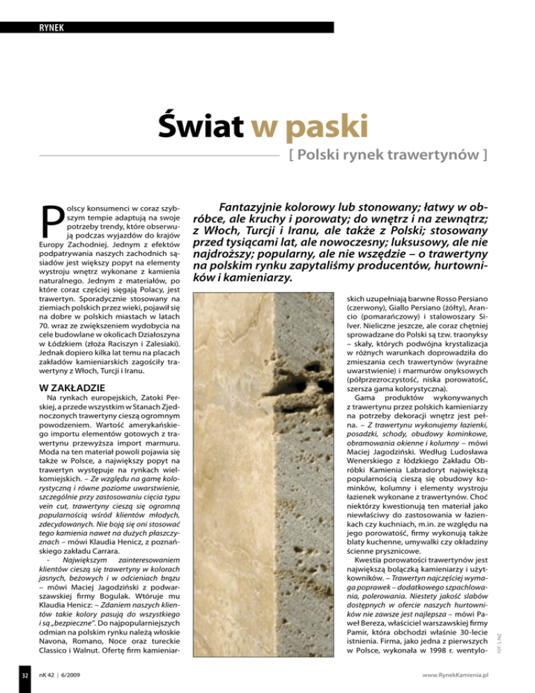 Rynek Świat w paski [ Polski rynek trawertynów ] W zakładzie Na rynkach europejskich, Zatoki Perskiej, a przede wszystkim w Stanach Zjednoczonych trawertyny cieszą ogromnym powodzeniem. Wartość amerykańskiego importu elementów gotowych z trawertynu przewyższa import marmuru. Moda na ten materiał powoli pojawia się także w Polsce, a największy popyt na trawertyn występuje na rynkach wielkomiejskich. – Ze względu na gamę kolorystyczną i równe poziome uwarstwienie, szczególnie przy zastosowaniu cięcia typu vein cut, trawertyny cieszą się ogromną popularnością wśród klientów młodych, zdecydowanych. Nie boją się oni stosować tego kamienia nawet na dużych płaszczyznach – mówi Klaudia Henicz, z poznańskiego zakładu Carrara. Największym zainteresowaniem klientów cieszą się trawertyny w kolorach jasnych, beżowych i w odcieniach brązu – mówi Maciej Jagodziński z podwarszawskiej firmy Bogulak. Wtóruje mu Klaudia Henicz: – Zdaniem naszych klientów takie kolory pasują do wszystkiego i są „bezpieczne”. Do najpopularniejszych odmian na polskim rynku należą włoskie Navona, Romano, Noce oraz tureckie Classico i Walnut. Ofertę firm kamieniar32 nK 42 | 6/2009 Fantazyjnie kolorowy lub stonowany; łatwy w obróbce, ale kruchy i porowaty; do wnętrz i na zewnątrz; z Włoch, Turcji i Iranu, ale także z Polski; stosowany przed tysiącami lat, ale nowoczesny; luksusowy, ale nie najdroższy; popularny, ale nie wszędzie – o trawertyny na polskim rynku zapytaliśmy producentów, hurtowników i kamieniarzy. skich uzupełniają barwne Rosso Persiano (czerwony), Giallo Persiano (żółty), Arancio (pomarańczowy) i stalowoszary Silver. Nieliczne jeszcze, ale coraz chętniej sprowadzane do Polski są tzw. traonyksy – skały, których podwójna krystalizacja w różnych warunkach doprowadziła do zmieszania cech trawertynów (wyraźne uwarstwienie) i marmurów onyksowych (półprzezroczystość, niska porowatość, szersza gama kolorystyczna). Gama produktów wykonywanych z trawertynu przez polskich kamieniarzy na potrzeby dekoracji wnętrz jest pełna. – Z trawertynu wykonujemy łazienki, posadzki, schody, obudowy kominkowe, obramowania okienne i kolumny – mówi Maciej Jagodziński. Według Ludosława Wenerskiego z łódzkiego Zakładu Obróbki Kamienia Labradoryt największą popularnością cieszą się obudowy kominków, kolumny i elementy wystroju łazienek wykonane z trawertynów. Choć niektórzy kwestionują ten materiał jako niewłaściwy do zastosowania w łazienkach czy kuchniach, m.in. ze względu na jego porowatość, firmy wykonują także blaty kuchenne, umywalki czy okładziny ścienne prysznicowe. Kwestia porowatości trawertynów jest największą bolączką kamieniarzy i użytkowników. – Trawertyn najczęściej wymaga poprawek – dodatkowego szpachlowania, polerowania. Niestety jakość slabów dostępnych w ofercie naszych hurtowników nie zawsze jest najlepsza – mówi Paweł Bereza, właściciel warszawskiej firmy Pamir, która obchodzi właśnie 30-lecie istnienia. Firma, jako jedna z pierwszych w Polsce, wykonała w 1998 r. wentylowww.RynekKamienia.pl fot: s. paź P olscy konsumenci w coraz szybszym tempie adaptują na swoje potrzeby trendy, które obserwują podczas wyjazdów do krajów Europy Zachodniej. Jednym z efektów podpatrywania naszych zachodnich sąsiadów jest większy popyt na elementy wystroju wnętrz wykonane z kamienia naturalnego. Jednym z materiałów, po które coraz częściej sięgają Polacy, jest trawertyn. Sporadycznie stosowany na ziemiach polskich przez wieki, pojawił się na dobre w polskich miastach w latach 70. wraz ze zwiększeniem wydobycia na cele budowlane w okolicach Działoszyna w Łódzkiem (złoża Raciszyn i Zalesiaki). Jednak dopiero kilka lat temu na placach zakładów kamieniarskich zagościły trawertyny z Włoch, Turcji i Iranu. Rynek waną elewację z płyt trawertynowych na biurowcu Zielna Point w Warszawie. Bereza wymienia też inne wady trawertynów: – To materiał nieprzewidywalny. Kruchy i łamliwy. Konieczność utrzymania usłojenia na montowanych powierzchniach powoduje powstawanie dużej ilości odpadu. Szpachlowanie przeciętych krawędzi nigdy nie jest zgodne z widokiem płaszczyzn. Inni nie są tak surowi w ocenach. – Z punktu widzenia kamieniarza zaletą trawertynu jest stosunkowa łatwość cięcia, klejenia i szlifowania. To miękki materiał, więc jego obróbka nie jest tak pracochłonna, jak np. granitu. Wadą jest natomiast jego porowatość i kruchość – mówi Maciej Jagodziński. Ludosław Wenerski wskazuje na jeszcze jeden problem, z jakim spotykają się przedsiębiorcy: – Kamieniarze niechętnie przechowują kamień w zamkniętych i ogrzewanych pomieszczeniach. W przypadku trawertynu warto pamiętać o właściwym jego składowaniu. To wszystko powoduje, że w magazynie nie ma większych partii tych materiałów. Porowatość ma też znaczący wpływ na rodzaje obróbki powierzchni oferowanych materiałów. W ofercie zakładów znajdują się płyty surowe, szczotkowane, polerowane, żywicowane, szpachlowane. Użycie dwóch ostatnich ogranicza się praktycznie wyłącznie do wnętrz. – Warunki pogodowe, jakie panują w Polsce, duże roczne różnice temperatur i wielkości opadów, mogą powodować niszczenie i wypadanie żywicy czy szpachli – mówi Wenerski. By zapewnić możliwie najwyższą jakość żywicowania i szpachlowania, polscy kamieniarze chętnie zakupują materiał uszlachetniony w zakładach obróbki we Włoszech. Dodatkowe uszlachetnienie płyt sprowadzonych bezpośrednio z Turcji lub Iranu może być problematyczne. – Próbowaliśmy żywicować we własnym zakresie płyty o nie najlepszej jakości obróbki. Niestety nie posiadając pieców do żywicowania, nawet w gorące lato nie uzyskaliśmy oczekiwanej twardości żywicy – opowiada Paweł Bereza. O wiele prostsze wydaje się zaszpachlowanie płyty przy użyciu 