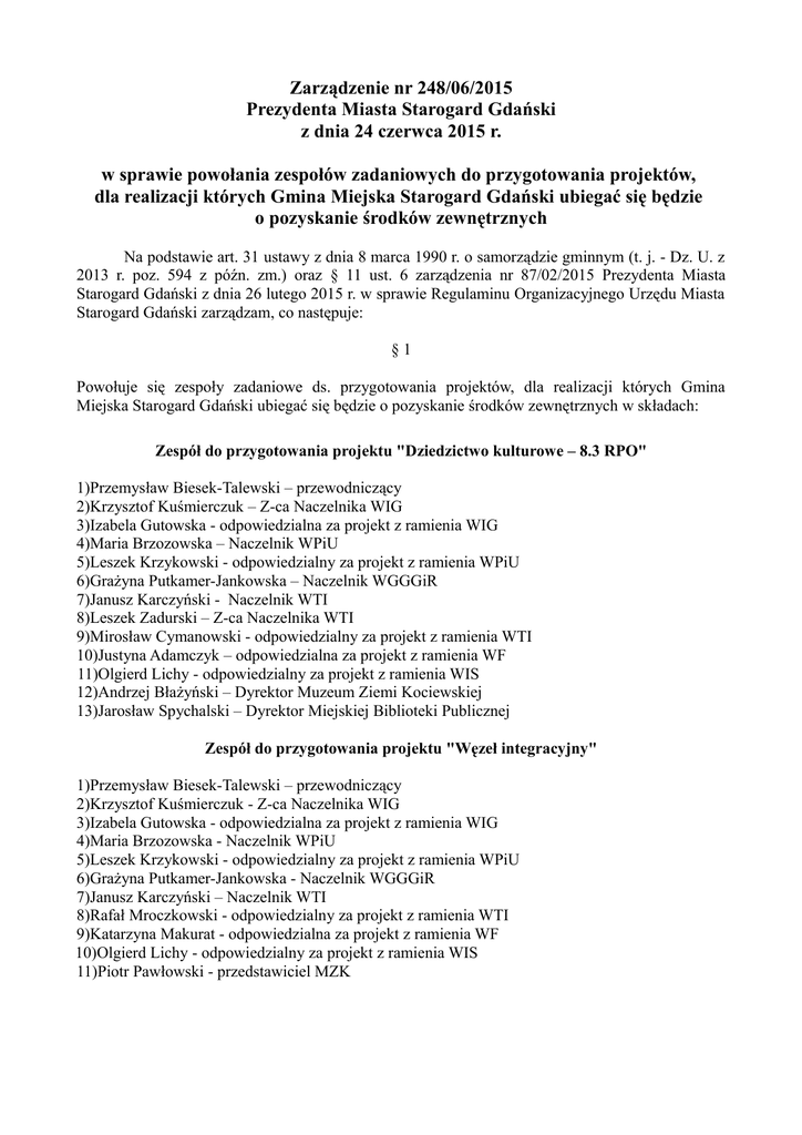 Zarządzenie nr 248/06/2015 Prezydenta Miasta Starogard Gdański z dnia 24 czerwca 2015 r. w sprawie powołania zespołów zadaniowych do przygotowania projektów, dla realizacji których Gmina Miejska Starogard Gdański ubiegać się będzie o pozyskanie środków zewnętrznych Na podstawie art. 31 ustawy z dnia 8 marca 1990 r. o samorządzie gminnym (t. j. - Dz. U. z 2013 r. poz. 594 z późn. zm.) oraz § 11 ust. 6 zarządzenia nr 87/02/2015 Prezydenta Miasta Starogard Gdański z dnia 26 lutego 2015 r. w sprawie Regulaminu Organizacyjnego Urzędu Miasta Starogard Gdański zarządzam, co następuje: §1 Powołuje się zespoły zadaniowe ds. przygotowania projektów, dla realizacji których Gmina Miejska Starogard Gdański ubiegać się będzie o pozyskanie środków zewnętrznych w składach: Zespół do przygotowania projektu "Dziedzictwo kulturowe – 8.3 RPO" 1)Przemysław Biesek-Talewski – przewodniczący 2)Krzysztof Kuśmierczuk – Z-ca Naczelnika WIG 3)Izabela Gutowska - odpowiedzialna za projekt z ramienia WIG 4)Maria Brzozowska – Naczelnik WPiU 5)Leszek Krzykowski - odpowiedzialny za projekt z ramienia WPiU 6)Grażyna Putkamer-Jankowska – Naczelnik WGGGiR 7)Janusz Karczyński - Naczelnik WTI 8)Leszek Zadurski – Z-ca Naczelnika WTI 9)Mirosław Cymanowski - odpowiedzialny za projekt z ramienia WTI 10)Justyna Adamczyk – odpowiedzialna za projekt z ramienia WF 11)Olgierd Lichy - odpowiedzialny za projekt z ramienia WIS 12)Andrzej Błażyński – Dyrektor Muzeum Ziemi Kociewskiej 13)Jarosław Spychalski – Dyrektor Miejskiej Biblioteki Publicznej Zespół do przygotowania projektu "Węzeł integracyjny" 1)Przemysław Biesek-Talewski – przewodniczący 2)Krzysztof Kuśmierczuk - Z-ca Naczelnika WIG 3)Izabela Gutowska - odpowiedzialna za projekt z ramienia WIG 4)Maria Brzozowska - Naczelnik WPiU 5)Leszek Krzykowski - odpowiedzialny za projekt z ramienia WPiU 6)Grażyna Putkamer-Jankowska - Naczelnik WGGGiR 7)Janusz Karczyński – Naczelnik WTI 8)Rafał Mroczkowski - odpowiedzialny za projekt z ramienia WTI 9)Katarzyna Makurat - odpowiedzialna za projekt z ramienia WF 10)Olgierd Lichy - odpowiedzialny za projekt z ramienia WIS 11)Piotr Pawłowski - przedstawiciel MZK Zespół do przygotowania projektu "Wierzyca" 1)Przemysław Biesek-Talewski – przewodniczący 2)Krzysztof Kuśmierczuk - Z-ca Naczelnika WIG 3)Izabela Gutowska - odpowiedzialna za projekt z ramienia WIG 4)Maria Brzozowska - Naczelnik WPiU 5)Joanna Kurkowska - odpowiedzialna za projekt z ramienia WPiU 6)Grażyna Putkamer-Jankowska - Naczelnik WGGGiR 7)Janusz Karczyński - Naczelnik WTI 8)Rafał Mroczkowski - odpowiedzialny za projekt z ramienia WTI 9)Katarzyna Makurat - odpowiedzialna za projekt z ramienia WF 10)Anna Gracz - odpowiedzialny za projekt z ramienia WIS 11)Maria Malinowska – przedstawicielka OSiR Zespół do przygotowania projektu "Termomodernizacja" 1)Przemysław Biesek-Talewski – przewodniczący 2)Krzysztof Kuśmierczuk - Z-ca Naczelnika WIG 3)Magdalena Szwarz - odpowiedzialna za projekt z ramienia WIG 4)Janusz Karczyński - Naczelnik WTI 5)Anna Prądzyńska - odpowiedzialna za projekt z ramienia WTI 6)Alicja Dunajska - odpowiedzialna za projekt z ramienia WF 7)Adrian Wysocki - odpowiedzialny za projekt z ramienia WIS 8)Adam Przeniewski - przedstawiciel PSP 1 9)Dariusz Borys - przedstawiciel PG 1 10)Danuta Kusz - przedstawiciel PSP 4 11)Henryk Schwirtz - przedstawiciel ZSP Zespół do przygotowania projektu "Wody opadowe" 1)Przemysław Biesek-Talewski – przewodniczący 2)Krzysztof Kuśmierczuk -Z-ca Naczelnika WIG 3)Izabela Gutowska - odpowiedzialna za projekt z ramienia WIG 4)Janusz Karczyński - Naczelnik WTI 5)Marcin Szamocki - odpowiedzialny za projekt z ramienia WTI 6)Danuta Czaplińska - odpowiedzialna za projekt z ramienia WF 7)Anna Więckiewicz - odpowiedzialna za projekt z ramienia WIS 8)Czesław Cichocki - odpowiedzialny za projekt z ramienia WGGGiR Zespół do przygotowania projektu "Budownictwo mieszkaniowe" 1)Przemysław Biesek-Talewski – przewodniczący 2)Emilia Neumann - Kierownik RL 3)Tadeusz Błędzki – Naczelnik WIG 4)Jarosław Fryszka - odpowiedzialny za projekt z ramienia WIG 5)Janusz Karczyński - Naczelnik WTI 6)Mirosław Cymanowski - odpowiedzialny za projekt z ramienia WTI 7)Alicja Dunajska - odpowiedzialna za projekt z ramienia WF 8)Grażyna Putkamer-Jankowska - Naczelnik WGGGiR 9)Anna Zagłoba-Góralska - odpowiedzialna za projekt z ramienia WIS 10)Bożena Ćwiklińska - przedstawiciel TBS §2 Do zadań zespołów zadaniowych należy w szczególności: 1)określenie zakresu projektu, 2)przygotowanie niezbędnej dokumentacji (program funkcjonalno-użytkowy, dokumentacja techniczna, studium wykonalności itp.) 3)współpraca z partnerami projektu, 4)przygotowanie specyfikacji istotnych warunków zamówienia i innych dokumentów przetargowych na wykonanie poszczególnych opracowań w ramach projektu, 5)opracowanie planu promocji projektu, 6)opracowanie preliminarza finansowego projektu w korelacji z budżetem gminy, 7)przygotowanie niezbędnych dokumentów aplikacyjnych o środki zewnętrzne, 8)bieżąca współpraca wszystkich członków zespołu zadaniowego. §3 Zobowiązuje sie wszystkich pracowników Urzędu Miasta i jednostek organizacyjnych Gminy Miejskiej Starogard Gdański do udzielania - w ramach zkresów obowiązków poszczególnych komórek - pomocy zespołom zadaniowym w realizacji ich zadań. §4 Wykonanie zarządzenie powierza sie Zastępcy Prezydenta Miasta do spraw TechnicznoInwestycyjnych. §5 Zarządzenie wchodzi w życie z dniem podpisania.