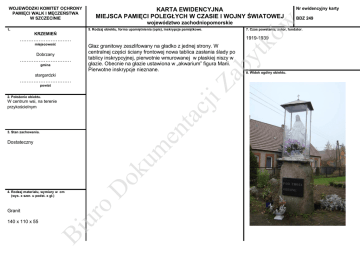 KARTA EWIDENCYJNA MIEJSCA PAMIĘCI POLEGŁYCH W CZASIE I WOJNY ŚWIATOWEJ KRZEMIEŃ 1919-1939 ………………………… Dobrzany ………………………… gmina Głaz granitowy zeszlifowany na gładko z jednej strony. W centralnej części ściany frontowej nowa tablica zasłania ślady po tablicy inskrypcyjnej, pierwotnie wmurowanej w płaskiej niszy w głazie. Obecnie na głazie ustawiona w „akwarium” figura Marii. Pierwotne inskrypcje nieznane. ac ji Za b miejscowość stargardzki ………………………… powiat 2. Położenie obiektu. en t W centrum wsi, na terenie przykościelnym 3. Stan zachowania. 140 x 110 x 55 Bi ur Granit o 4. Rodzaj materiału, wymiary w cm (wys. x szer. u podst. x gł.) D ok um Dostateczny Nr ewidencyjny karty BDZ 249 7. Czas powstania, autor, fundator. kó 5. Rodzaj obiektu, forma upamiętnienia (opis), inskrypcje pamiątkowe. 1. w województwo zachodniopomorskie yt WOJEWÓDZKI KOMITET OCHRONY PAMIĘCI WALK I MĘCZEŃSTWA W SZCZECINIE 8. Widok ogólny obiektu. 2 Bi ur o D ok 1 um en t ac ji Za b yt kó w 9. Zdjęcia uzupełniające. 3 1. Widok od tyłu 2. Nowa tablica 3. Pomnik w 2002 13. Uwagi, uzupełnienia. 10. Dane historyczne. 12. Bibliografia i źródła. 11. Lokalizacja obiektu, plan sytuacyjny. ac ji Za b yt kó w W 1905 w Krzemieniu (niem. Kremmin) mieszkało 368 osób, w tym 194 płci męskiej. en t Marcin Majewski, Gmina Dobrzany. Zabytki powiatu stargardzkiego, Stargard 2013 um Andrzej Bierca, Miejsca i formy upamiętnienia żołnierzy poległych w I wojnie światowej w Stargardzie i okolicach, [w:] Stargardia, T.II, Stargard, 2002, s.223-238 D ok Gemeindelexikon fűr die Pommern, Berlin 1908 14. Data założenia karty. 2002, aktualizacja 12.2014 15. Autor karty (opis i zdjęcia). Kamila Wójcik, Lidia Walasek Aktualizacja: Anna Bartczak Agnieszka Osiak Bi ur o 16. Miejsce przechowywania dokumentacji Messtischblatt 1929, nr 2659 Biuro Dokumentacji Zabytków w Szczecinie