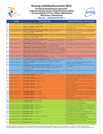 Poznaj wielokulturowość Woli III edycja bezpłatnych spacerów organizowanych przez Urząd Dzielnicy Wola i Przewodników PTTK z Klubu Miłośników Warszawy i Mazowsza Marzec – październik 2011 TERMIN TEMAT SPACERU MIEJSCE SPOTKANIA I PRZEWODNICY 1. 19 marca godz.11.00 WOLA W FILMIE I LITERATURZE – Wolskie klimaty w utworach Wiecha. Kościół św. Wawrzyńca, ul. Wolska 140 / Barbara Kujawa, Ewa Kominek 2. 26 marca godz.11.00 WOLA W FILMIE I LITERATURZE – Wola w książce i filmie Adama Bahdaja „Do przerwy 0:1”. ul. Okopowa róg ul. Leszno / Olga Brzozowska, Kamila Zarębska 3. 4. 2 kwietnia godz.11.00 9 kwietnia godz.11.00 NIEZWYKLI LUDZIE ZWIĄZANI Z WOLĄ – Wola Janusza Korczaka. WOLA W FILMIE I LITERATURZE – Wola w twórczości J. Hena i P. Gojawiczyńskiej. ul. Wolska róg ul. Karolkowej / Ewa Andrzejewska Al. Solidarności 90, przed Urzędem Dzielnicy Wola / Ewa Kierszys, Ewa Słęcka 5. 6. 16 kwietnia godz.11.00 30 kwietnia godz.11.00 7. 7 maja godz.11.00 8. 14 maja godz.11.00 9. 21 maja godz.11.00 NIEZWYKLI LUDZIE ZWIĄZANI Z WOLĄ – Tropami rodziny Szlenkierów. ul. Dzielna 91 / Barbara Kujawa, Jacek Kowalewski Rondo ONZ pod budynkiem Ilmetu, al. Jana Pawła II WOLA W FILMIE I LITERATURZE – Gdzie był ten dom – gdzie mieszkał 15 / Jacek Kowalewski, Ewa Słęcka 40-latek i inni znani ludzie. ul. Towarowa róg Chłodnej / Ewa Kierszys, NIEZWYKLI LUDZIE ZWIĄZANI Z WOLĄ – Opowieść o ulicy Chłodnej Ewa Słęcka i jej mieszkańcach – A. Czerniakowie, ks. J. Popiełuszce, St. Jachowiczu, J. Korczaku. H. Ordonównie. NIEZWYKLI LUDZIE ZWIĄZANI Z WOLĄ – Od Grzybowskiej do Górczew- ul. Towarowa róg ul. Grzybowskiej (przy kamieniu skiej – czyli opowieść o K.I. Gałczyńskim, J. Korczaku, Michlerze i jego K.I. Gałczyńskiego) / Ewa Andrzejewska młynie, Józefie Szczepańskim „Ziutku” i rodzinie Wawelbergów. NIEZWYKLI LUDZIE ZWIĄZANI Z WOLĄ – Od Wolskiej do Górczewskiej – ul. Wolska róg ul. Redutowej / Ewa Andrzejewska czyli opowieść o gen. J. Sowińskim, Piotrze Wysockim, por. Pacak-Kuźmirskim, Wiechu, właścicielach Dobrolina, Janie Kryście i poecie Woli – E. Szymańskim. NIEZWYKLI LUDZIE ZWIĄZANI Z WOLĄ – Od Prostej do Krochmalnej – ul. Pereca 21 / Barbara Kujawa, Kamila Zarębska czyli opowieść o Ulrychach, I. L.Perecu, Władysławie Szlengelu, rodzicach Marii Szymanowskiej i J.B. Singerze. NIEZWYKLI LUDZIE ZWIĄZANI Z WOLĄ – Opowieść o K. Kurpińskim, al. Solidarności 90, przed Urzędem Dzielnicy Wola / Ewa Kierszys, Ewa Słęcka W. Bogusławskim, siostrze Faustynie i Bernardo Bellotto. 10. 22 maja godz.11.00 11. 28 maja godz.11.00 12. 4 czerwca godz.11.00 13. 8 czerwca godz.11.00 ARCHITEKTURA POSTINDUSTRIALNA WOLI – Towarzystwo Przemysłowe ul. Bema 65 / Barbara Kujawa Zakładów Mechanicznych „Lilpop, Rau, Loewenstein” i Fabryka Gazu. Pl. Zawiszy przed wejściem do Hotelu Kyriad WOLA XXI WIEKU Od kratownicy do jaja – tajemnice wolskich Prestige / Hanna Dzielińska wieżowców. 14. 11 czerwca godz.11.00 ARCHITEKTURA POSTINDUSTRIALNA WOLI – Warszawska Fabryka Koronek S. Landau i Fabryka Hersza Lebensolda przy ul. Burakowskiej; Towarzystwo Akcyjne Fabryki Garbarskiej Temler i Szwede przy ul. Okopowej 78. ul. Powązkowska róg ul.Okopowej / Ewa Kierszys, Ewa Słęcka 15. 25 czerwca godz.11.00 ul. Waliców 11 / Barbara Kujawa, Ewa Kominek 16. 26 czerwca godz.11.00 ARCHITEKTURA POSTINDUSTRIALNA WOLI – Browar Hermana Junga ul. Waliców 11, Towarzystwo Akcyjne Fabryk Metalowych Norblin, Bracia Buch i T. Werner, ul. Żelazna 51. WOLSKIE OSIEDLA – Czyste 17. 2 lipca godz.11.00 WOLSKIE OSIEDLA – Koło cz. II ul. Obozowa róg ul. Księcia Janusza / Ewa Andrzejewska, Ewa Kierszys 18. 9 lipca godz.11.00 WOLSKIE OSIEDLA – Młynów cz. II ul. Młynarska róg ul. Leszno / Olga Brzozowska, Ewa Kominek 19. 10 lipca godz.11.00 WOLSKIE OSIEDLA – Mirów ul. Jana Pawła II przed Halą Mirowską / Ewa Kierszys, Barbara Kujawa 20. 16 lipca godz.11.00 WOLSKIE OSIEDLA – Ulrychów 21. 23 lipca godz.11.00 22. 30 lipca godz.11.00 23. 6 sierpnia godz.11.00 WOLSKIE OSIEDLA – Powązki WOLSKIE OSIEDLA – Odolany WOLSKIE OSIEDLA – Muranów cz. II ul. Górczewska 124, przed wejściem do Parku Ulrichów (Centrum Wola Park) / Ewa Andrzejewska, Jacek Kowalewski Stare Powązki, Brama św. Honoraty / Barbara Kujawa ul. Kasprzaka róg ul. Grabowskiej / Ewa Andrzejewska ul.Smocza, róg ul. Nowolipki / Jacek Kowalewski, Ewa Kominek 24. 13 sierpnia godz.11.00 WOLSKIE OSIEDLA – Za Żelazną Bramą 25. 14 sierpnia godz.11.00 26. 20 sierpnia godz.11.00 WOLSKIE ULICE – Górczewska PTASIE ULICE – Wronia i Kacza 27. 27 sierpnia godz.11.00 WOLSKIE ULICE – Redutowa Dworzec Zachodni, pętla autobusowa od strony ul. Tunelowej / Ewa Słęcka, Olga Brzozowska ul. Chłodna 3 przed Muzeum Pożarnictwa / Ewa Kierszys, Ewa Słęcka ul. Górczewska róg ul. Młynarskiej / Ewa Andrzejewska ul. Wronia róg ul. Grzybowskiej / Ewa Kierszys, Ewa Andrzejewska ul. Redutowa róg ul. Wolskiej / Ewa Andrzejewska 28. 3 września godz.11.00 WOLSKIE ULICE – Skierniewicka 29. 10 września godz.11.00 WOLSKIE ULICE – Dzielna ul. Karolkowa róg ul. Wolskiej / Olga Brzozowska przed Kościołem św. Augustyna, ul. Nowolipki 18 / Ewa Kierszys, Barbara Kujawa 30. 17 września godz.11.00 WOLSKIE ULICE – Wolska cz. II ul. Wolska róg ul. Płockiej / Olga Brzozowska 31. 24 września godz.11.00 WOLSKIE ULICE – Żytnia Al. Solidarności 90, przed Urzędem Dzielnicy Wola / Ewa Kierszys, Ewa Andrzejewska ul. Okopowa róg ul. Powązkowskiej / Jacek Kowalewski, Olga Brzozowska 32. 1 października godz.11.00 WOLSKIE ULICE – Okopowa i Towarowa 33. 8 października godz.11.00 PTASIE ULICE – Gęsia i Pawia przed Muzeum Więzienia Pawiak, ul. Dzielna 24/26 / Jacek Kowalewski i Ewa Kominek 34. 15 października godz.11.00 WOLSKIE ULICE – Młynarska ul. Wolska róg ul. Młynarskiej / Ewa Andrzejewska, Ewa Kierszys Terminy spacerów mogą ulec zmianie. Daty 